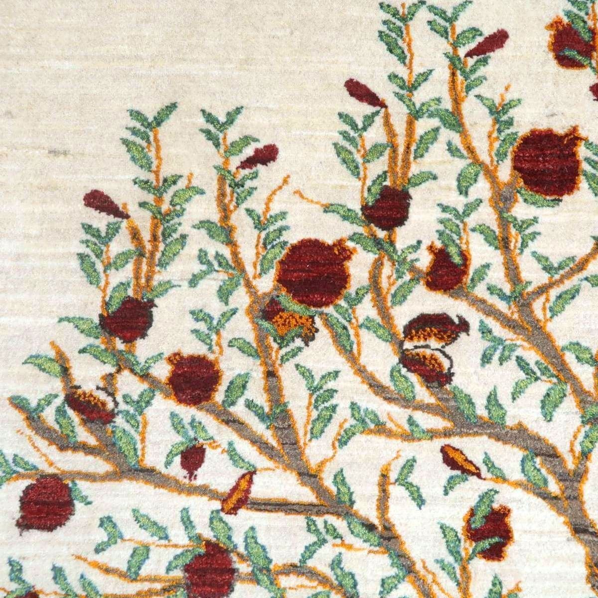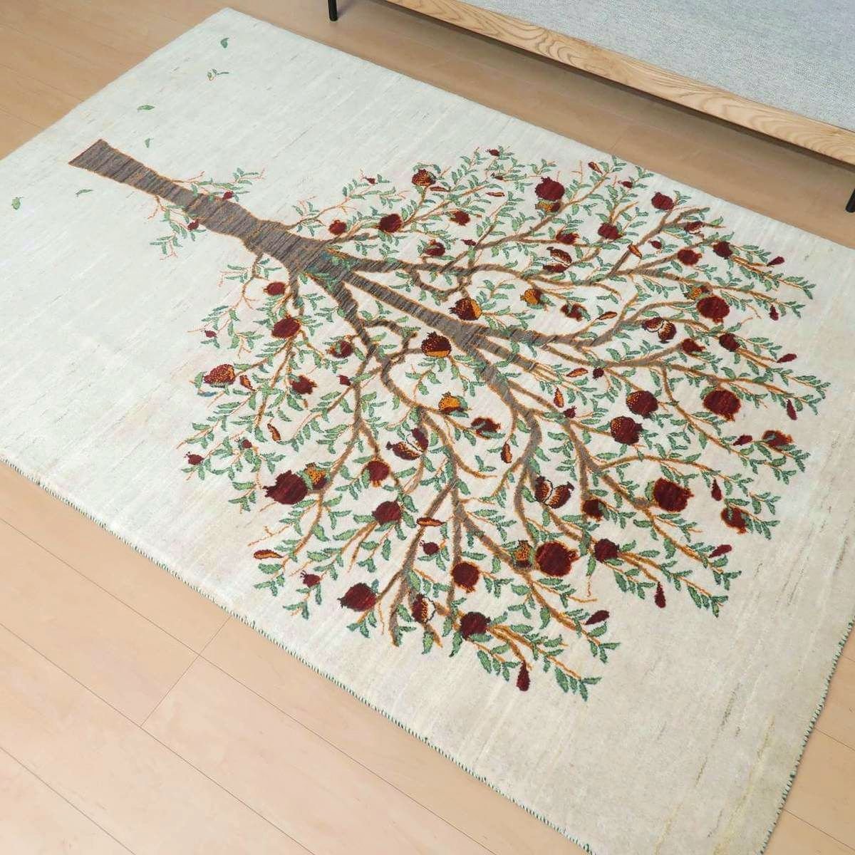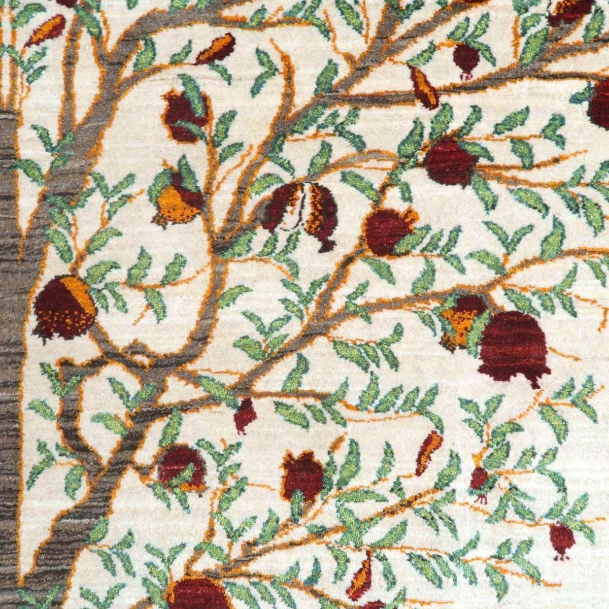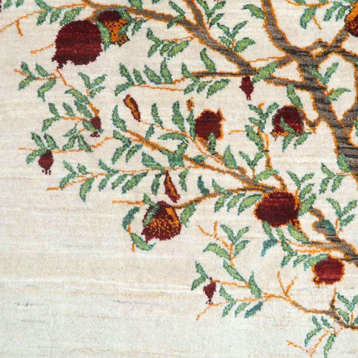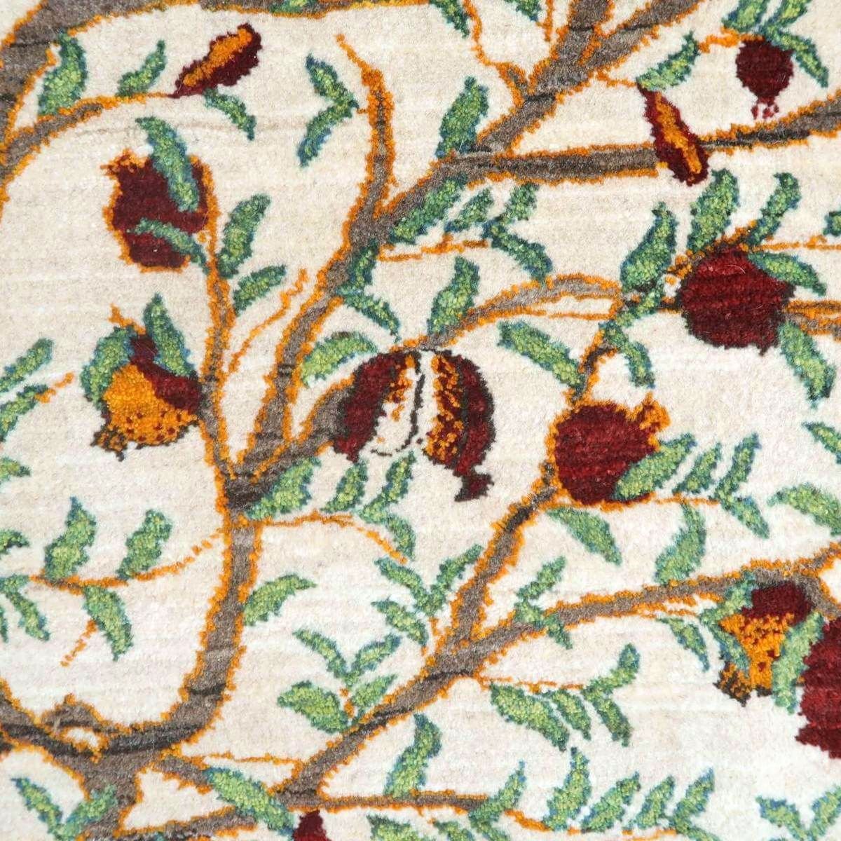 羊の毛色をそのまま活かした無染色の生成りを基調にした敷く場所を選ばない生成りカラー。子孫繁栄のシンボルの大きなザクロは濃いめの赤やブラウン系の落ち着いたトーン、ナチュラルな暖色系なので、敷く場所を選ばず良く似合います。