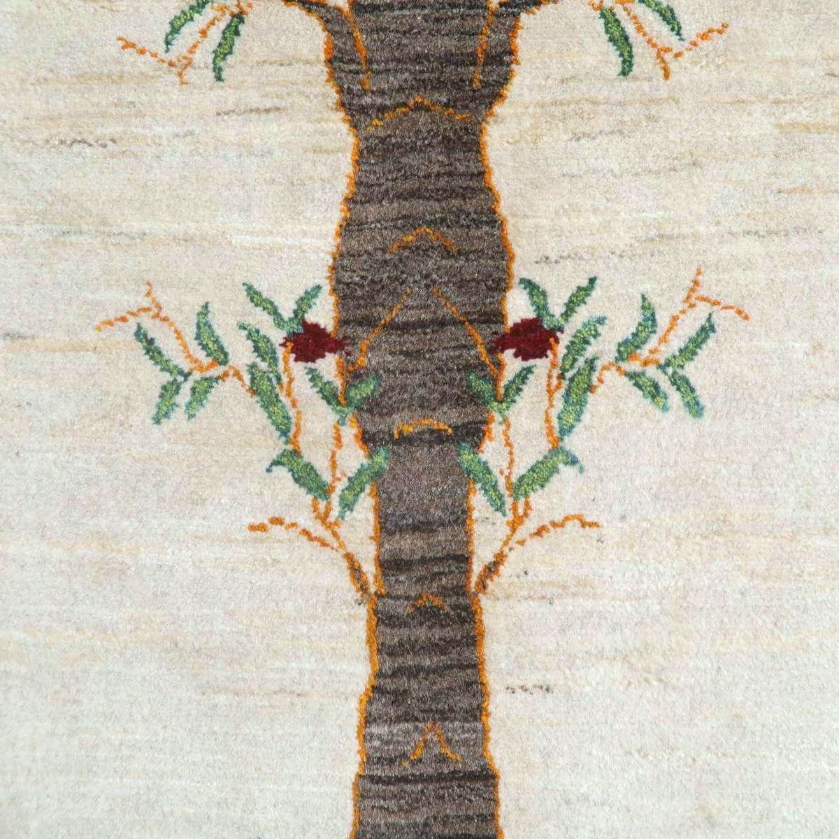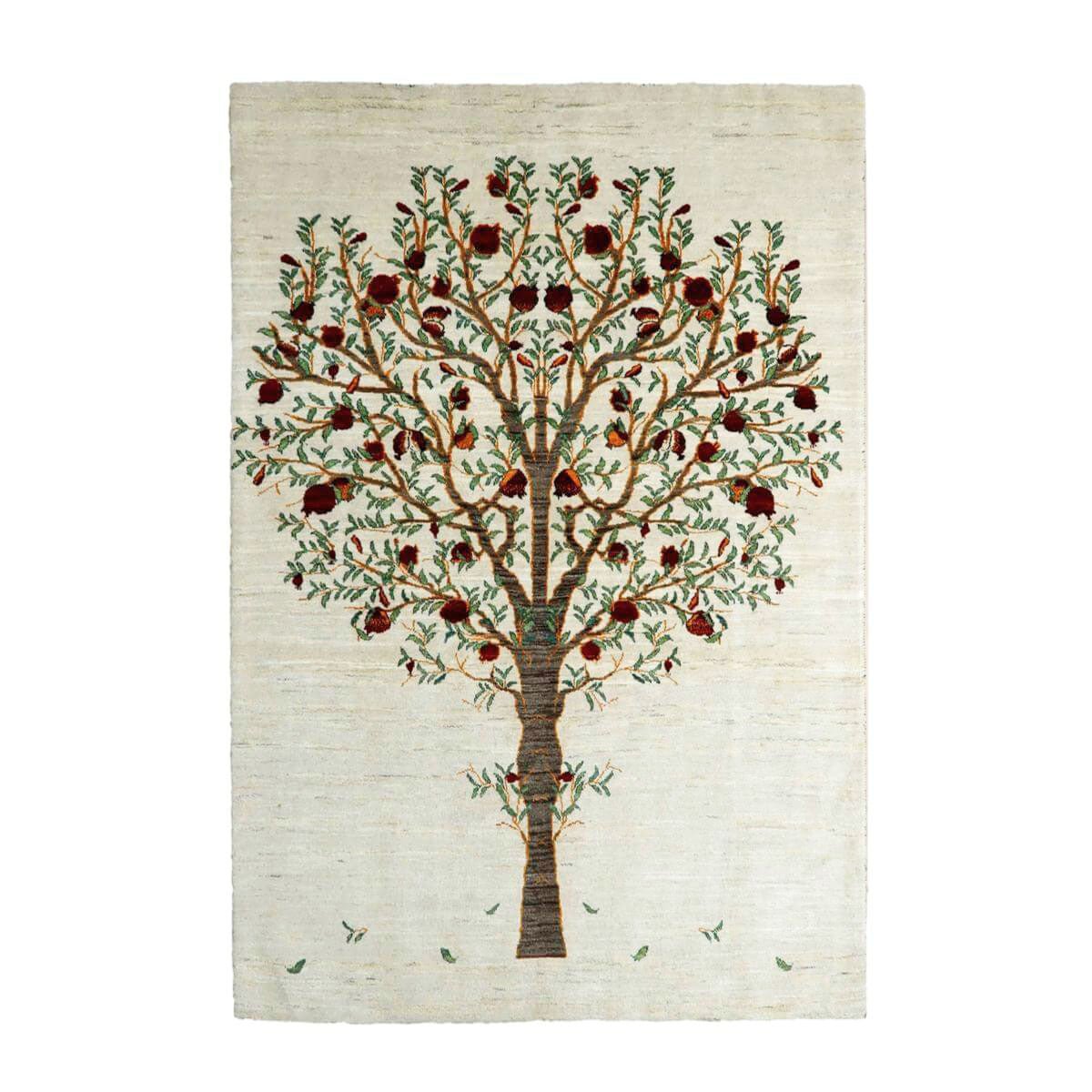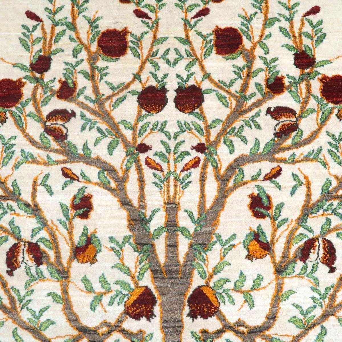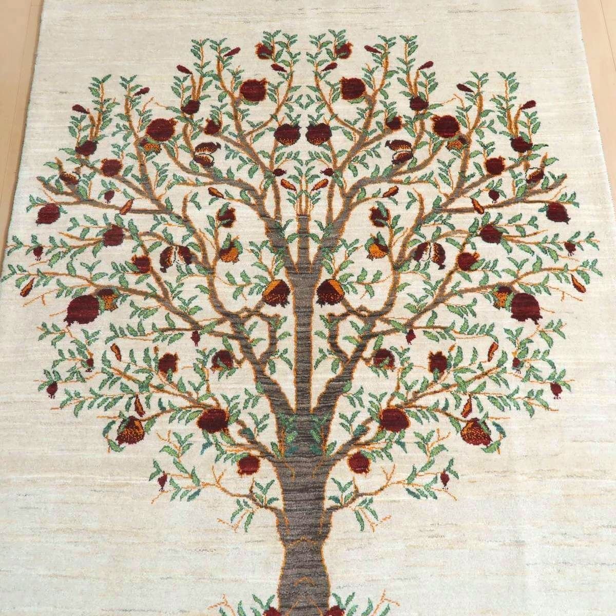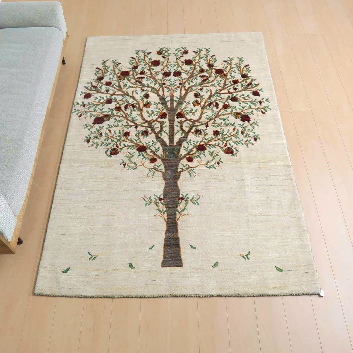 羊の毛色をそのまま活かした無染色の生成りを基調にした敷く場所を選ばない生成りカラー。子孫繁栄のシンボルの大きなザクロは濃いめの赤やブラウン系の落ち着いたトーン、ナチュラルな暖色系なので、敷く場所を選ばず良く似合います。