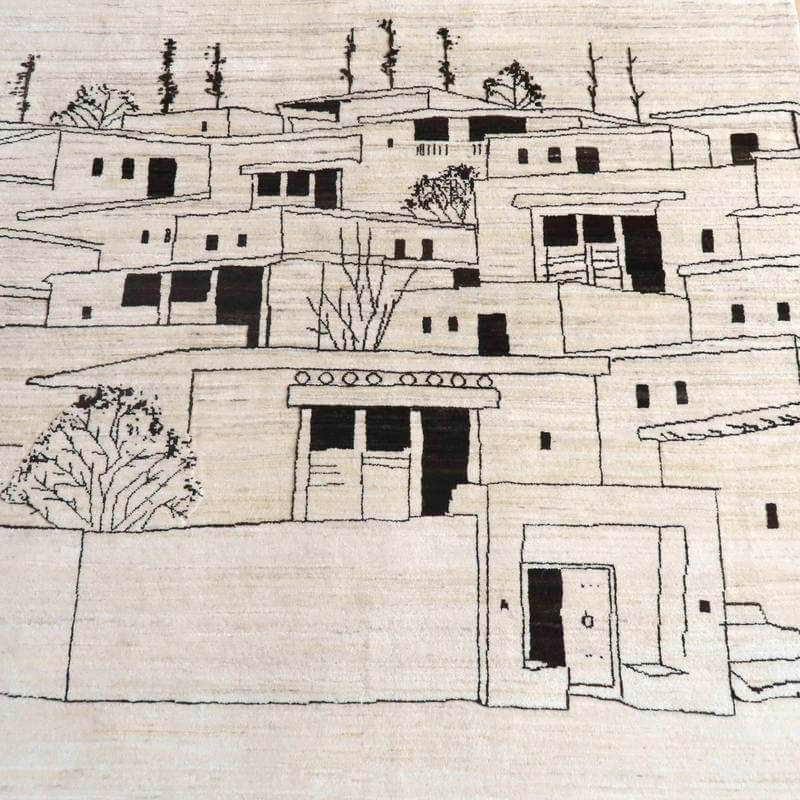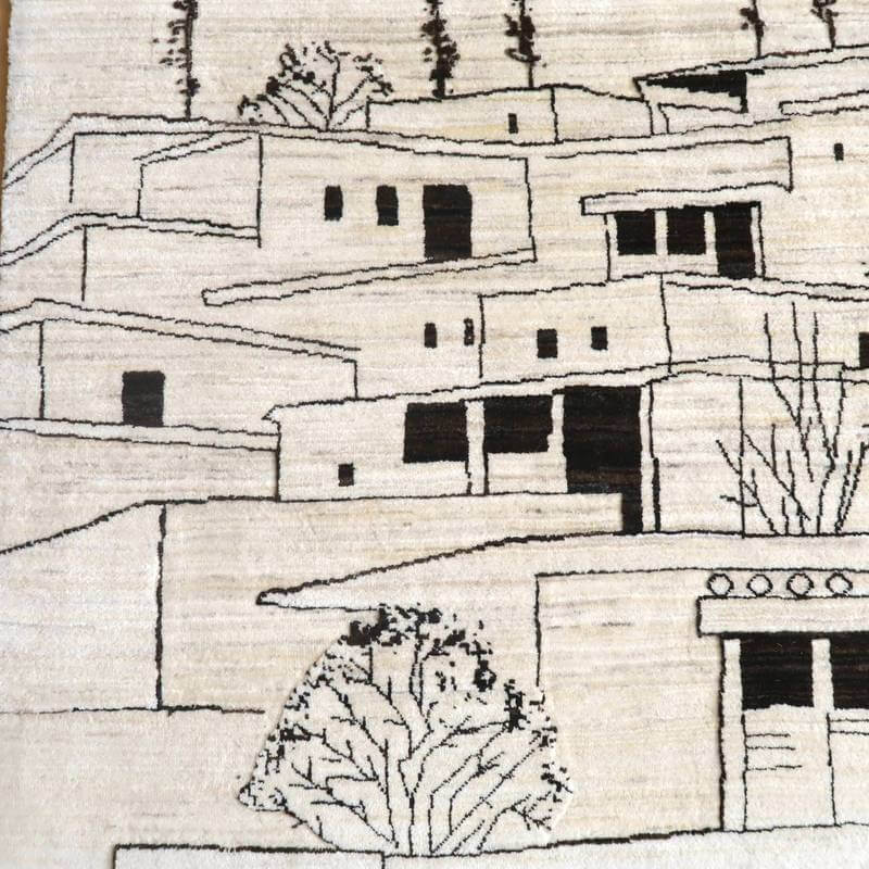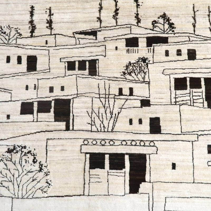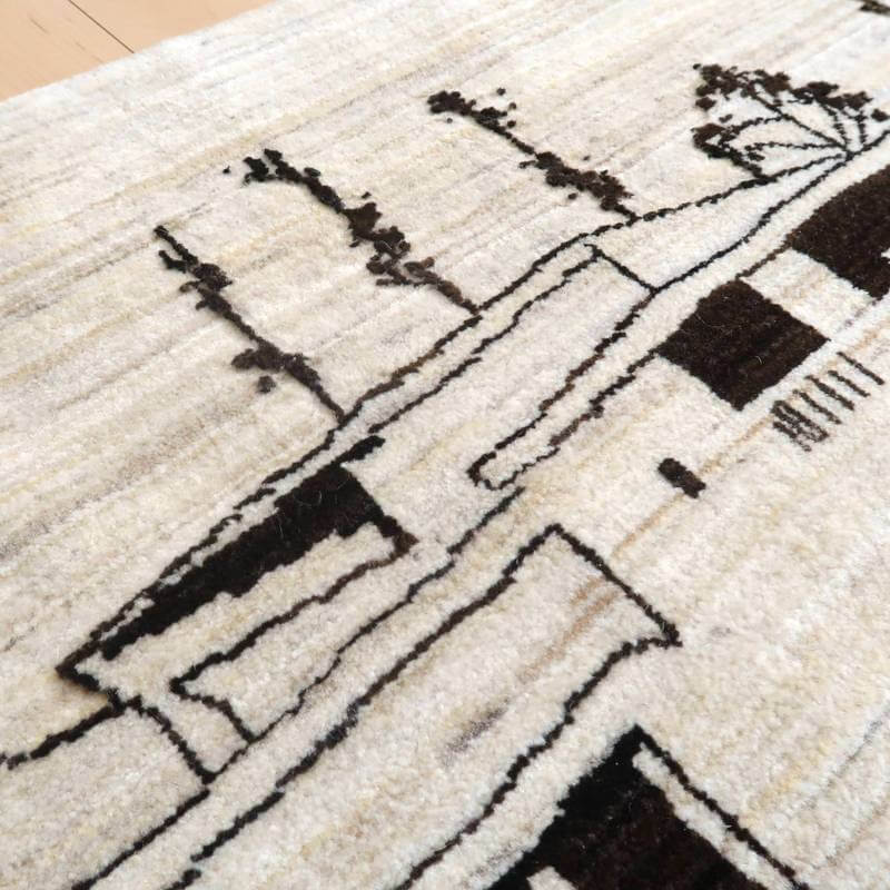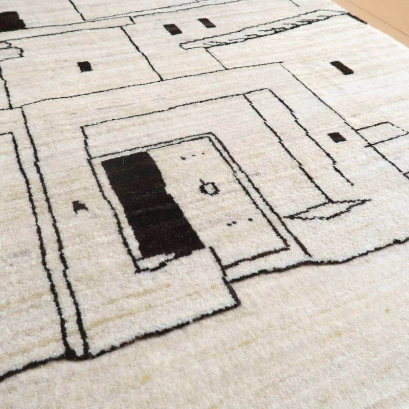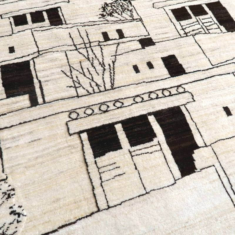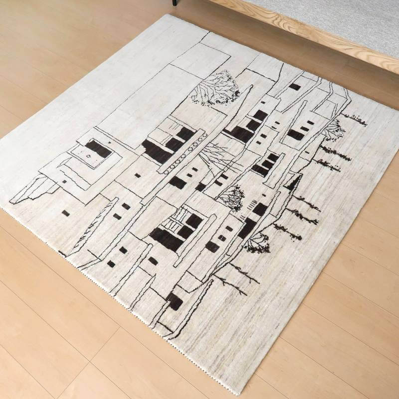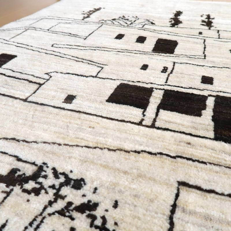 住宅が集まった町の一角をスタイリッシュに描いたモダンなデザイン。全て、刈り取った羊の毛を染めずにそのままの毛色を使用しています。ベースのアイボリーは、無染色のタイプの中では白っぽく明るい色で、そよ風のような気持ちの良いグラデーション。それをキャンバスに、シンプルなこげ茶一色でかっこ良く表現しています。デザインの要所要所には、手ばさみで凹凸の彫りをつけて、柄を際立たせる職人技も盛り込まれ、手仕事の美しさが際立つギャッベです。冬毛の柔らかな最高部位のウールのみを使用して細かく編んだ最上級のソフトな手触り。