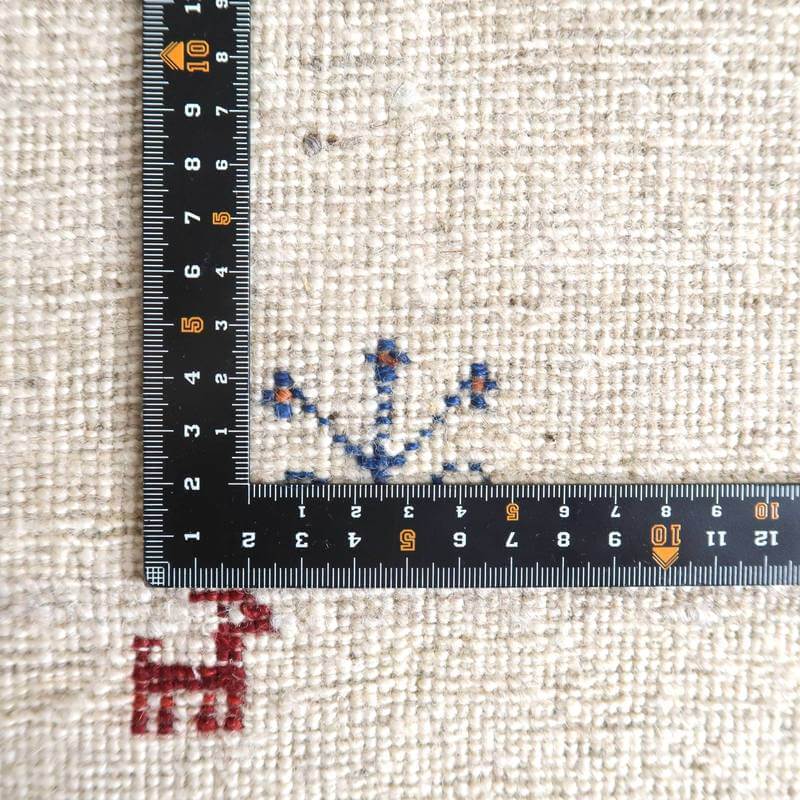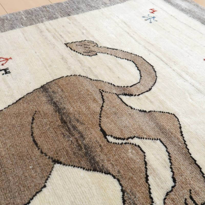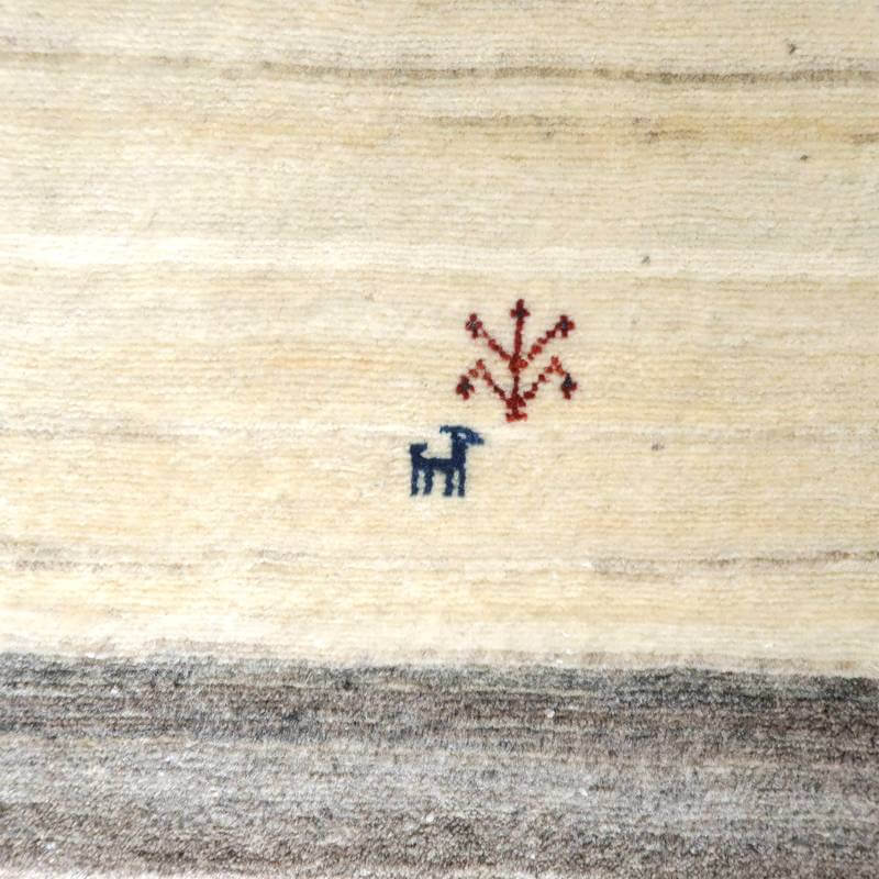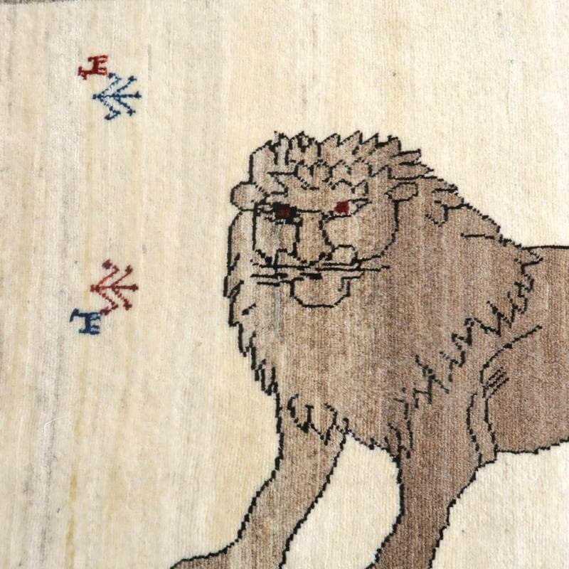 青と赤色部分を除いて、すべて刈り取った羊の毛を染めずにそのままの毛色を上手く活かして仕立てた「ライオン・ギャッベ」、ライオンは、ペルシャでは強い者の象徴です。外枠は薄グレー、ライオンはライトベージュになります。背景色は、無染色のタイプの中では白っぽく、明るいアイボリーで、美しいアブラシ(色むらのグラデーション)がしみじみと味わえます。冬毛の柔らかな最高部位のウールのみを使用して細かく編んだ最上級のソフトな手触り。