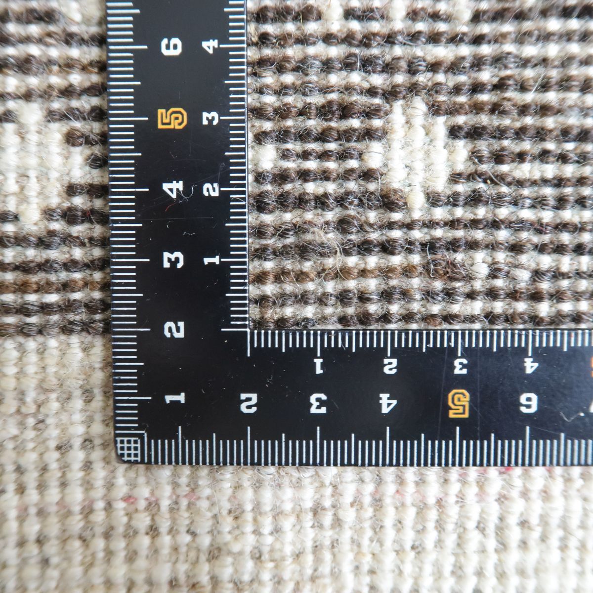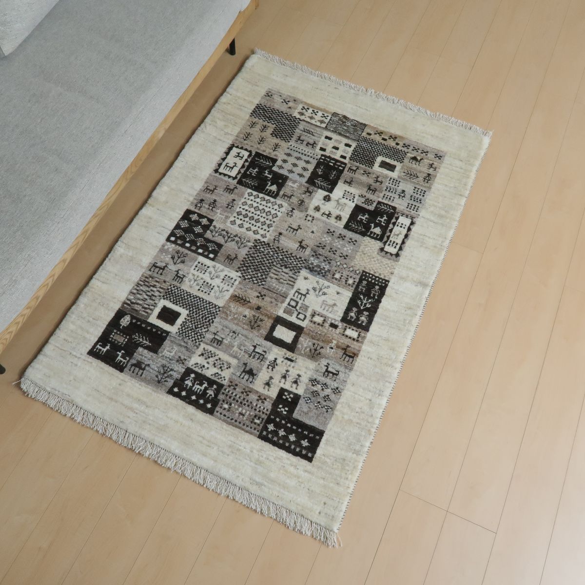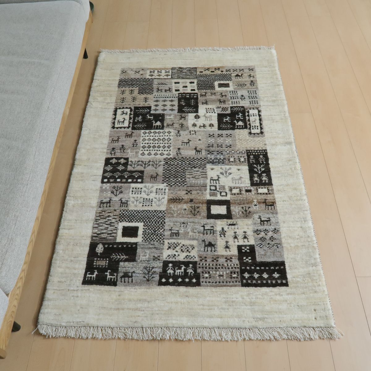 染色していない羊本来の毛色を上手く組み合わせて、図柄を細かく織り上げた生成りの敷く場所を選ばないカラーなので、シックで洗練された印象です。