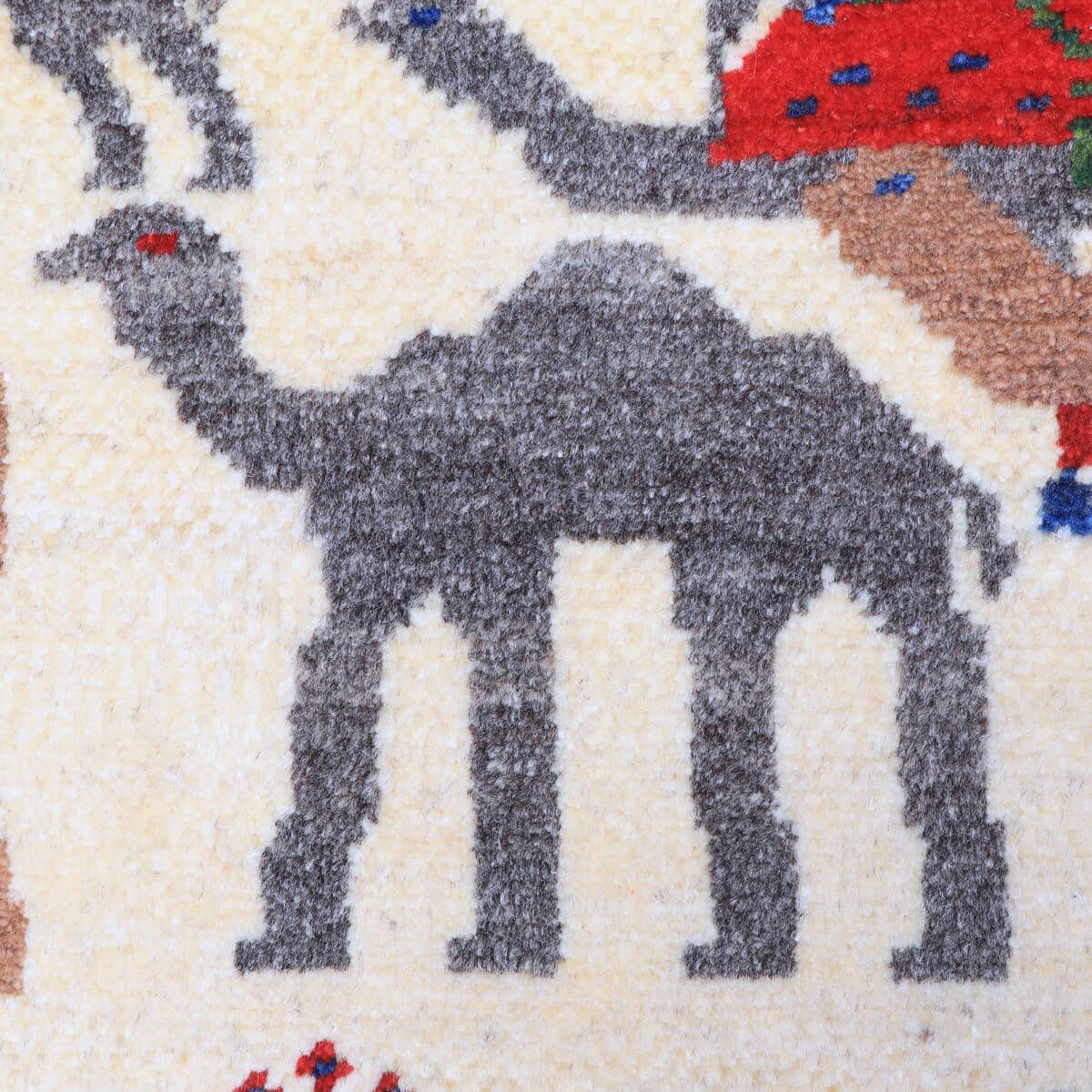 ・丸型の中に、キャラバンやラクダ、遊牧民の旅の様子が細やかに描かれたストーリー性豊かな一枚