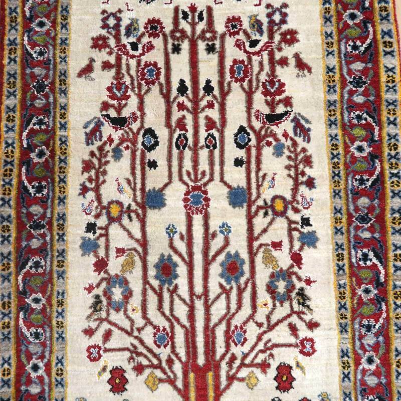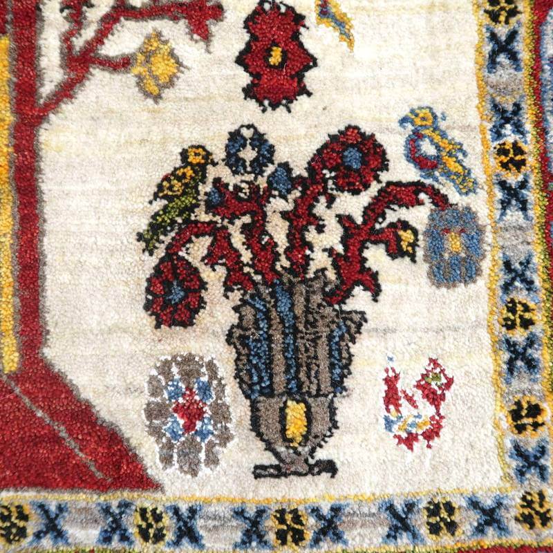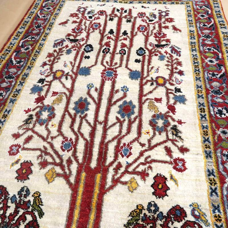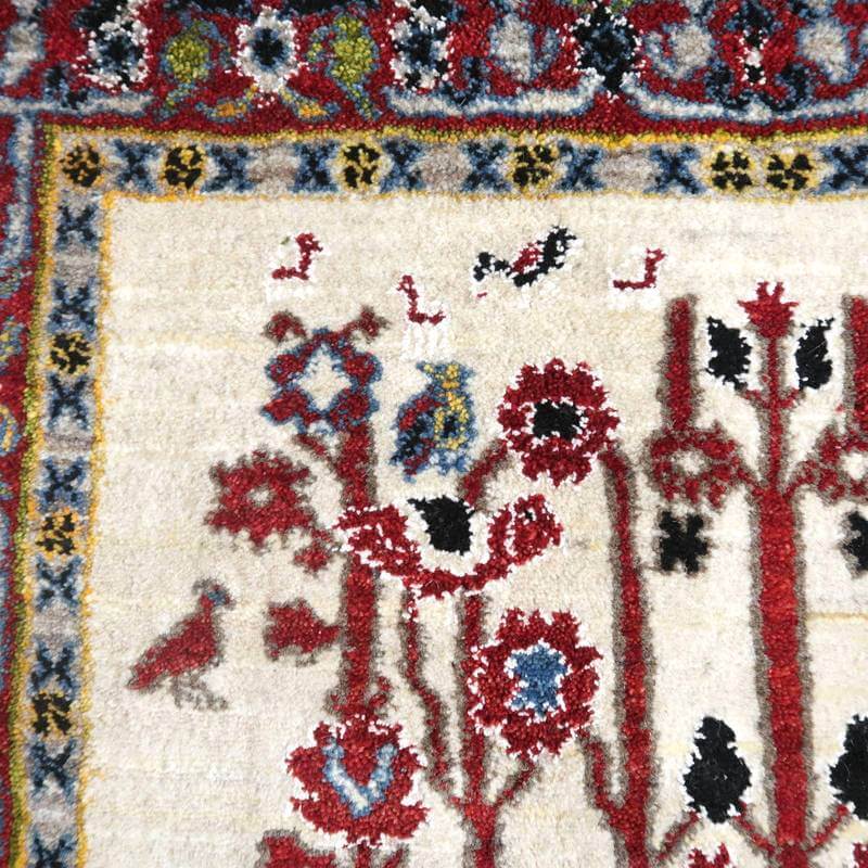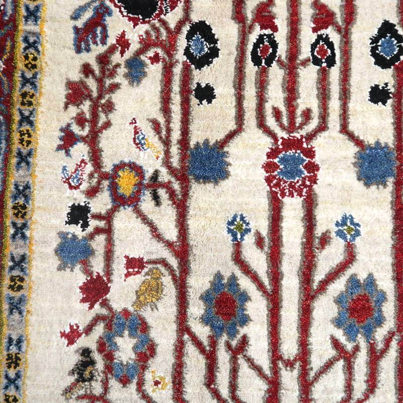 羊の毛色を染めずに使用したナチュラルな生成りを背景に、画面いっぱいに枝を伸ばした生命の木、そして花咲く枝にとまる鳥たち。周囲はルリバフの伝統柄の枠で囲んであり、織るのに手間が掛かっている分だけ、いっそうプレミアムな存在感が感じられる美しいデザインです。房を隠した作りに仕立てた当店オリジナルの特注仕様は、ホコリがたまりにくい分使いやすいと思います。デザインを引き立てる為のコットンシルクも一部(特に白く見える部分)に使われています。