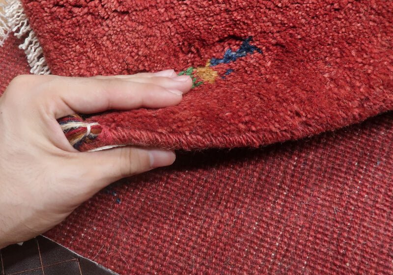 開封すぐの撮影でシワが見える写真があります。照明の違いで色合いが多少違って見えます。また、ギャッベは毛足に向きがあるので、見る方向で、明るかったり暗かったりも見えます。