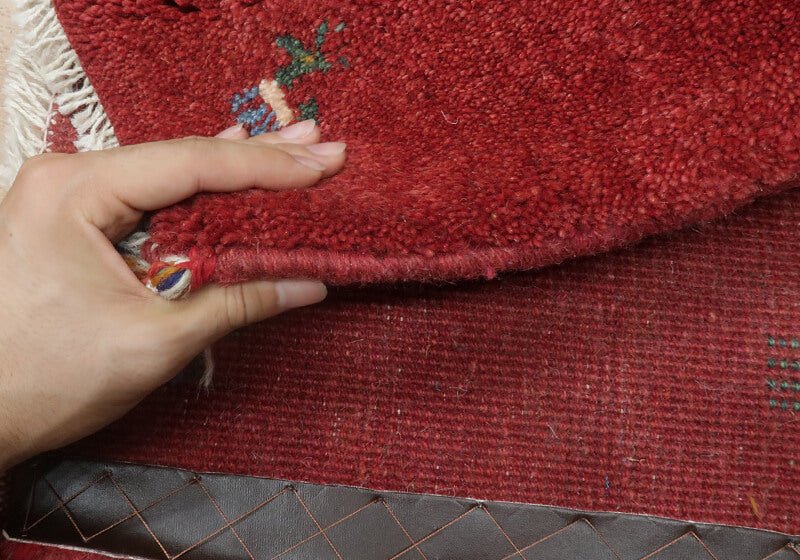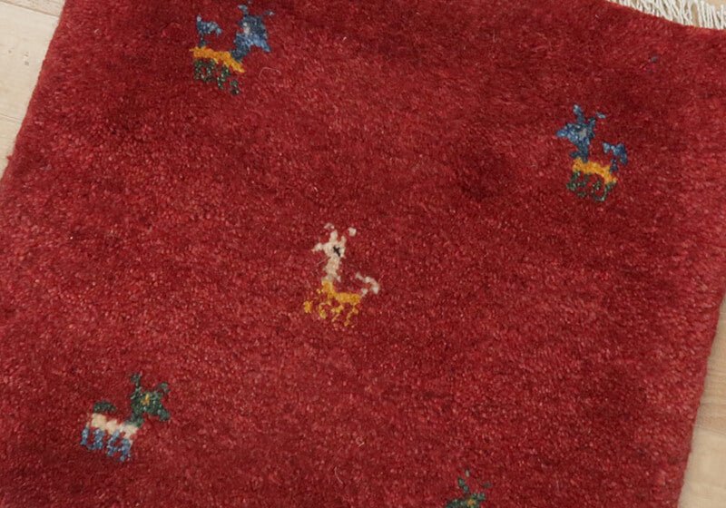 ギャッベのふるさと、イラン・シラーズ地方のふかふかしたギャッベの座布団サイズ。ギャッベは、毛足の間に空気があるのでムレにくく、ウールの程よい弾力性で長時間座っても疲れにくいので意外に快適です。ほんわかした温かみのある雰囲気に気分もなごみます。座布団がわりのほか、車の座席シート、ペット用のマット、壁飾りにも。一枚一枚が自由に織られた手作りです、サイズもご確認ください。