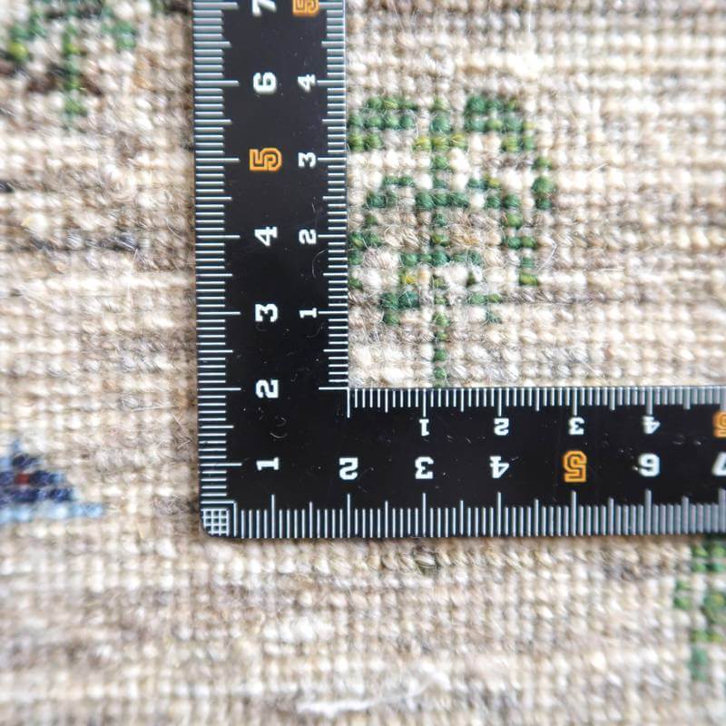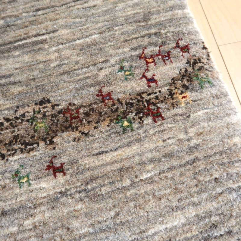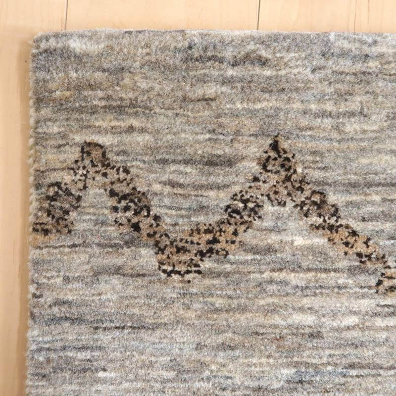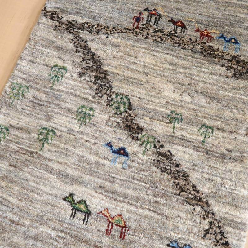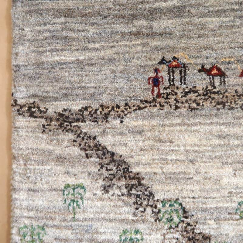 山並みの連なる自然の景色を大きく切り取ったランドスケープデザイン。見る人を一気に風景の中に引き込みます。グレーやベージュ、茶など、刈り取った羊の毛を染めずに活かした無染色の羊毛がベースとなって、天然の風合いが大きく感じられ、アブラシ(色むらのグラデーション)の揺らぎは、山や沙漠の起伏のイメージ。ラクダや山羊、木々が小さいのは細かな織りの証。冬毛の柔らかな最高部位のウールのみを使用して細かく編んだ最上級のソフトな手触りです。