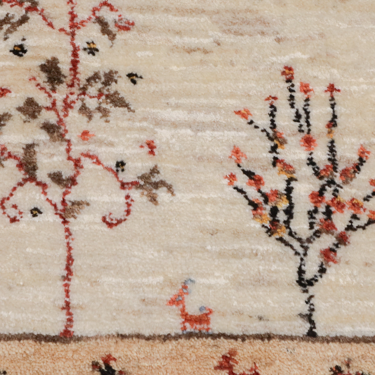 羊の毛色を生かした優しい生成りを基調にした、和み感のあるデザイン。中央には生命の木のモチーフが繊細なタッチで描かれています。カラフルな色使いで描かれた小さな動物たちが、可愛らしいアクセントに。見るたびにほっとした気持ちになれそうな一枚です。