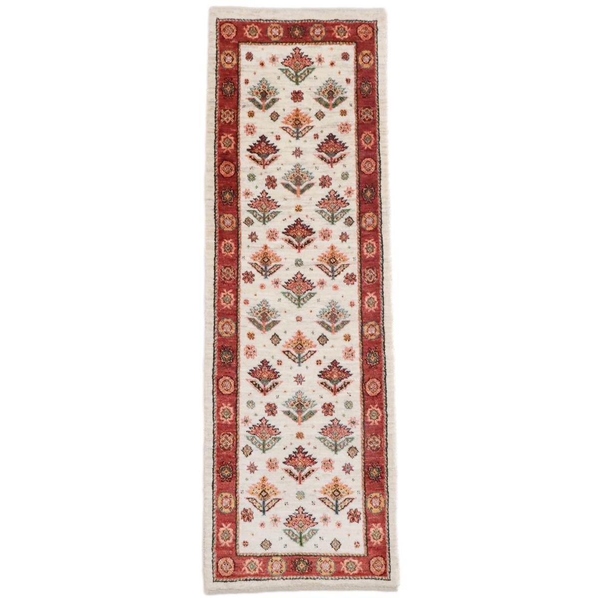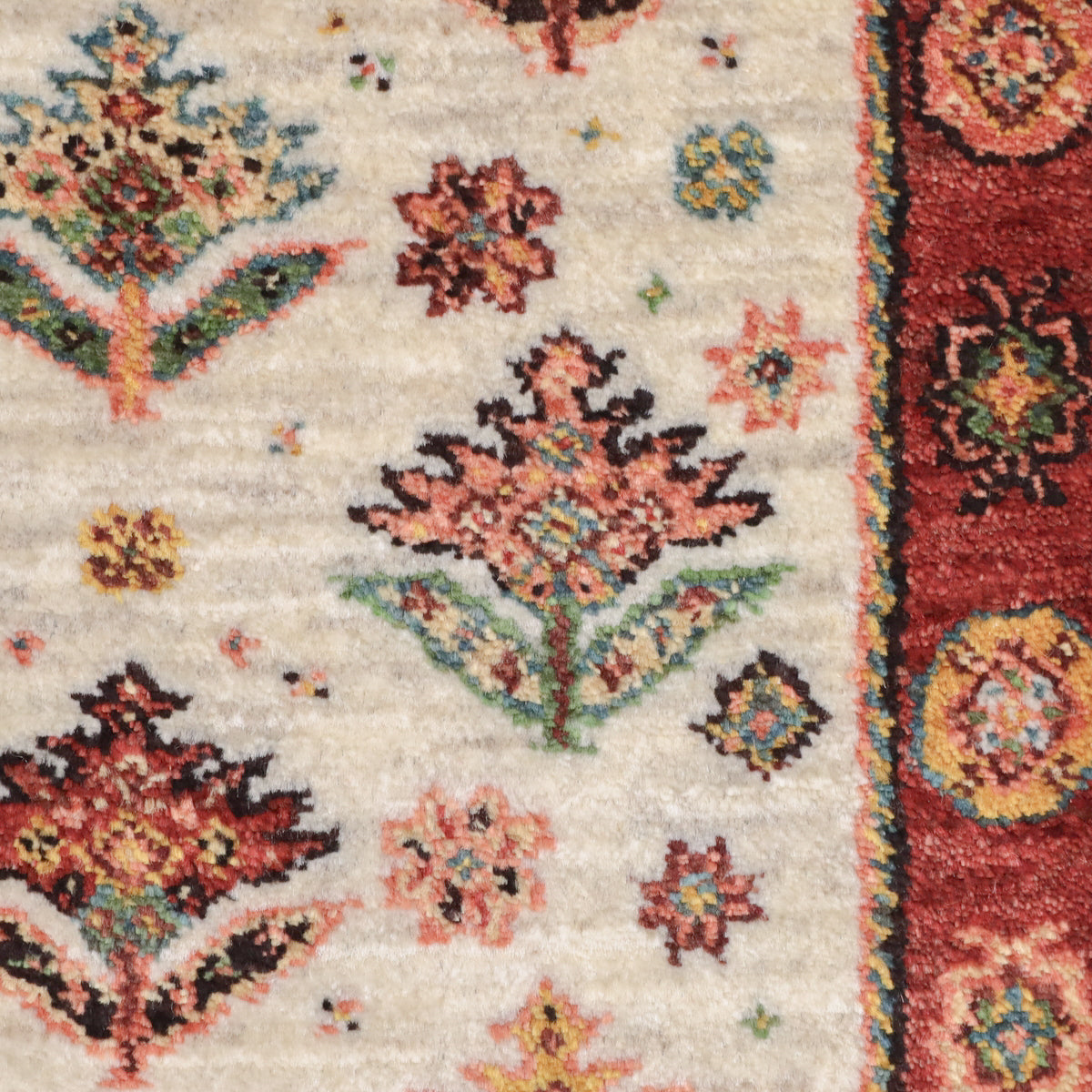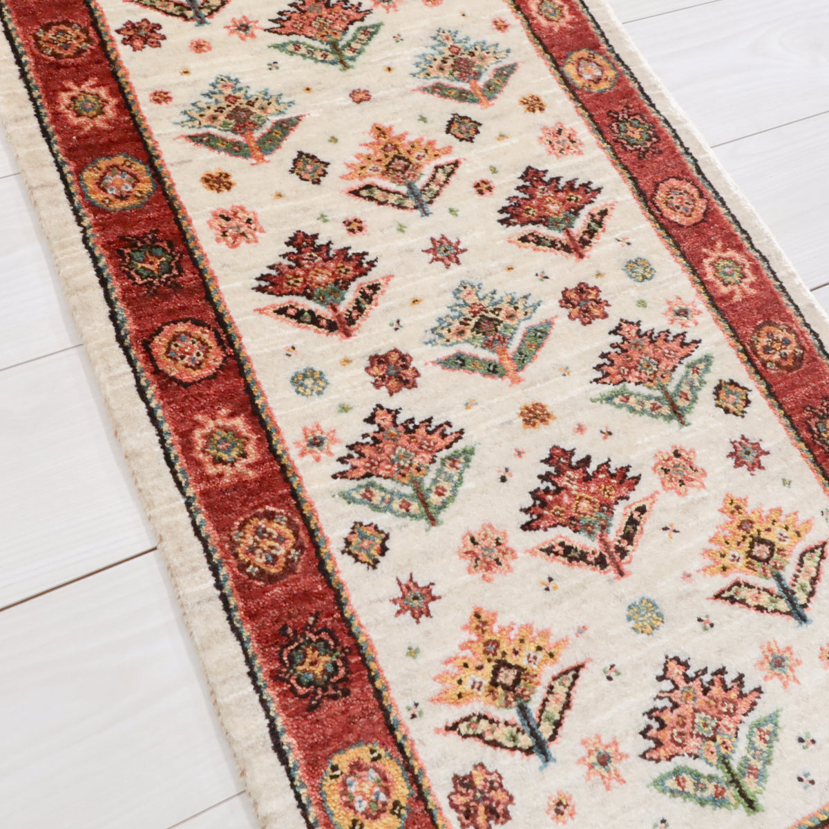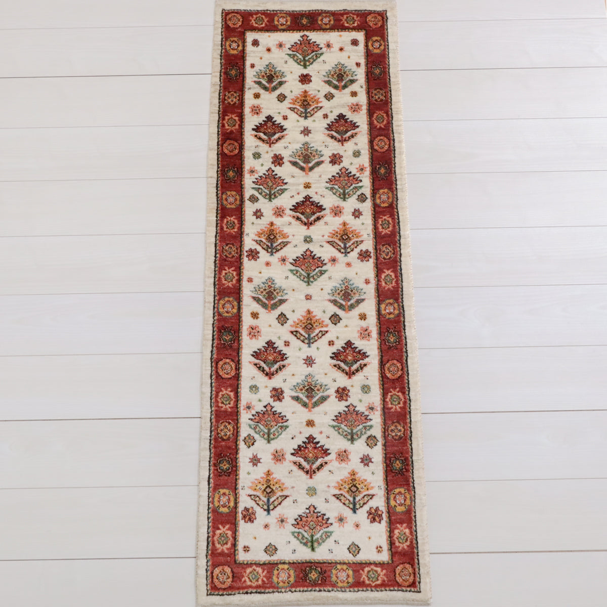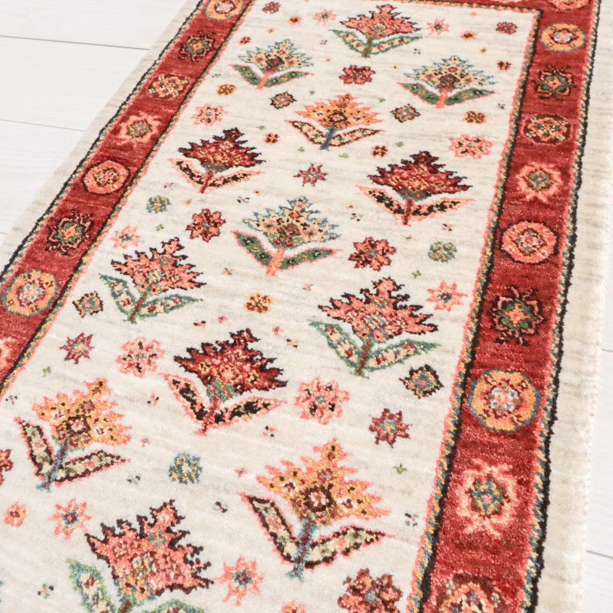 羊の毛色を生かした優しい生成りを基調に、一面にデザイン化された花のモチーフが描かれたギャッベ。周囲の赤いフレームが全体を引き締め、華やかな印象をより際立てています。お部屋に上品な彩りをもたらしてくれる一枚です。