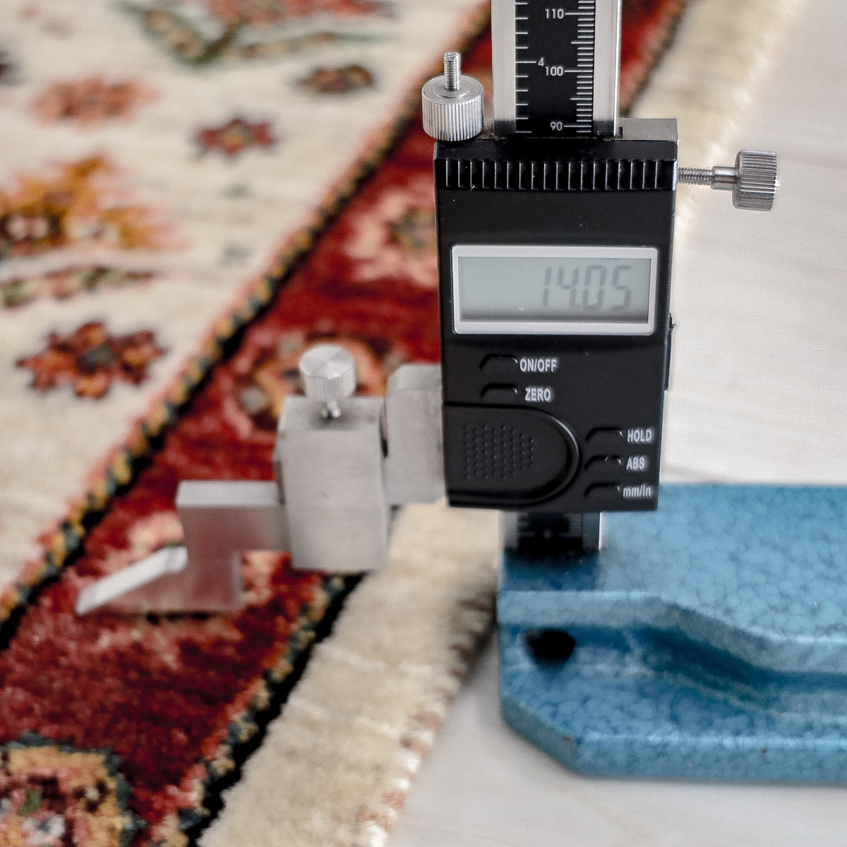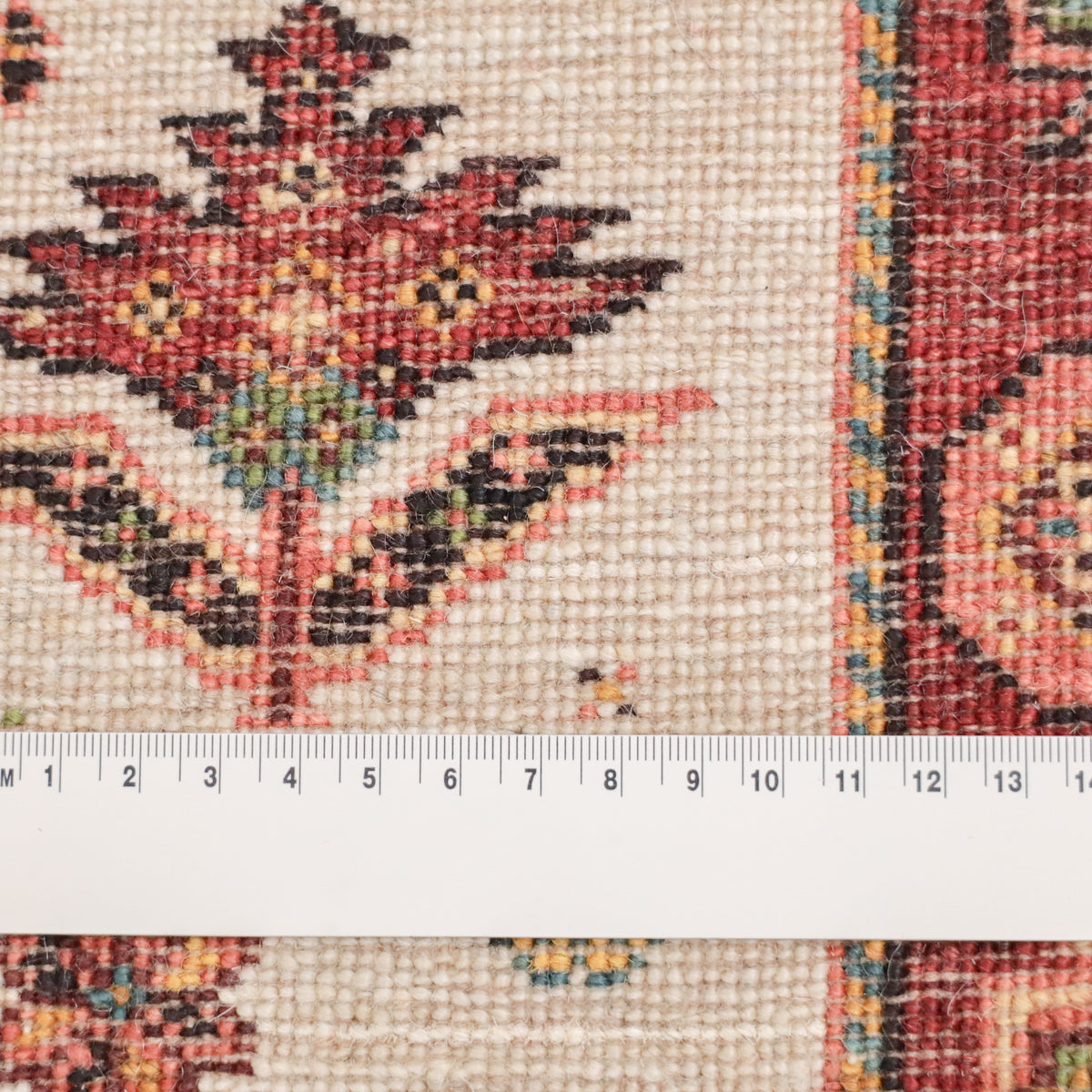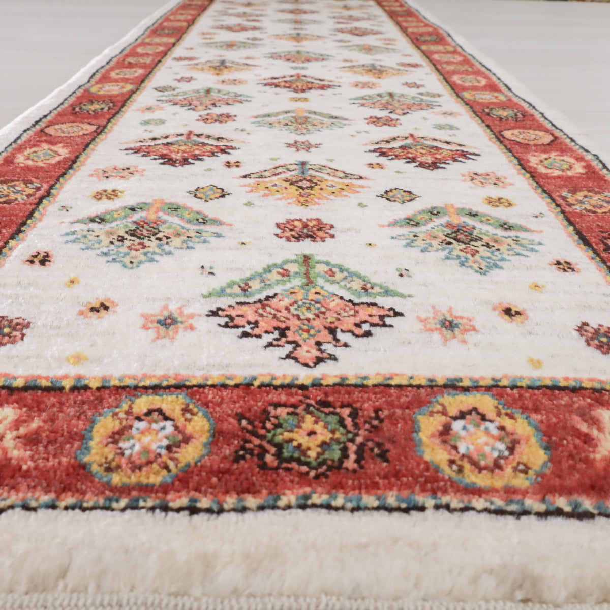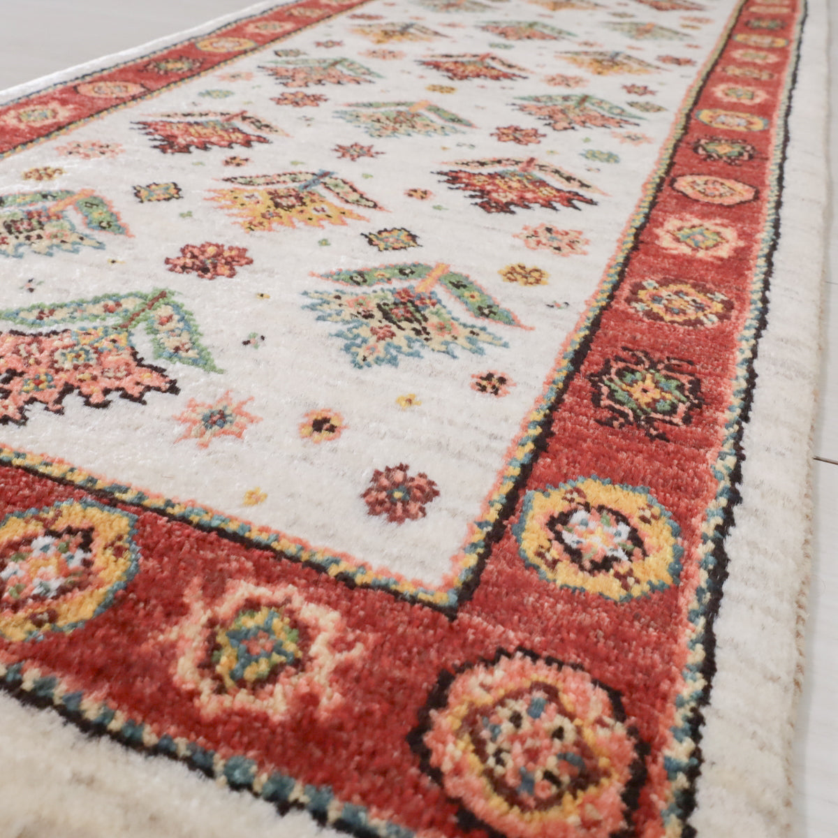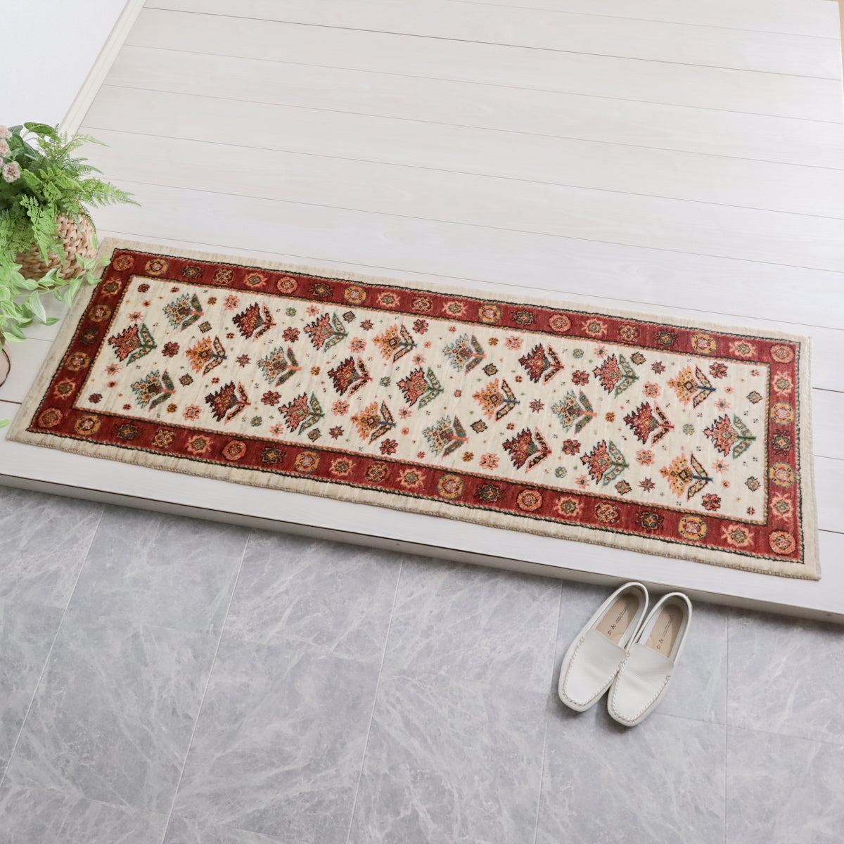 羊の毛色を生かした優しい生成りを基調に、一面にデザイン化された花のモチーフが描かれたギャッベ。周囲の赤いフレームが全体を引き締め、華やかな印象をより際立てています。お部屋に上品な彩りをもたらしてくれる一枚です。