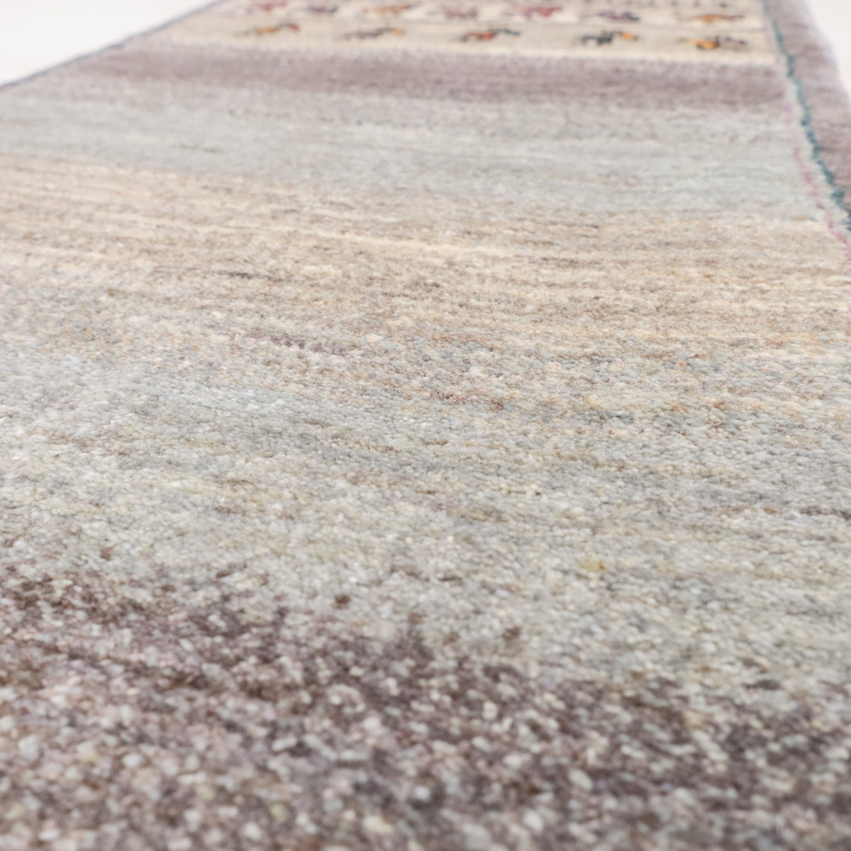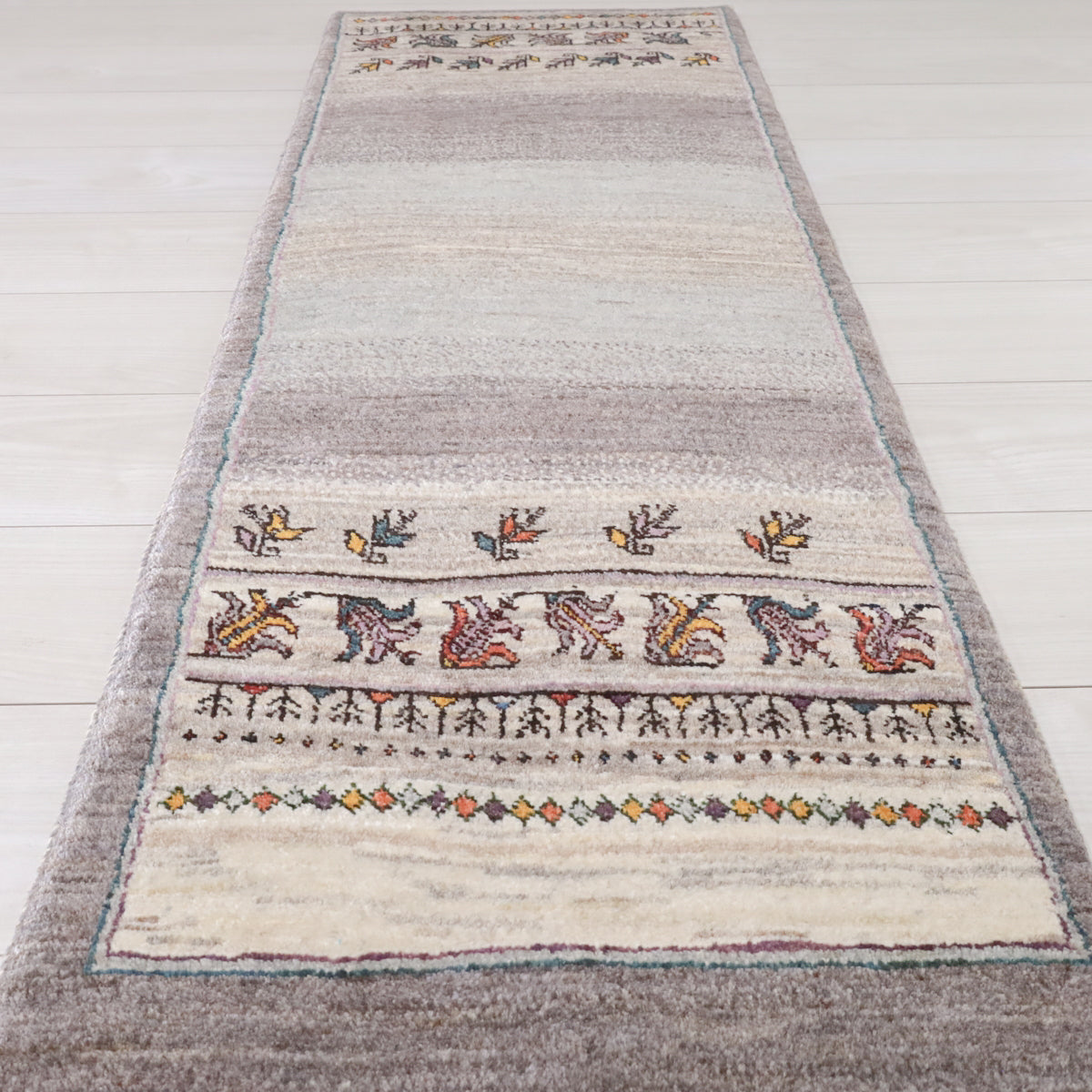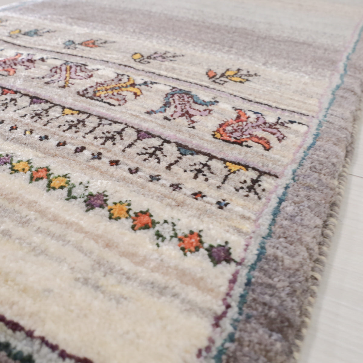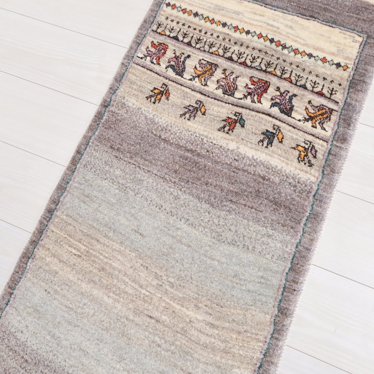 羊の毛色を生かしたグレーと生成りのグラデーション(アブラシ)を基調にしたデザイン。上下にカラフルな色使いで描かれた植物のモチーフが並び、ユニークで可愛らしいアクセントになっています。個性的でありつつも、落ち着きと和みを感じさせてくれるギャッベです。