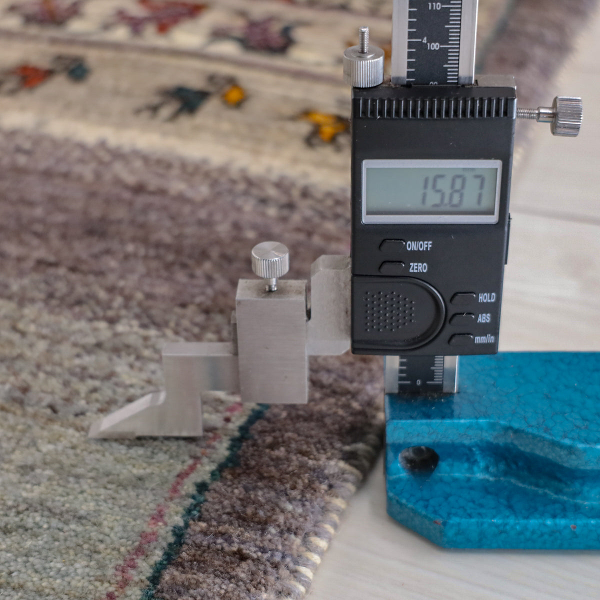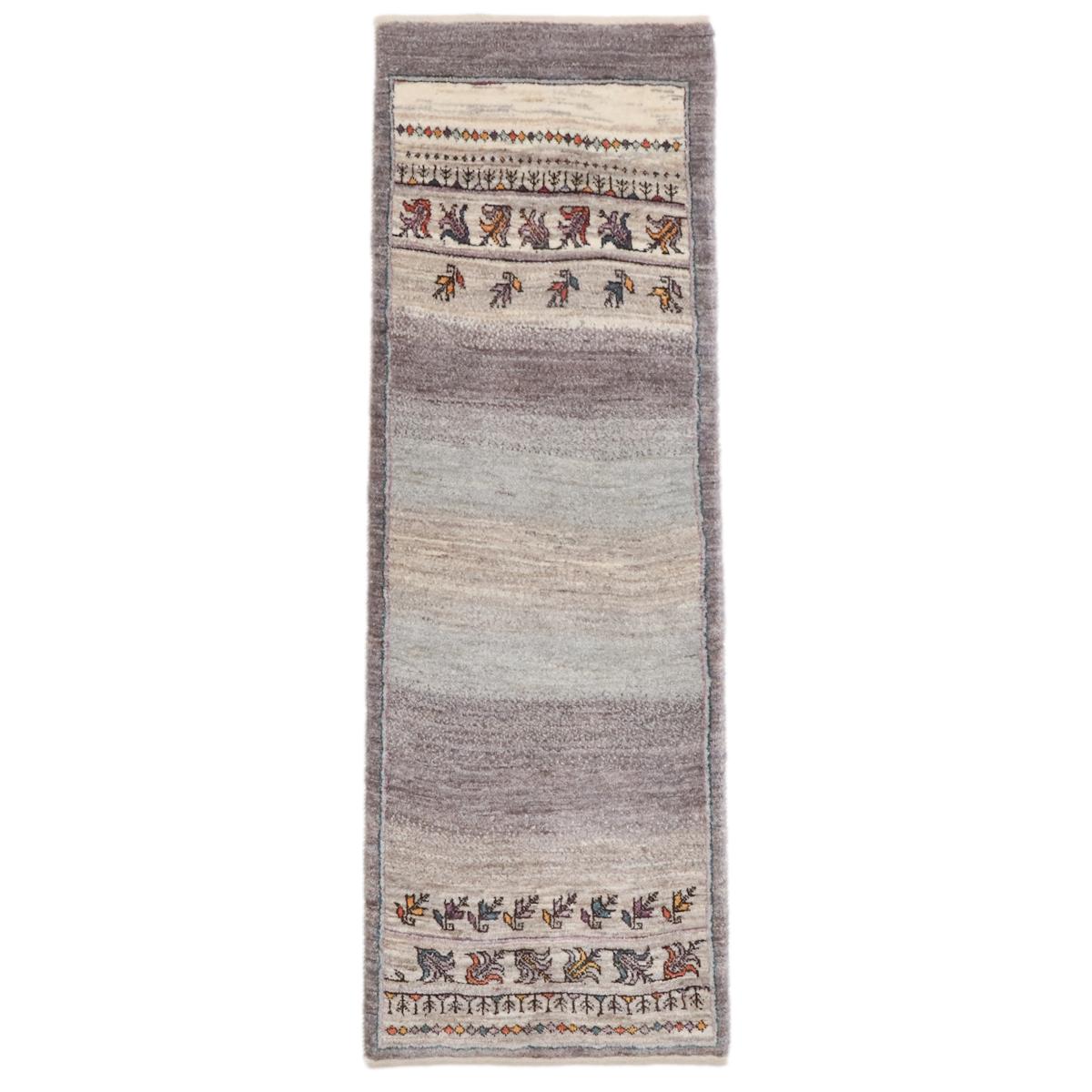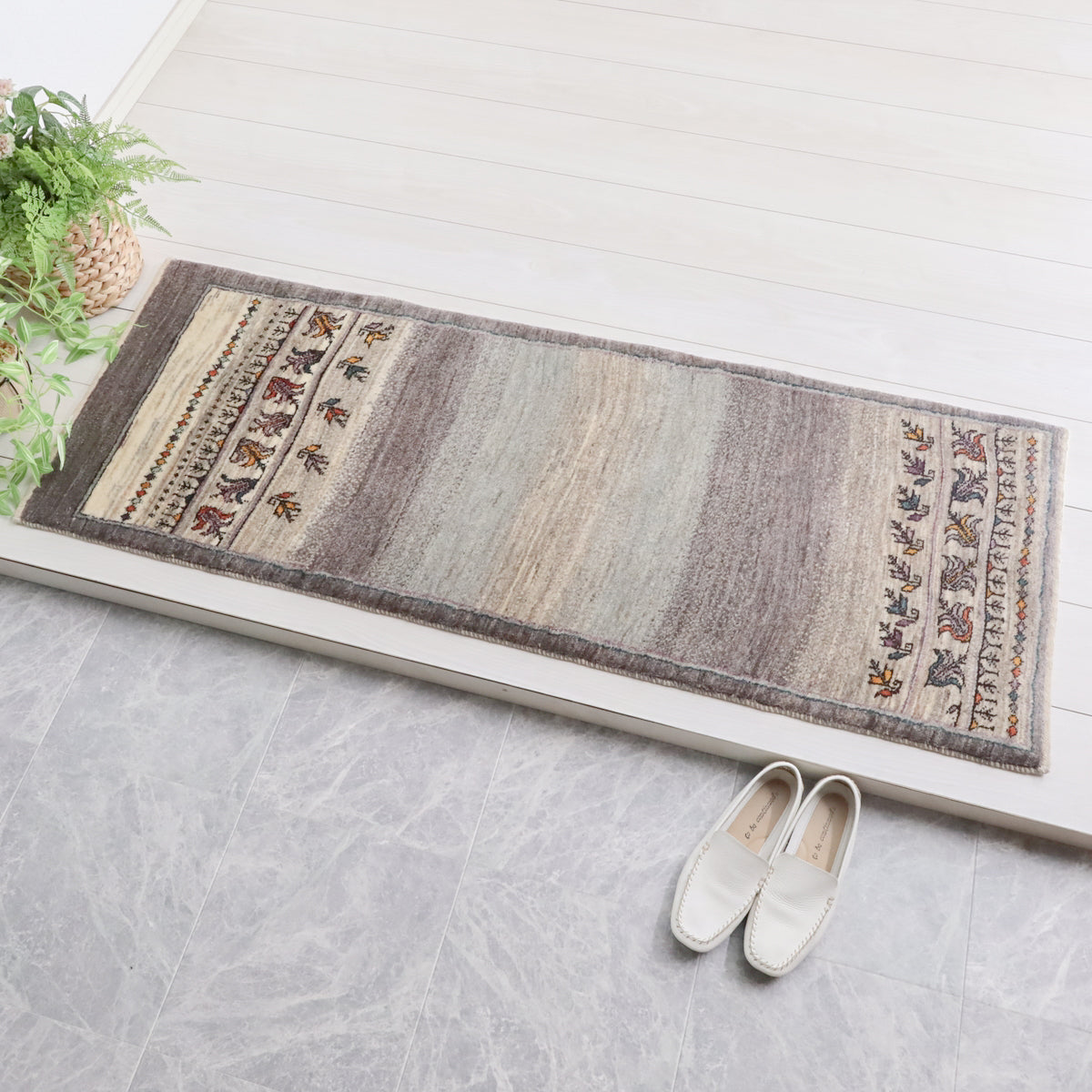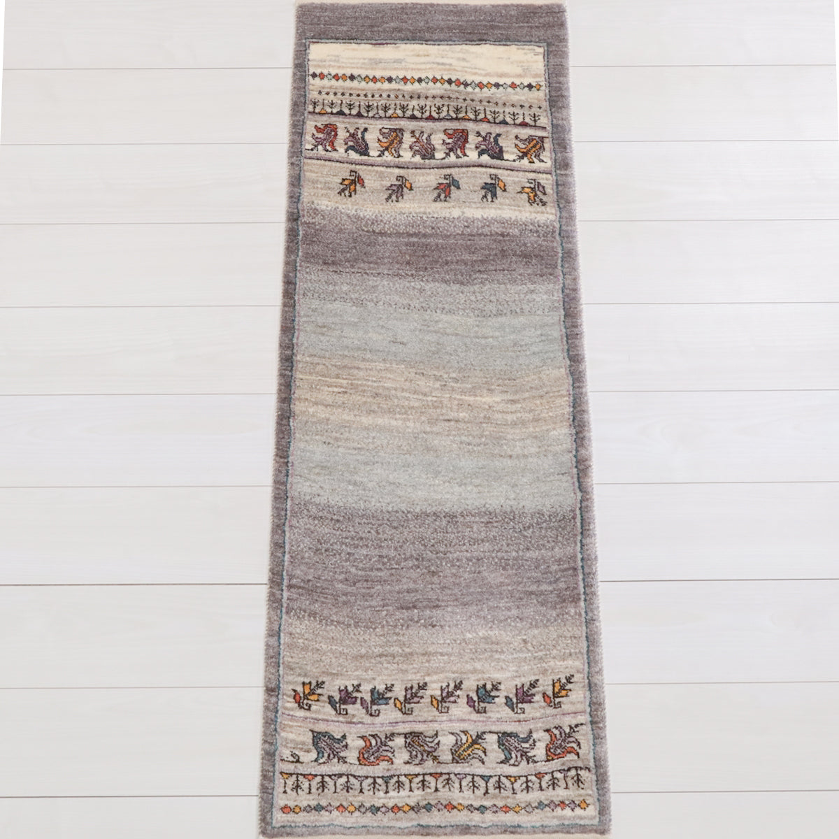 羊の毛色を生かしたグレーと生成りのグラデーション(アブラシ)を基調にしたデザイン。上下にカラフルな色使いで描かれた植物のモチーフが並び、ユニークで可愛らしいアクセントになっています。個性的でありつつも、落ち着きと和みを感じさせてくれるギャッベです。