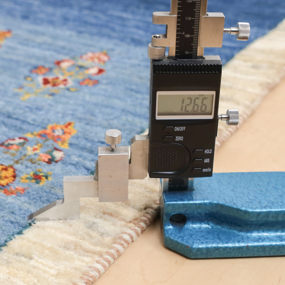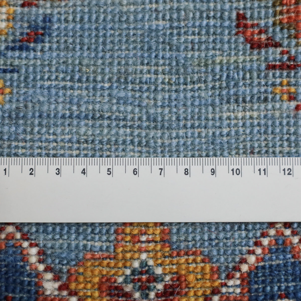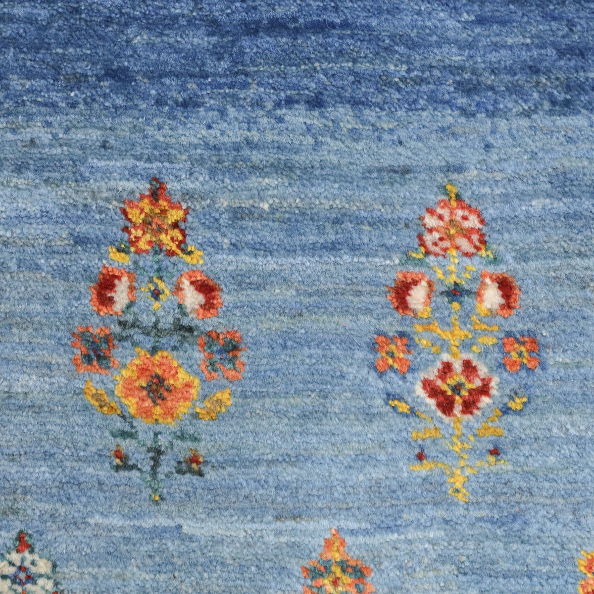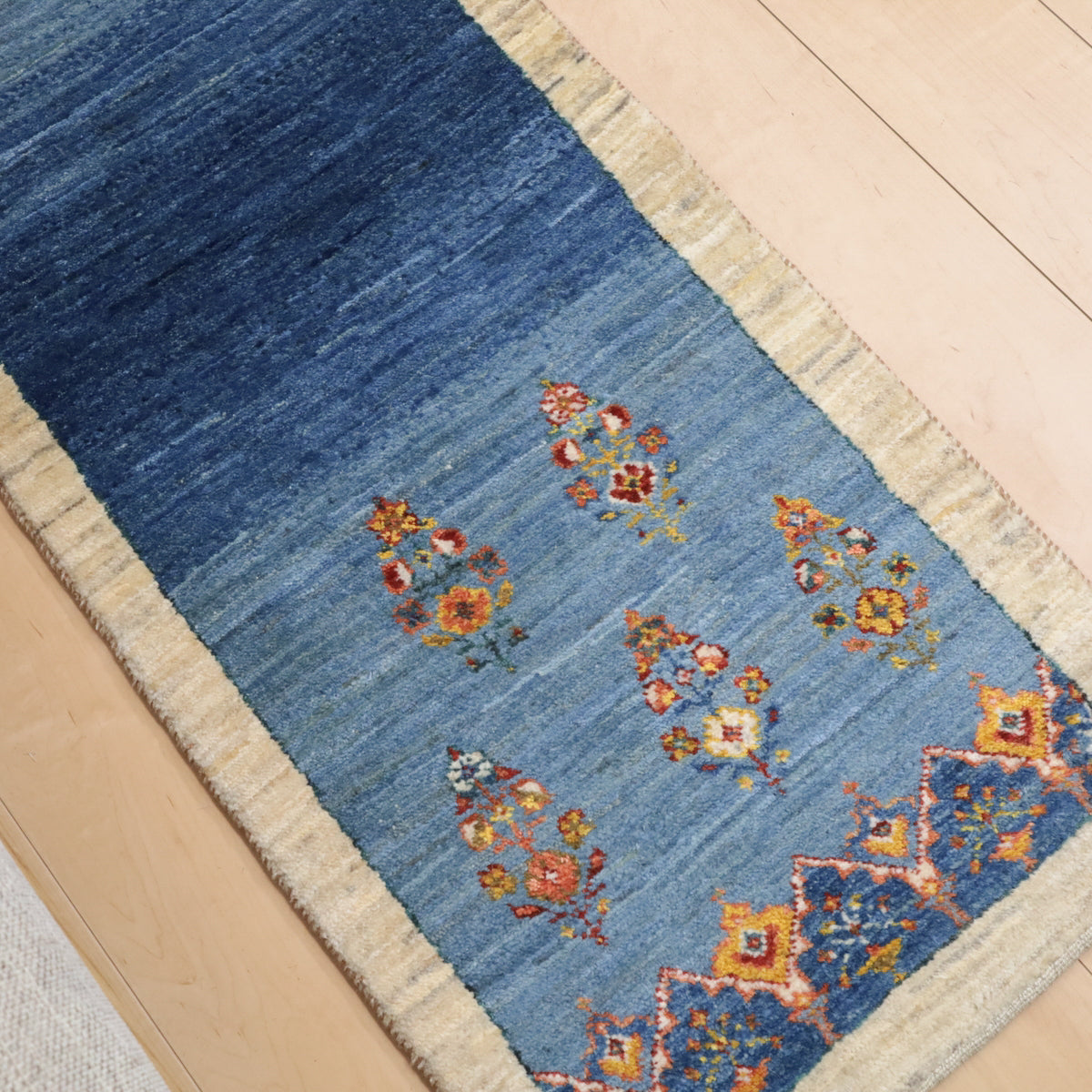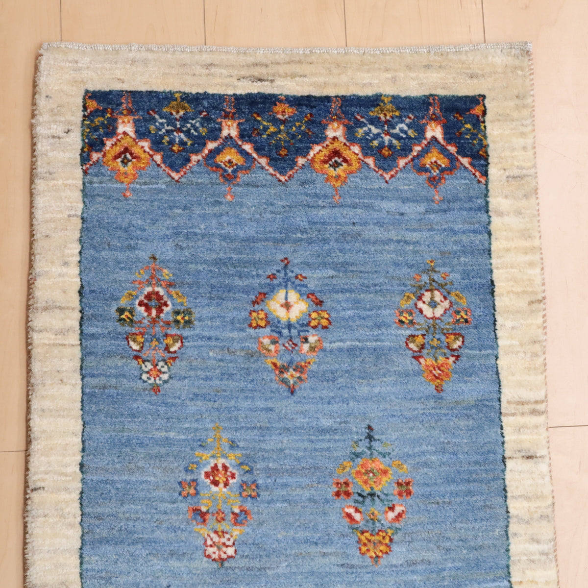 晴れた空の下、野の草花が色とりどりに咲く様子が明るく描かれています。濃淡のブルーのグラデーションが爽やかなギャッベです。