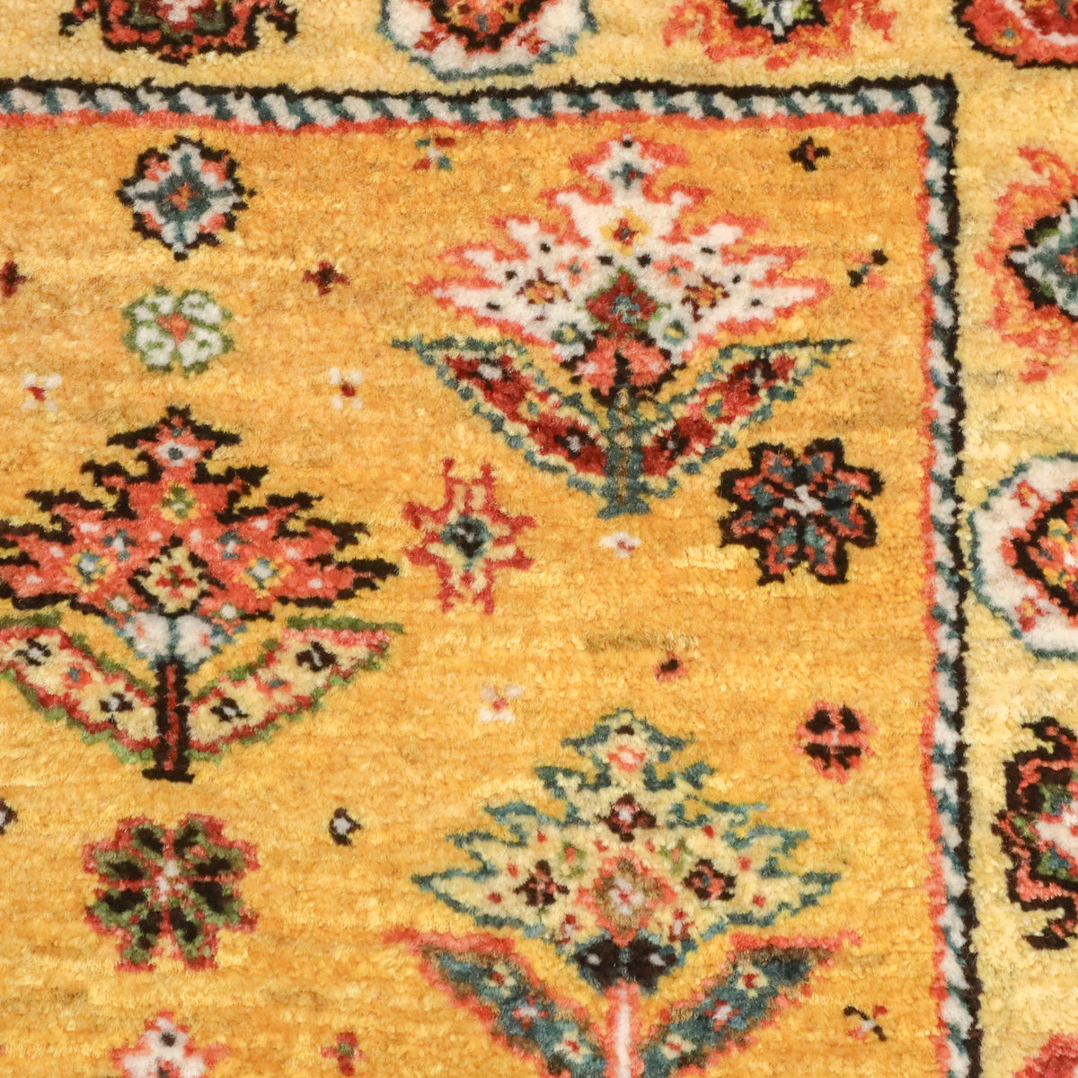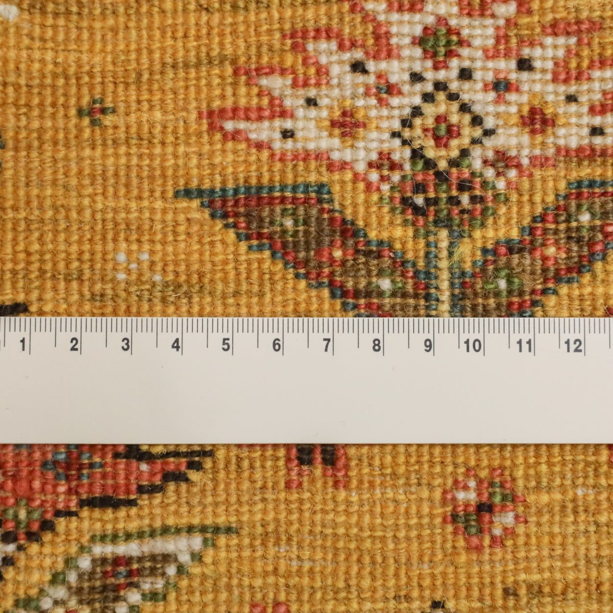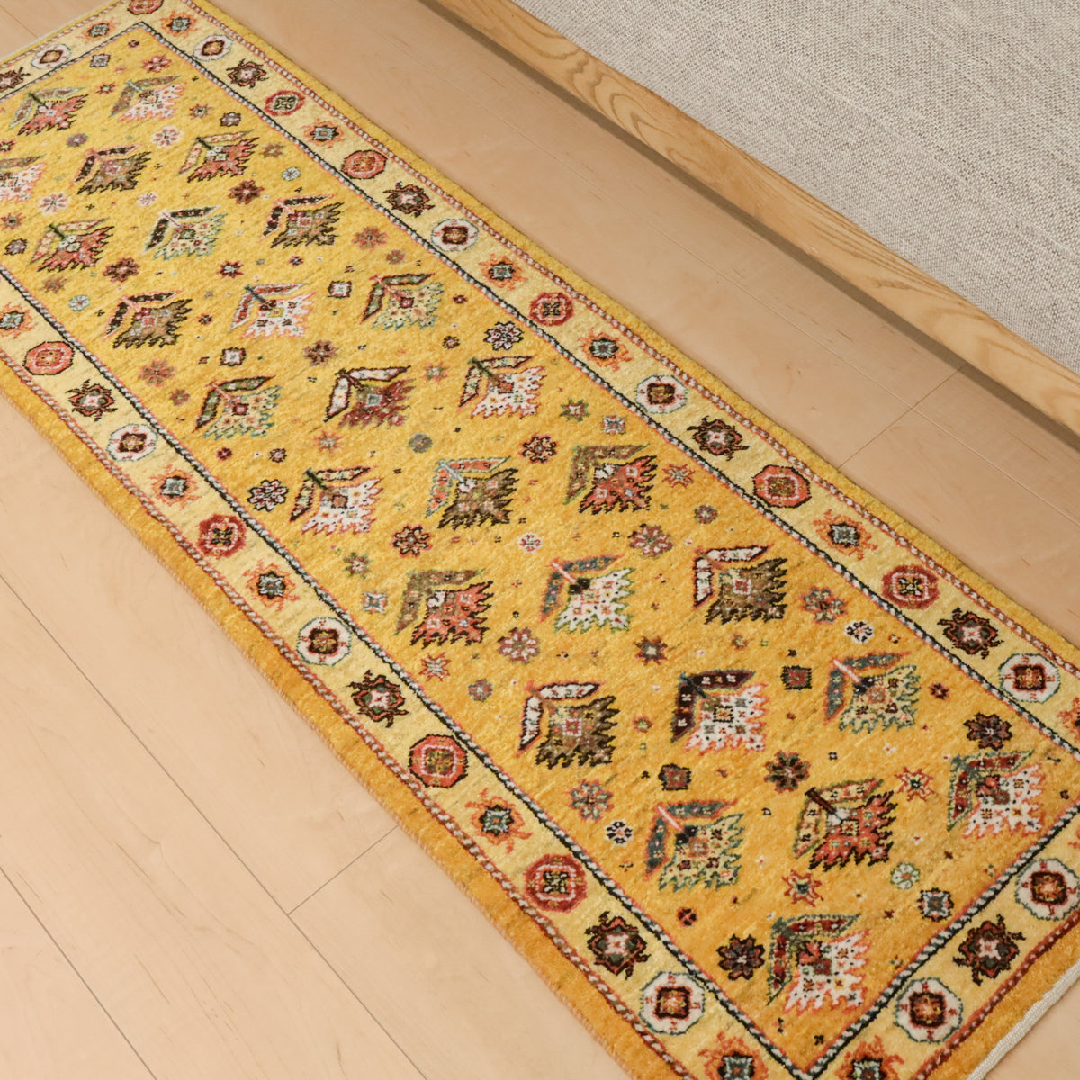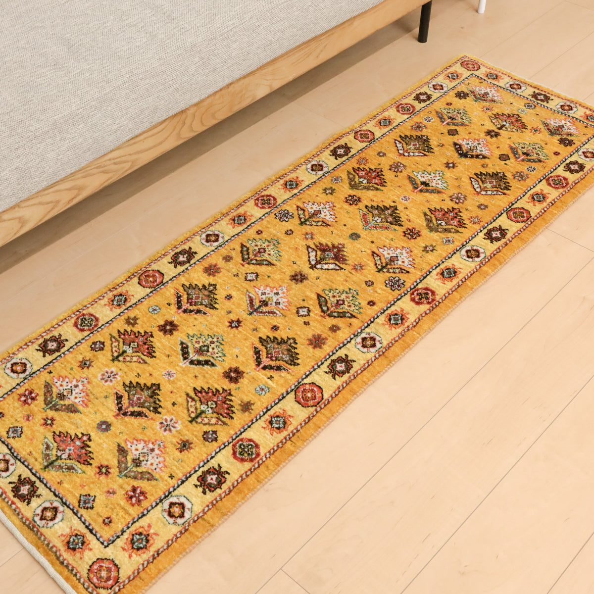 艶めき感のある柔らかな黄色を背景に、ルリバフの伝統的な草花の文様を規則的に配置した上品なデザイン。細やかな図柄には穏やかな癒しの雰囲気もあって、見ていると気持ちが和みます。