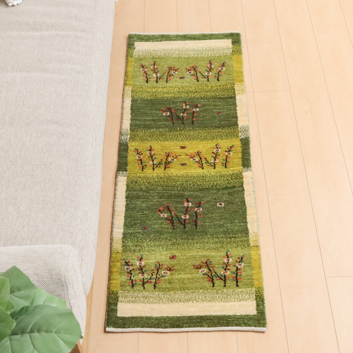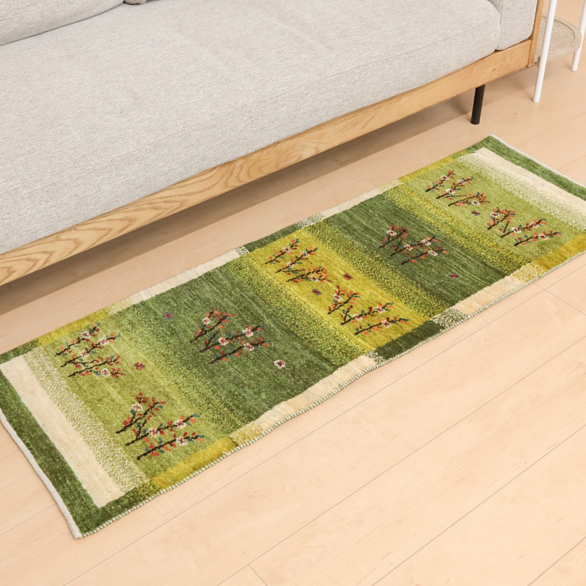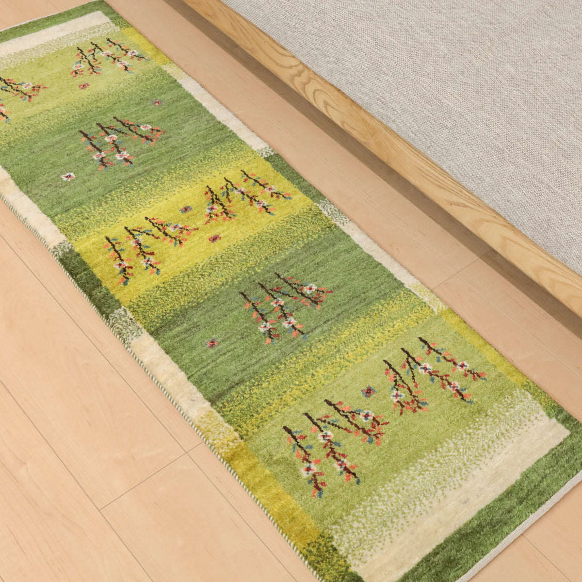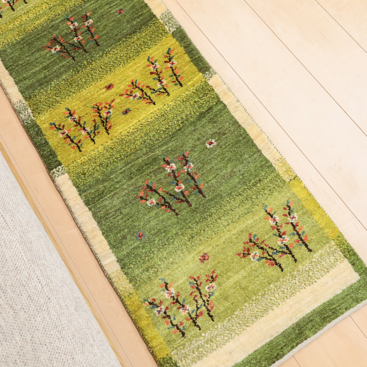 活き活きしたグリーンと明るい若草色がフレッシュな印象です。野の花咲く草原を切り取ったような広がりあるグラデーションが大変美しいグリーンギャッベです。