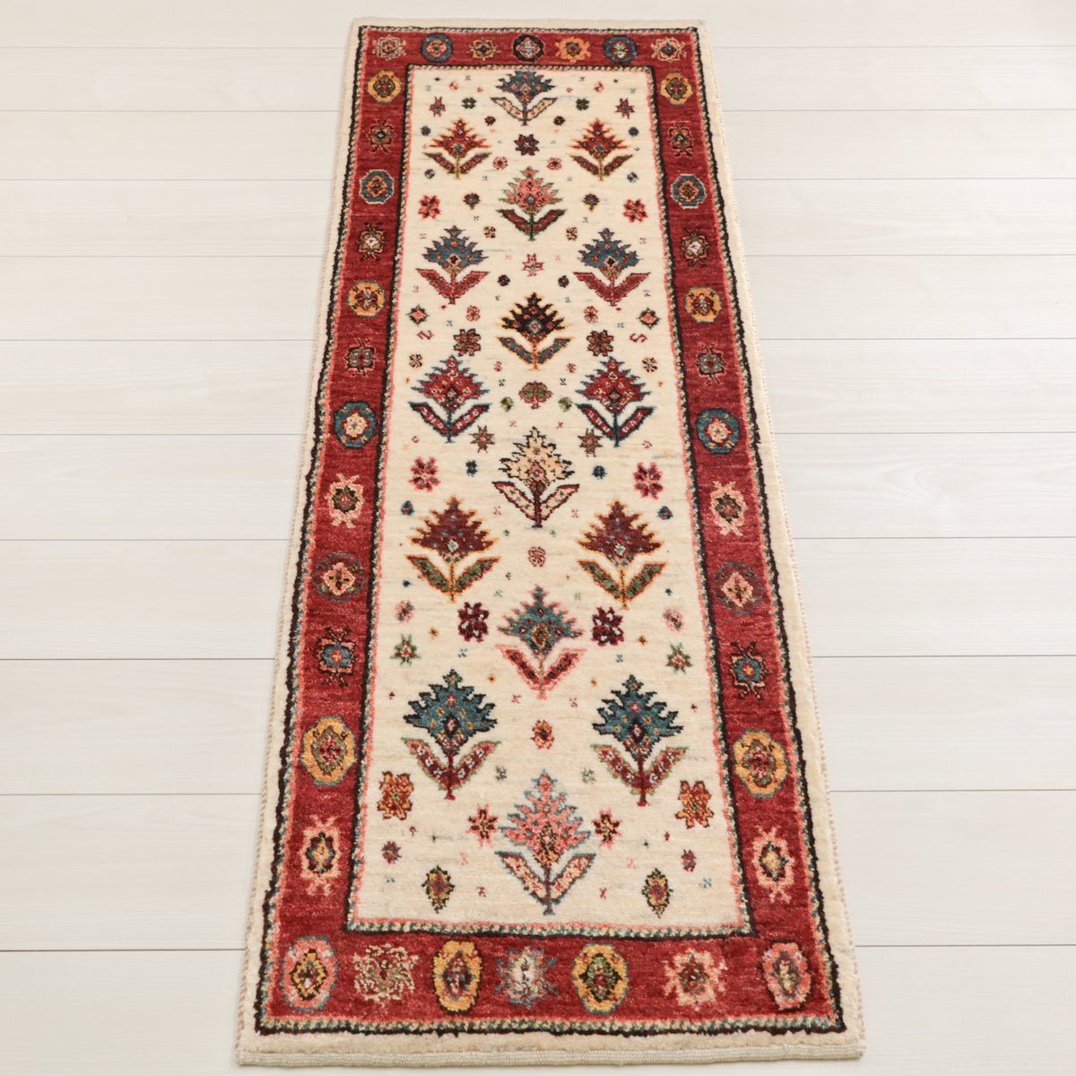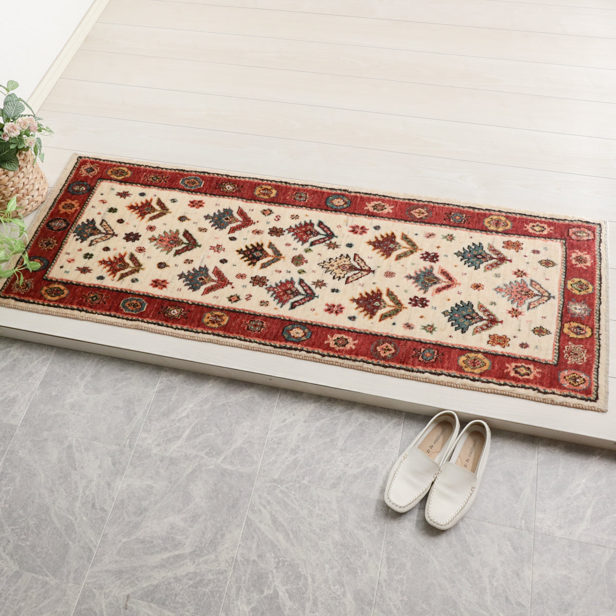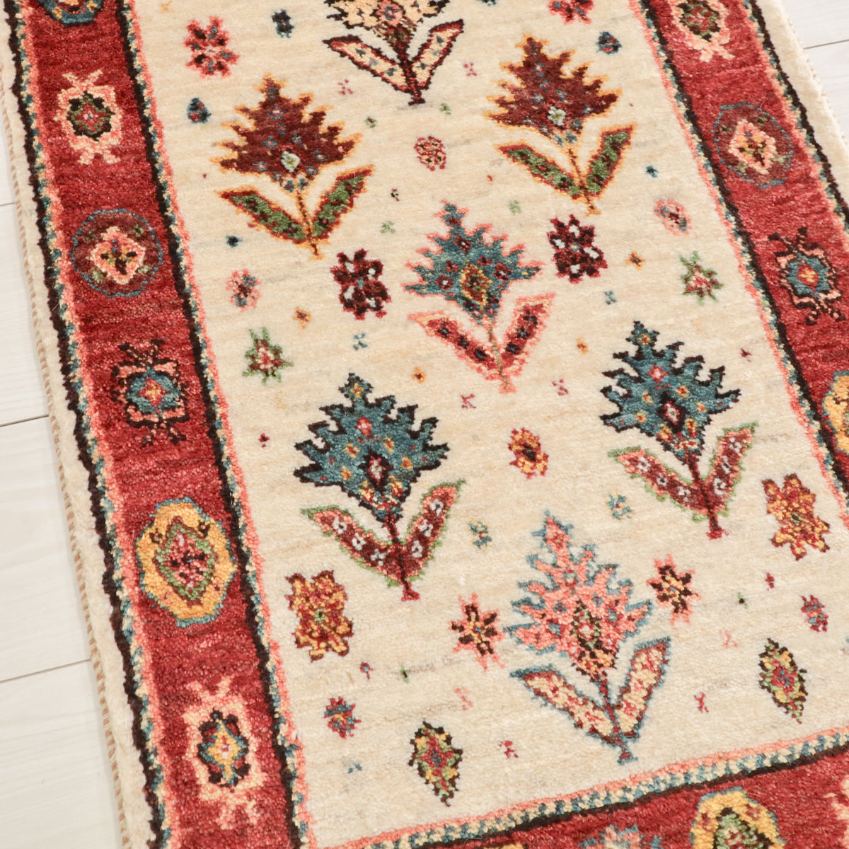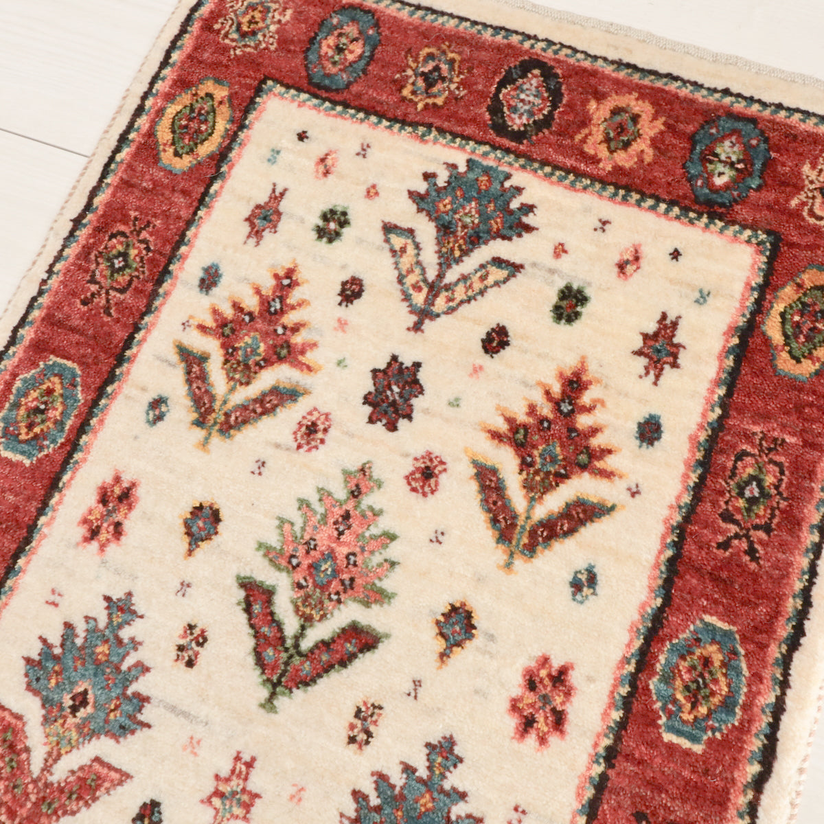 羊の毛色を生かした優しい生成りを基調に、一面にデザイン化された花のモチーフが描かれたギャッベ。周囲の赤いフレームが全体を引き締め、華やかな印象をより際立てています。お部屋に上品な彩りをもたらしてくれる一枚です。