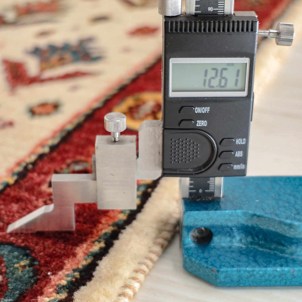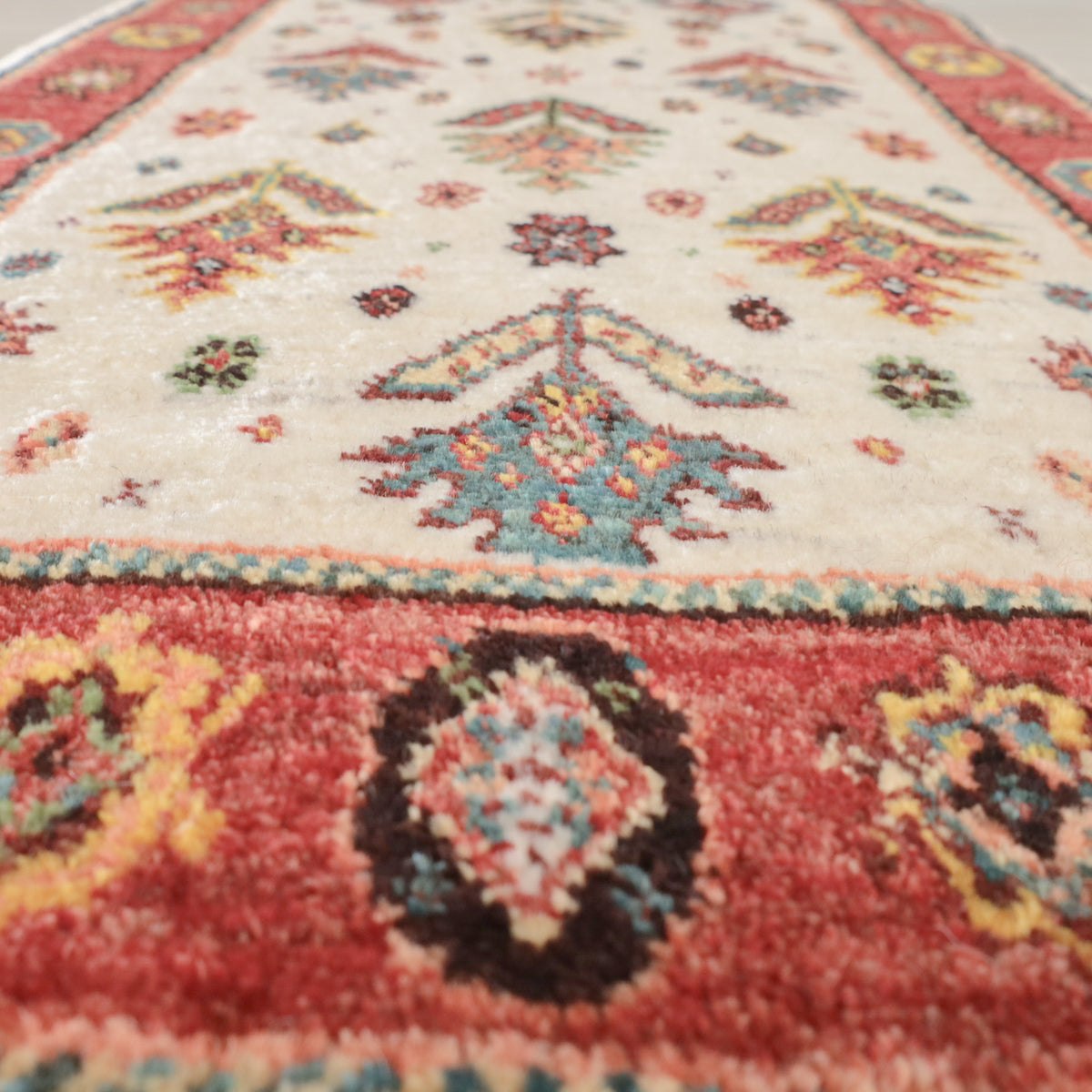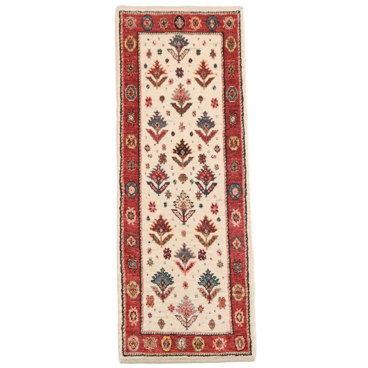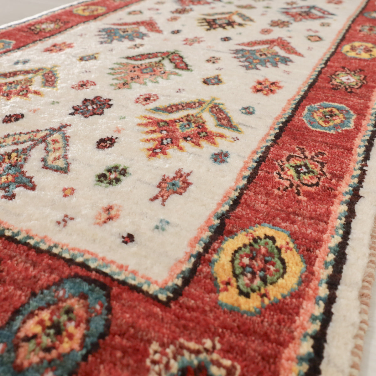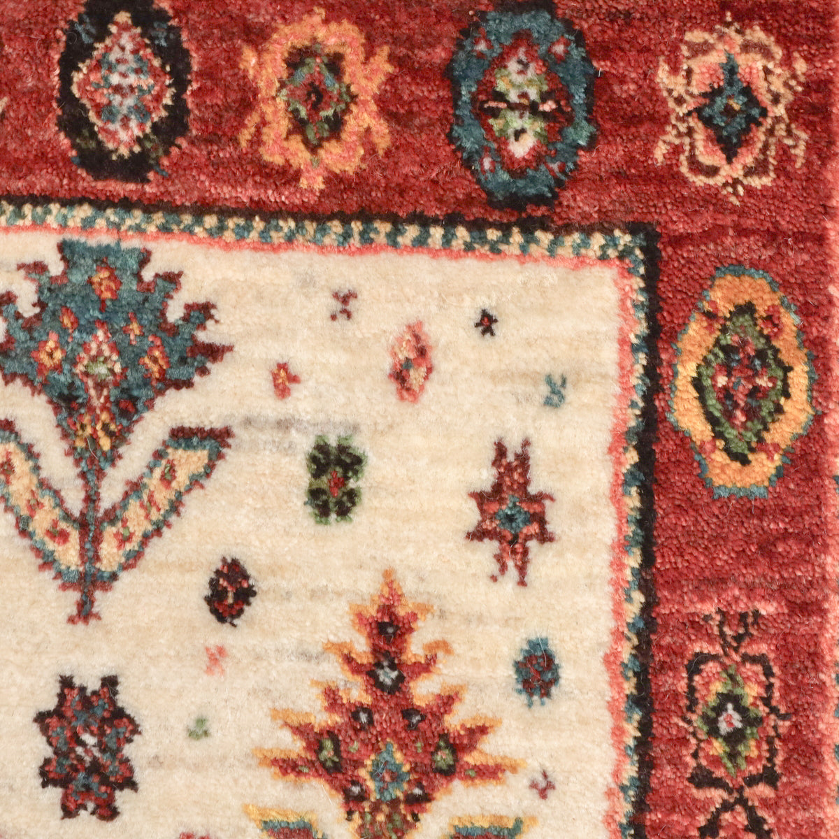 羊の毛色を生かした優しい生成りを基調に、一面にデザイン化された花のモチーフが描かれたギャッベ。周囲の赤いフレームが全体を引き締め、華やかな印象をより際立てています。お部屋に上品な彩りをもたらしてくれる一枚です。