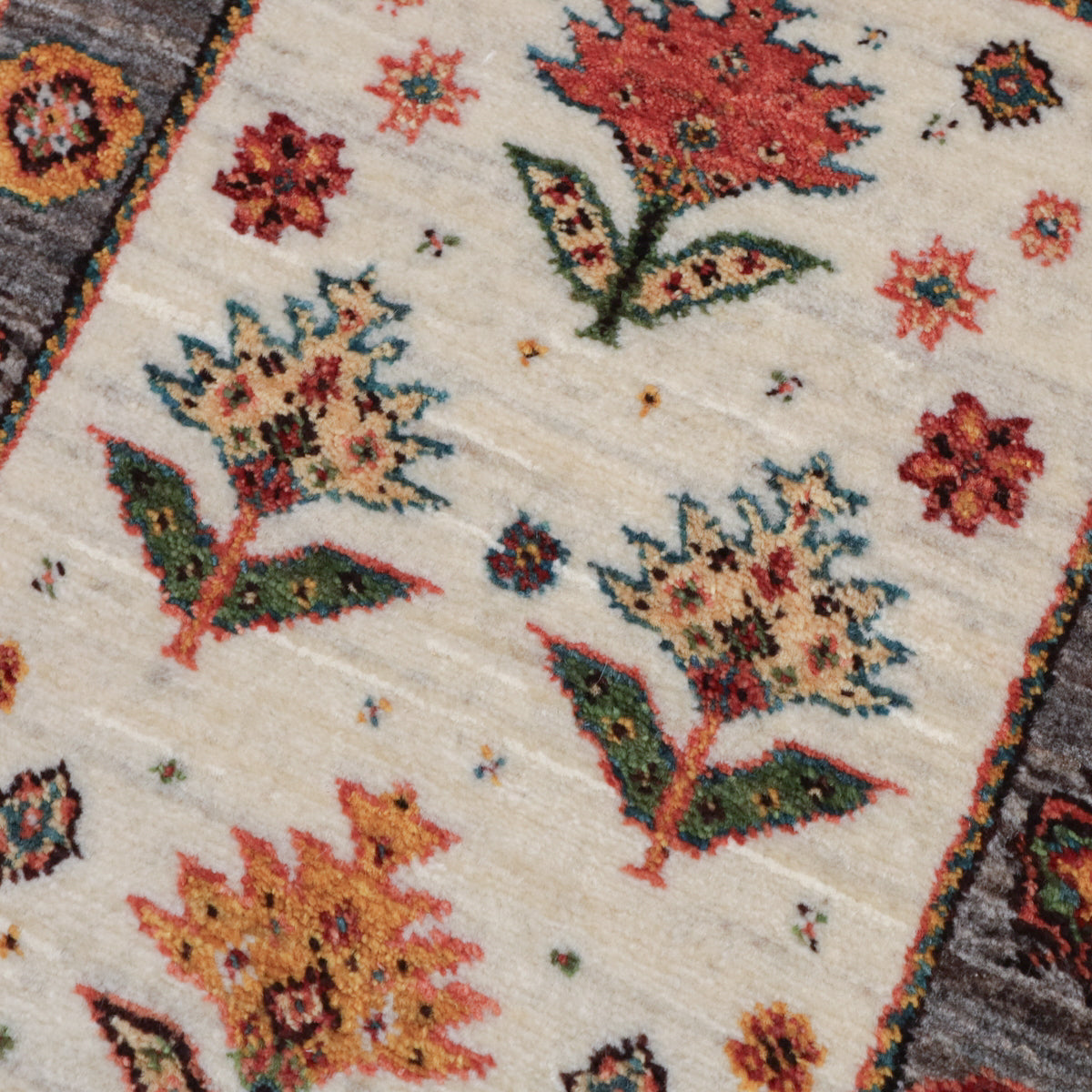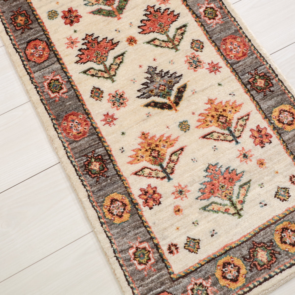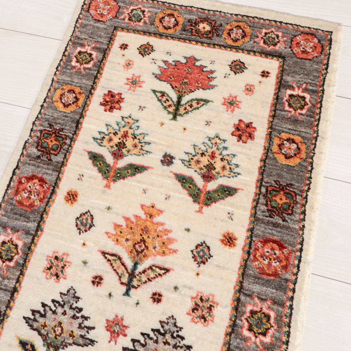 羊の毛色を生かした優しい生成りを基調に、一面にデザイン化された花のモチーフが描かれたギャッベ。周囲のフレームも羊の毛色の茶のムラ織で、おしゃれで個性的な雰囲気。華やかでありつつ、どこかほっとする印象の一枚です。