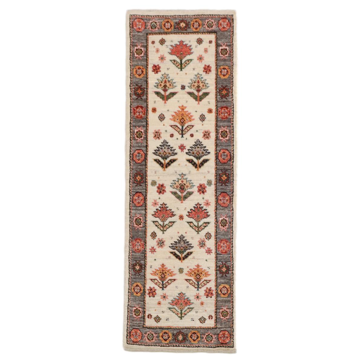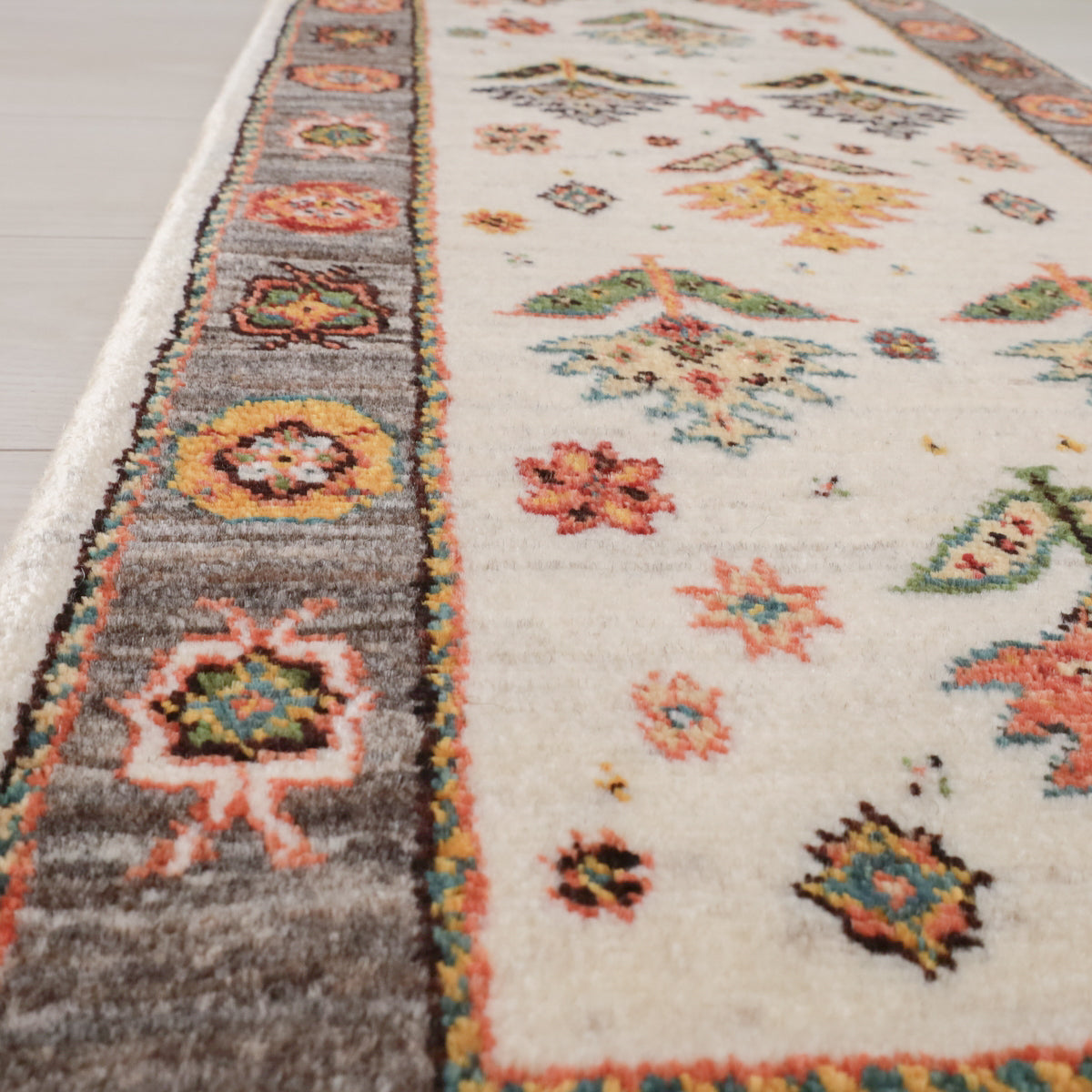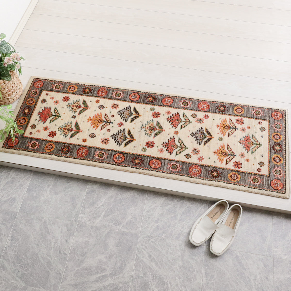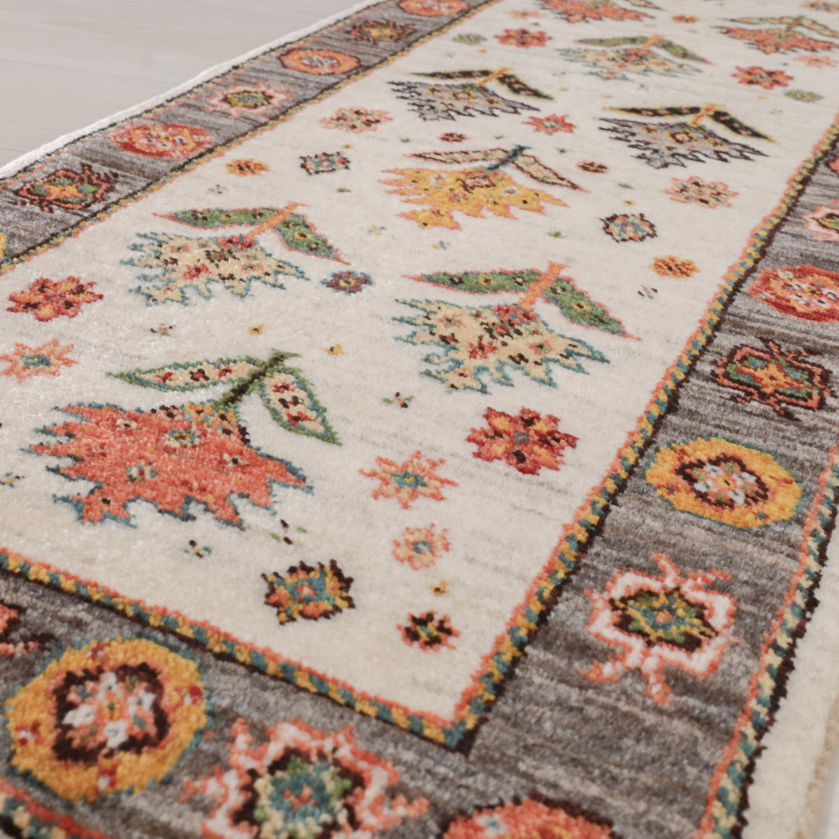 羊の毛色を生かした優しい生成りを基調に、一面にデザイン化された花のモチーフが描かれたギャッベ。周囲のフレームも羊の毛色の茶のムラ織で、おしゃれで個性的な雰囲気。華やかでありつつ、どこかほっとする印象の一枚です。