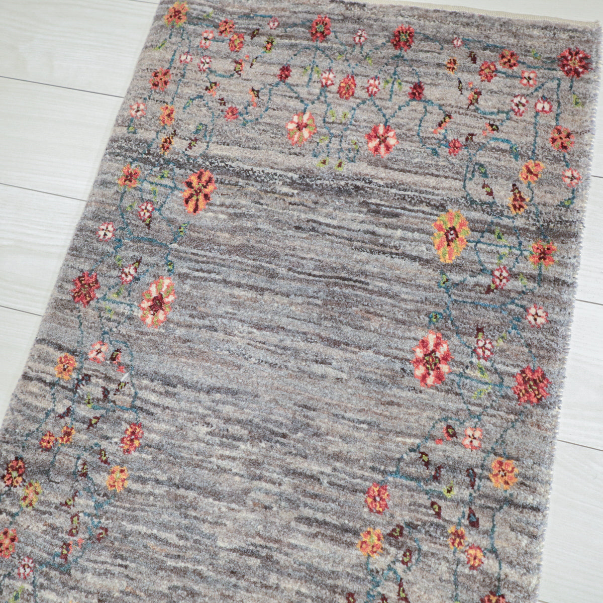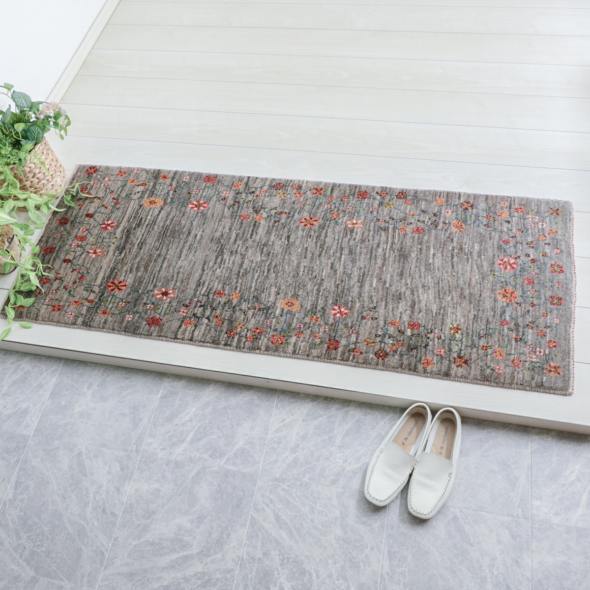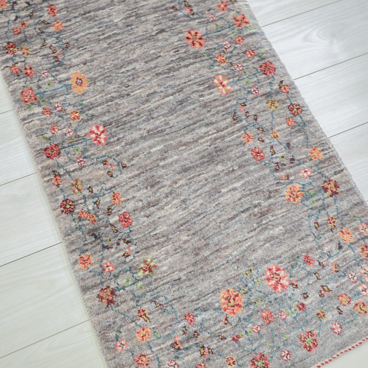 羊の毛色を生かしたグレーを基調に、赤や橙の繊細な花のモチーフがぱっと明るく映えています。どんなお部屋にも合うシックさと可愛らしさを兼ね備えた、個性的で魅力あふれる一枚です。