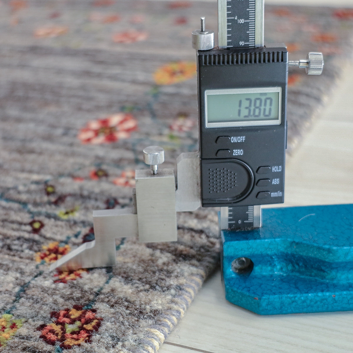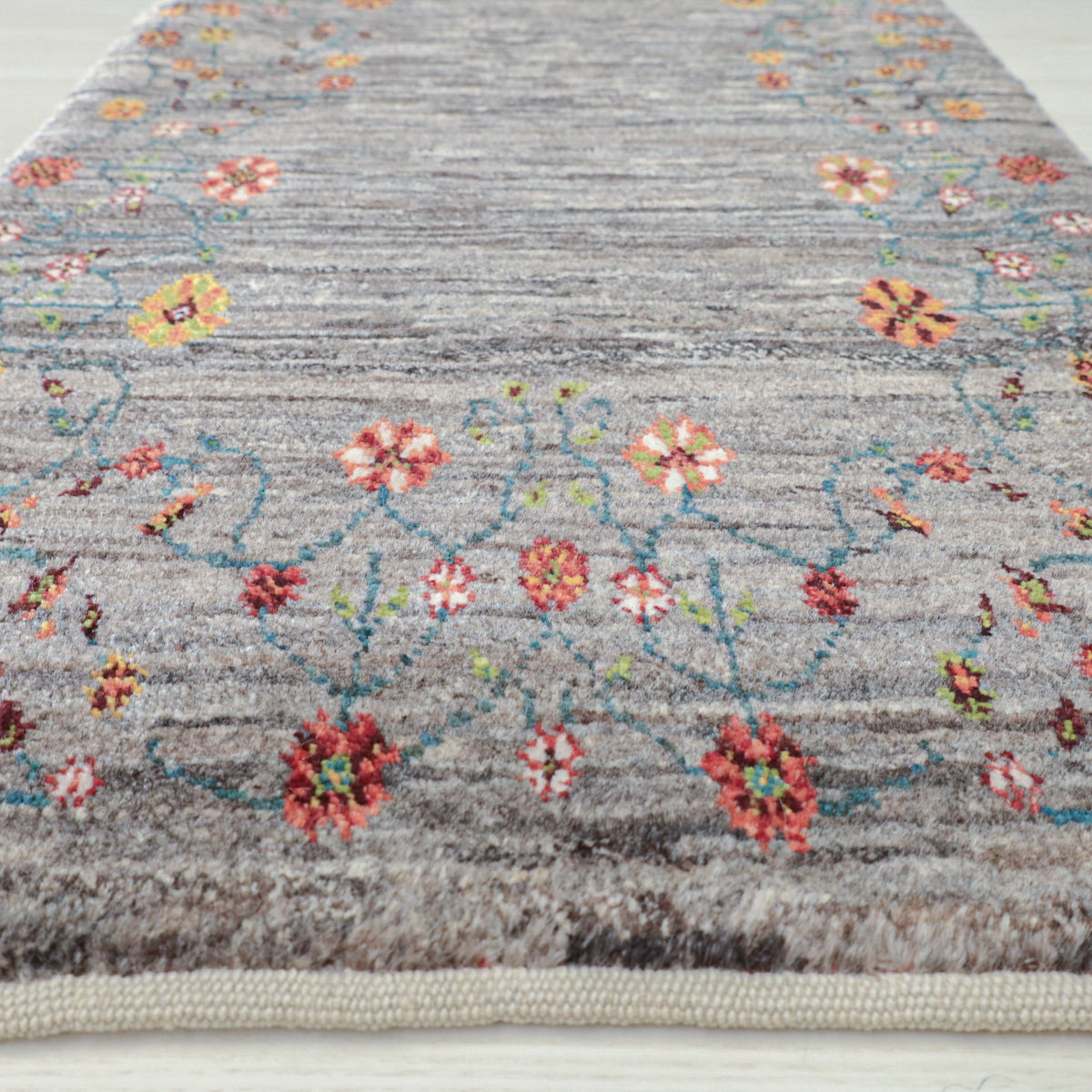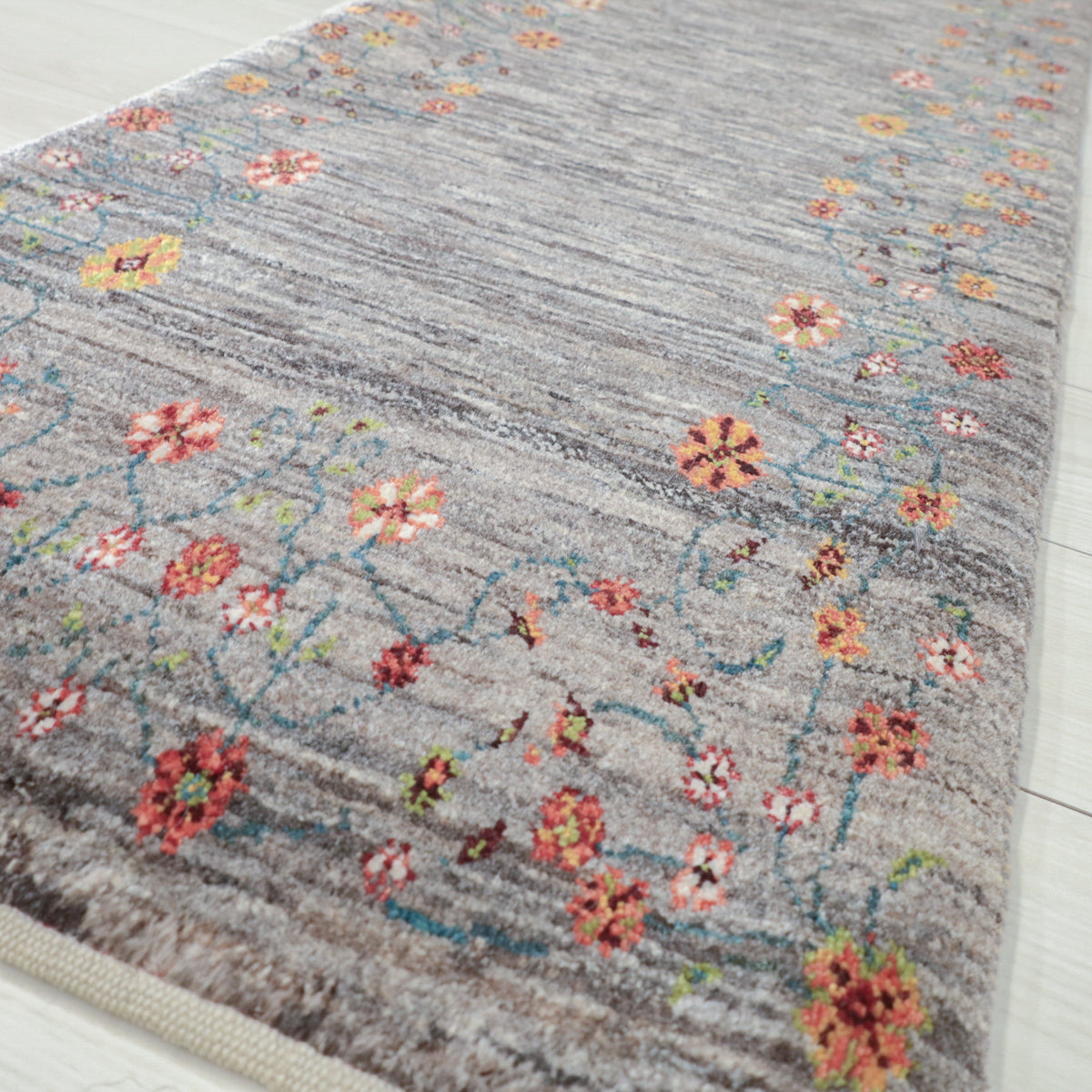 羊の毛色を生かしたグレーを基調に、赤や橙の繊細な花のモチーフがぱっと明るく映えています。どんなお部屋にも合うシックさと可愛らしさを兼ね備えた、個性的で魅力あふれる一枚です。