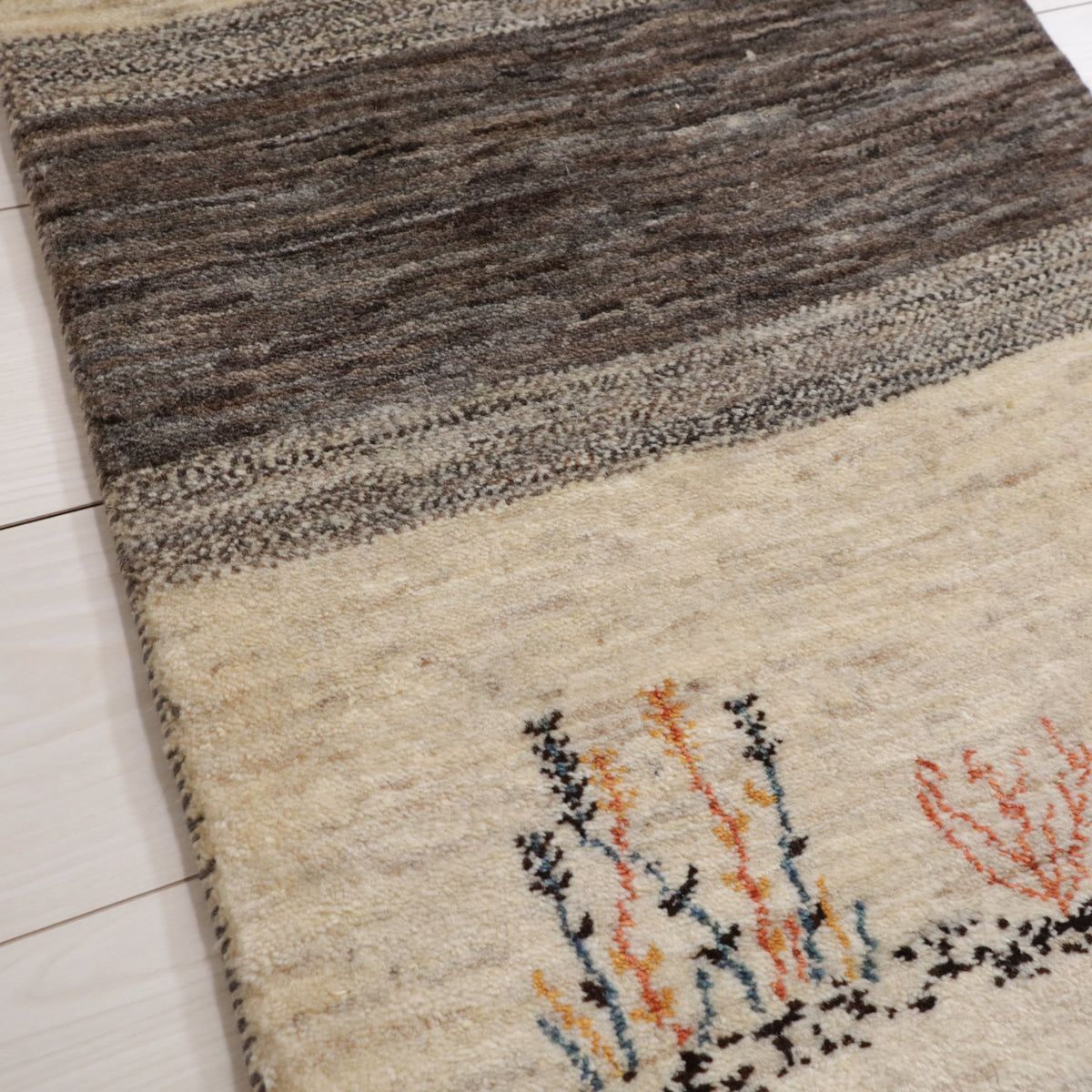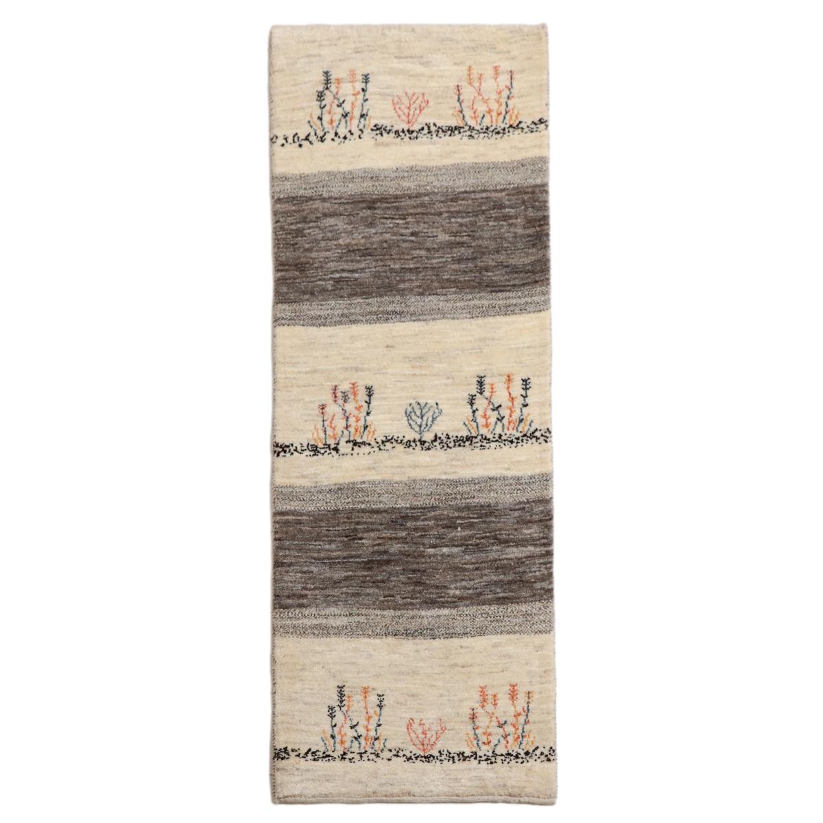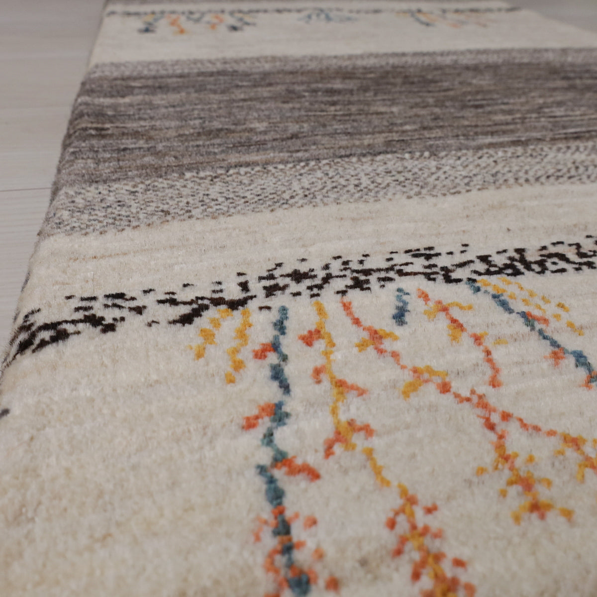 羊の毛色を生かした生成りとグレーのグラデーション(アブラシ)を基調にしたギャッベ。繊細な草花のモチーフは、橙や青の色使いでモダンな印象をプラス。お部屋に自然な心地よさをもたらしてくれる一枚です。