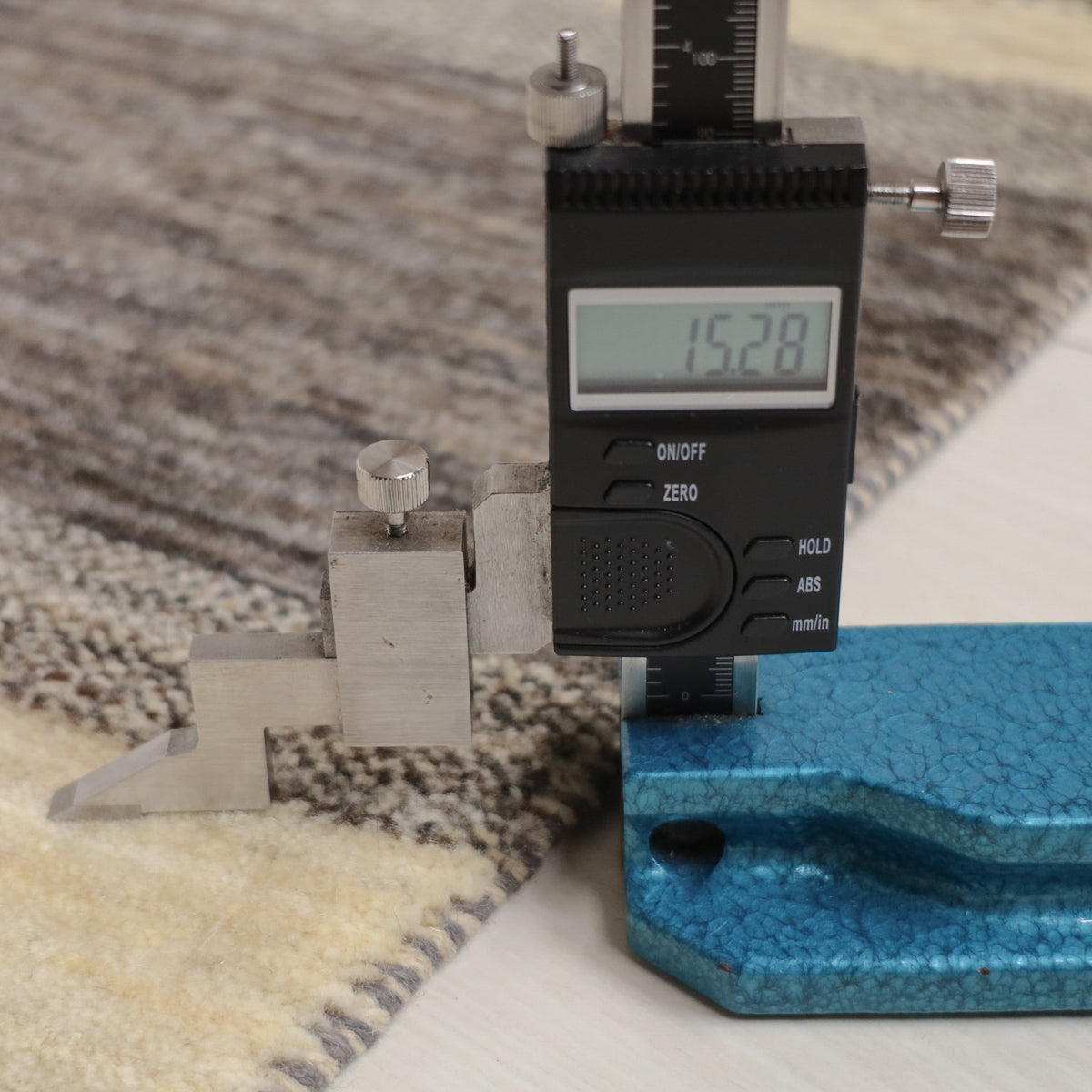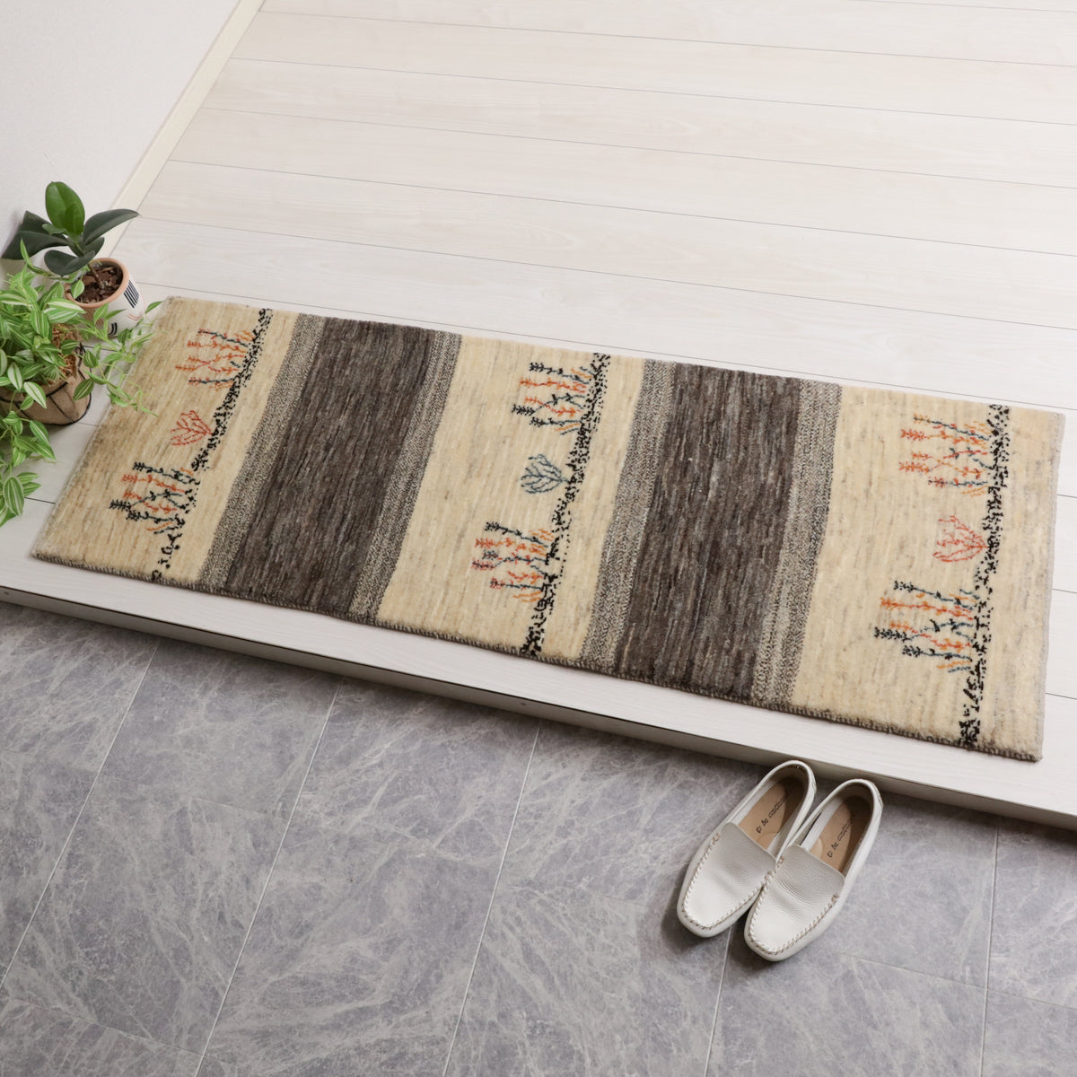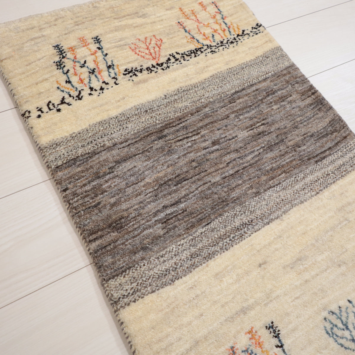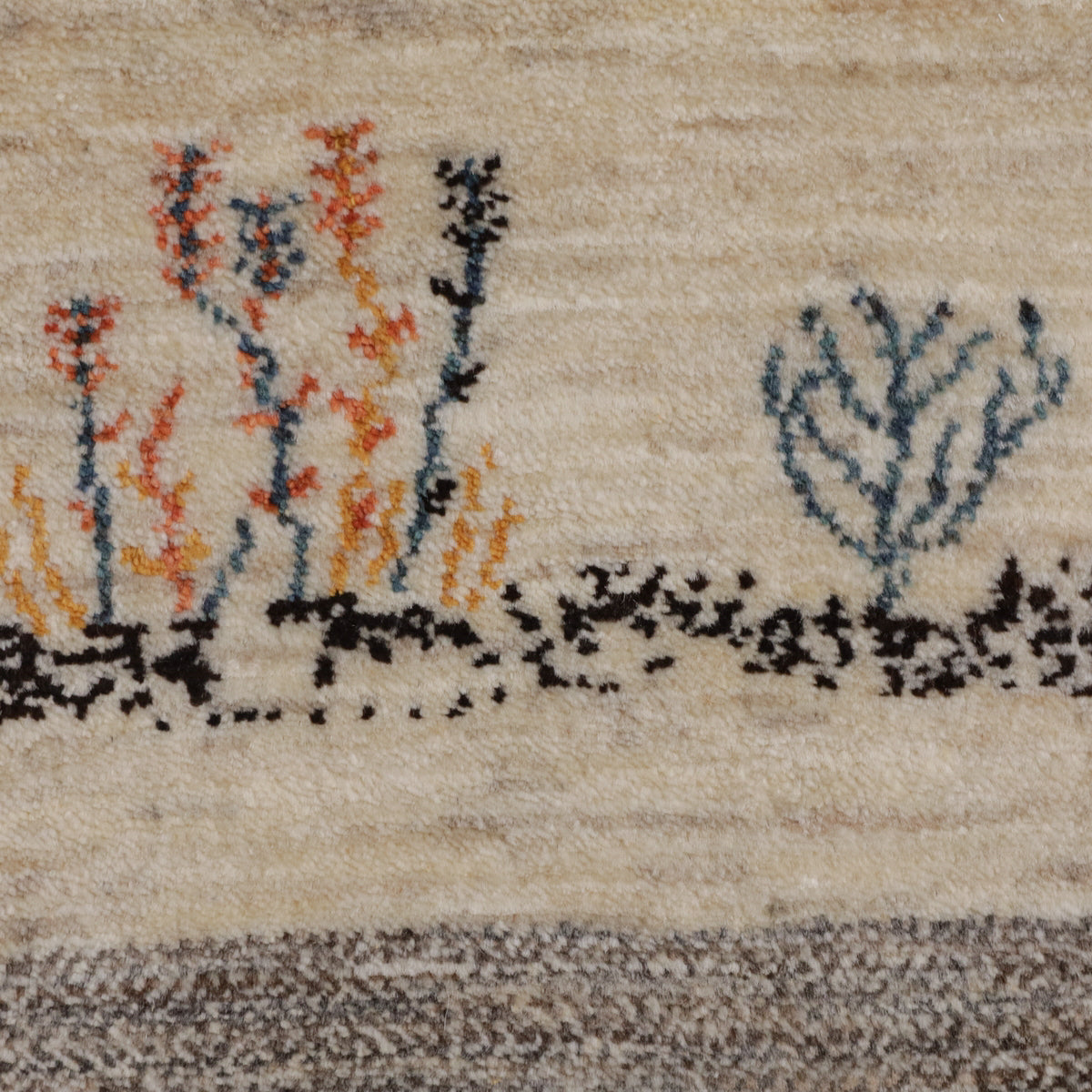 羊の毛色を生かした生成りとグレーのグラデーション(アブラシ)を基調にしたギャッベ。繊細な草花のモチーフは、橙や青の色使いでモダンな印象をプラス。お部屋に自然な心地よさをもたらしてくれる一枚です。