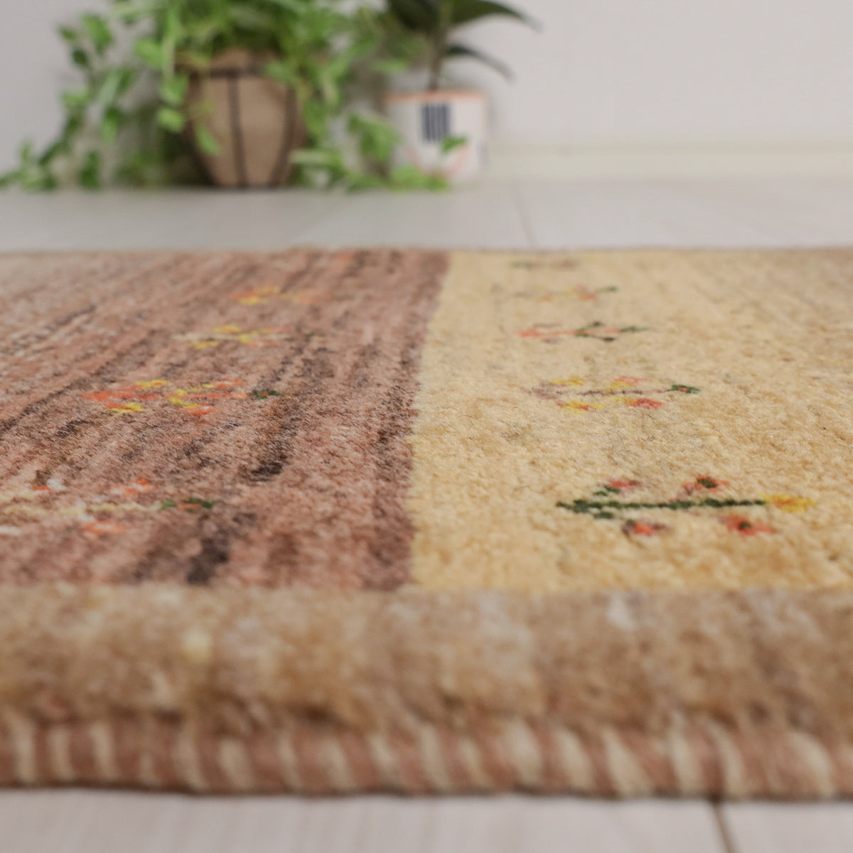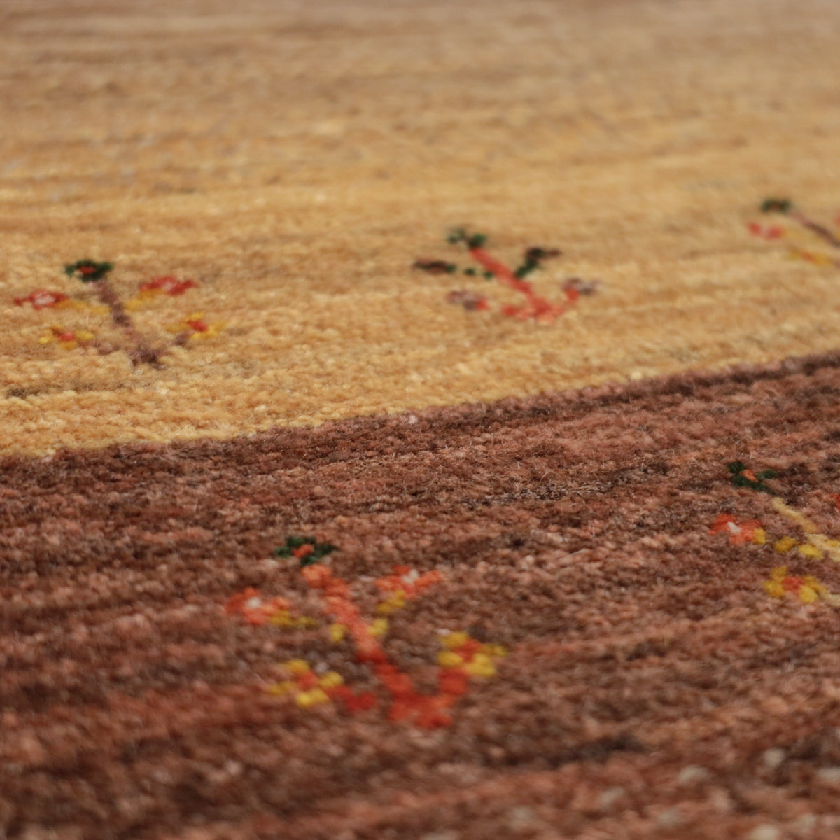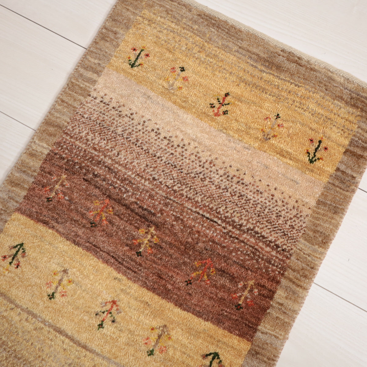 茶系のグラデーション(アブラシ)が基調となった、温かみにあふれた色彩のギャッベ。小さな植物のモチーフが可愛らしく全体を飾っています。細長タイプの中ではスリムなサイズ感と厚みで、どんな場所にも配置しやすい一枚です。