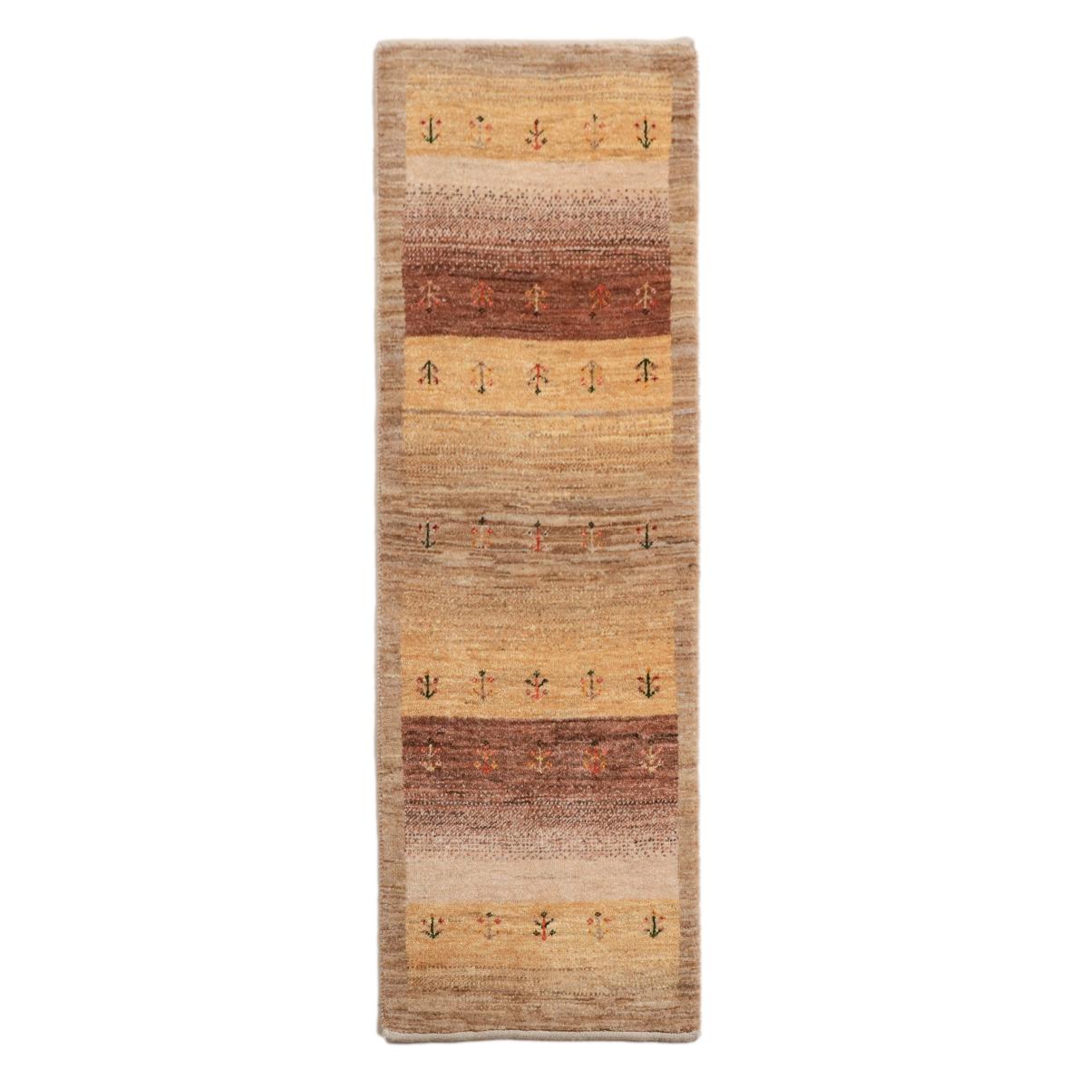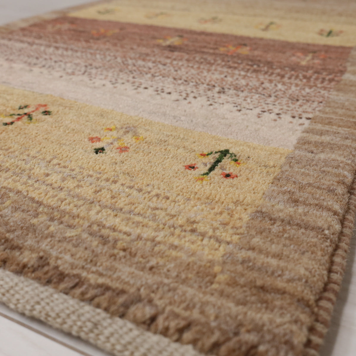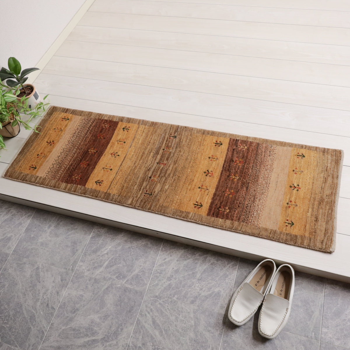 茶系のグラデーション(アブラシ)が基調となった、温かみにあふれた色彩のギャッベ。小さな植物のモチーフが可愛らしく全体を飾っています。細長タイプの中ではスリムなサイズ感と厚みで、どんな場所にも配置しやすい一枚です。