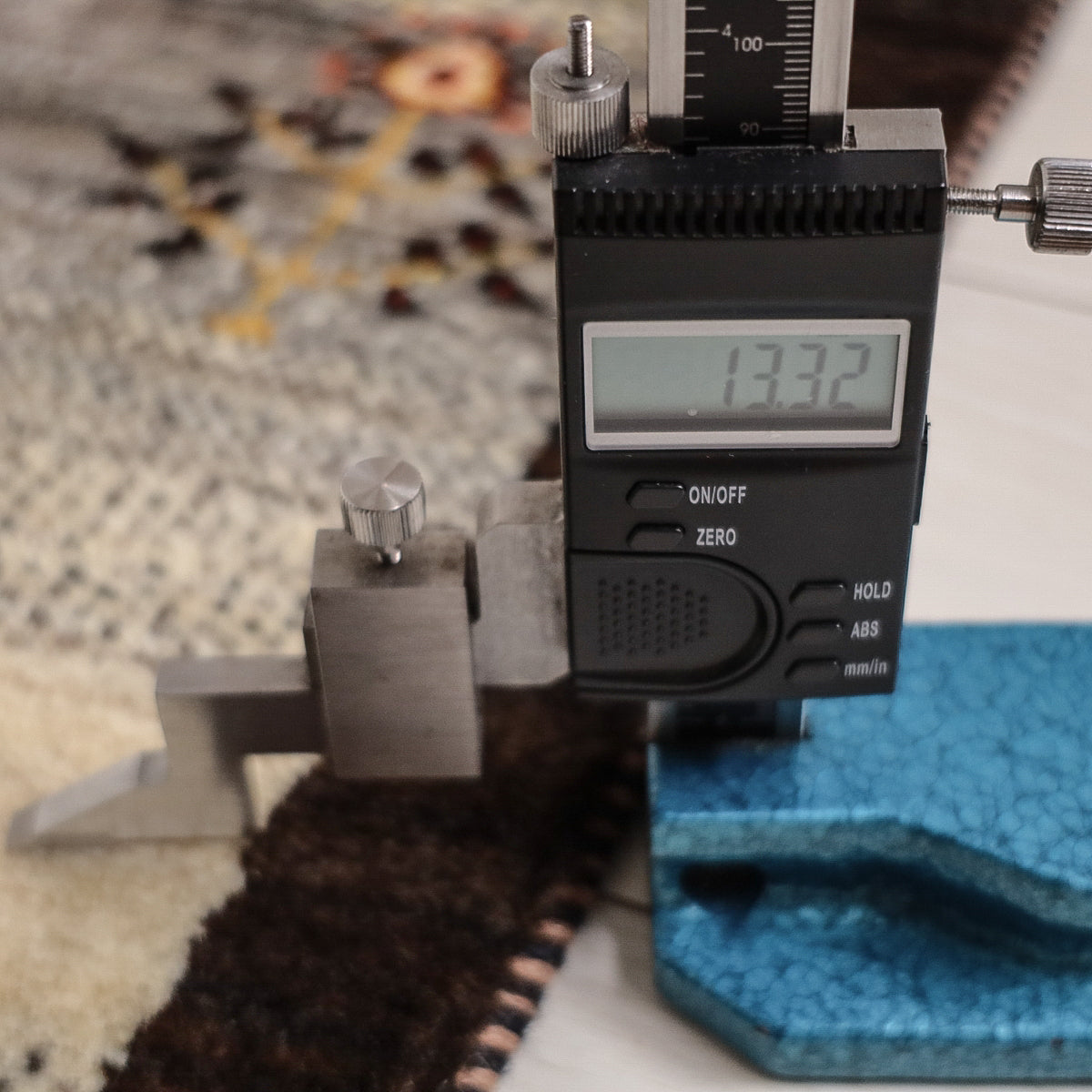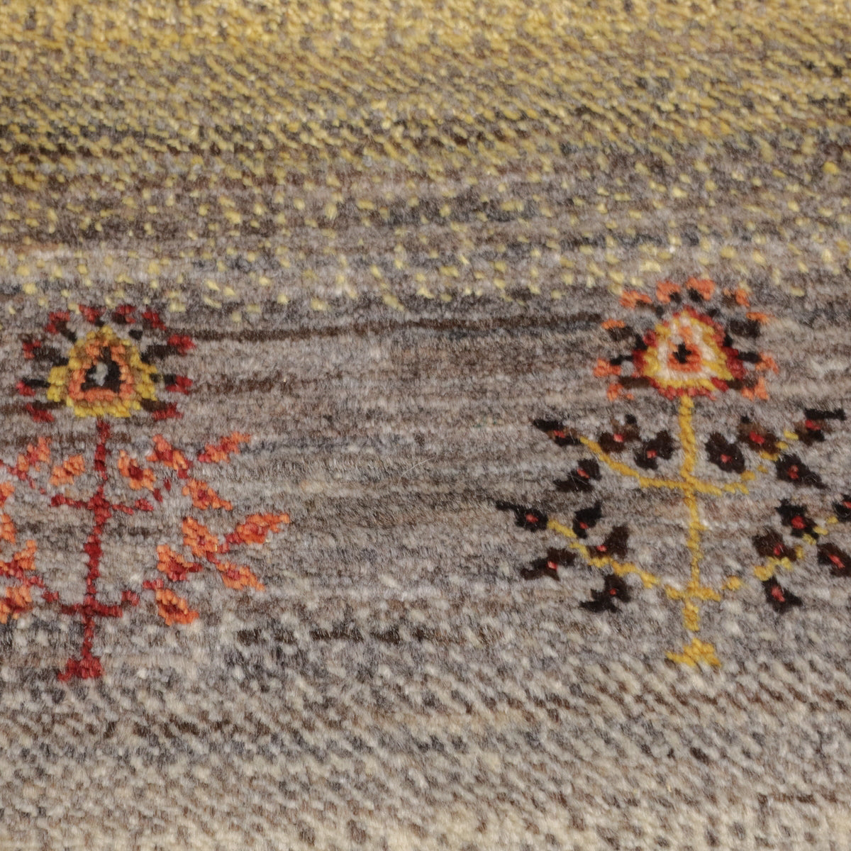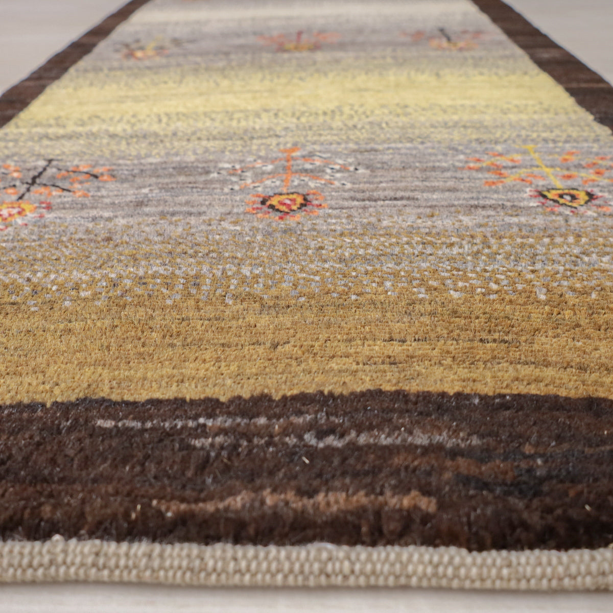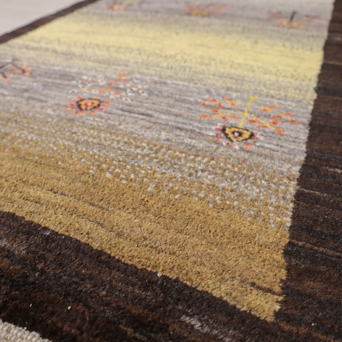 茶、グレー、黄、生成りのグラデーション(アブラシ)を基調にしたギャッベ。小さな花のモチーフには鮮やかな橙や深い赤が使われ、素朴で美しいアクセントになっています。お部屋をモダンな雰囲気で彩ってくれる一枚です。
