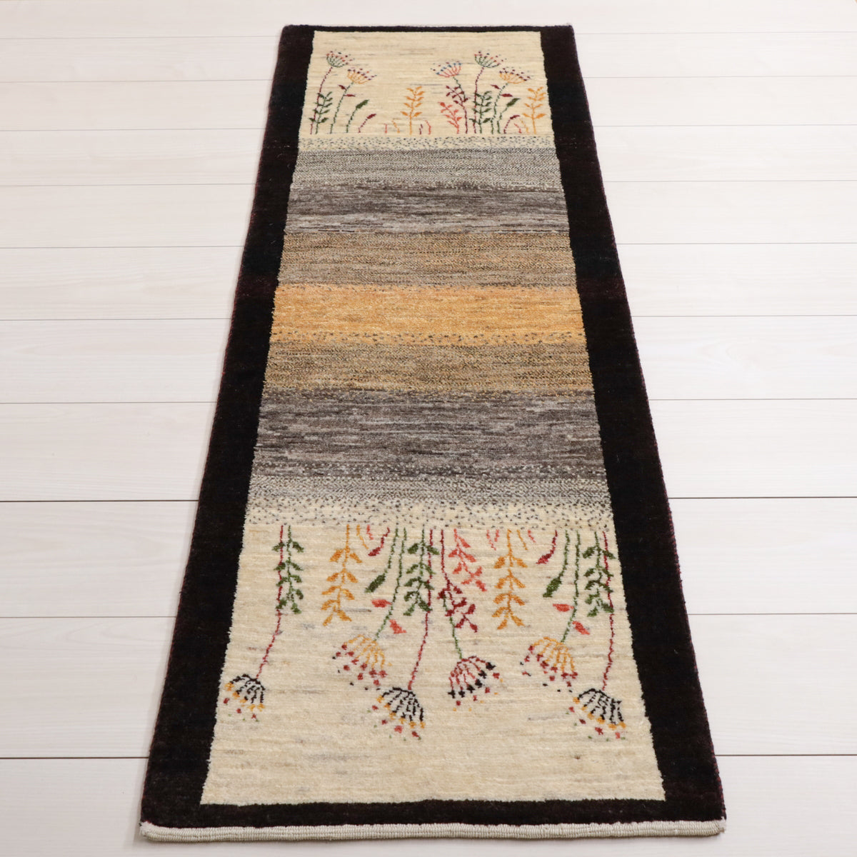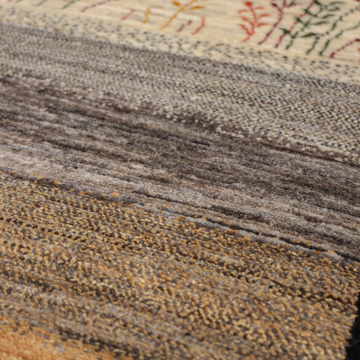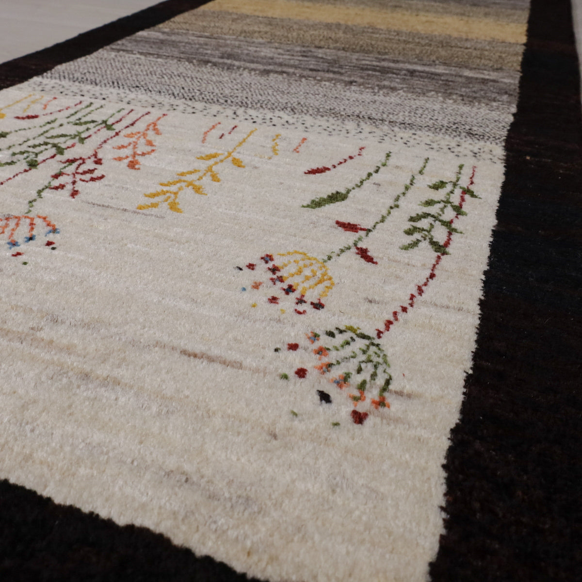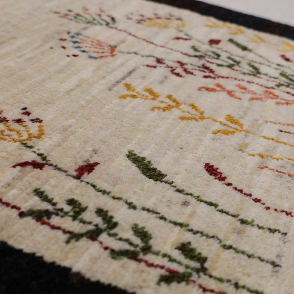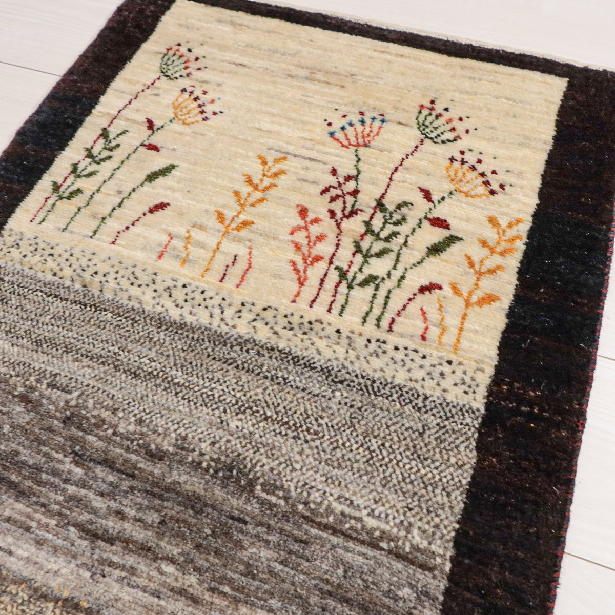 羊の毛色を生かした生成りとグレーのグラデーション(アブラシ)を基調にしたギャッベ。上下にはパステル調の色彩で風に揺れる草花のモチーフが描かれ、全体にとても優しい雰囲気です。自然の美しさと安らぎを感じさせるような、細部にまでこだわったデザインの一枚です。