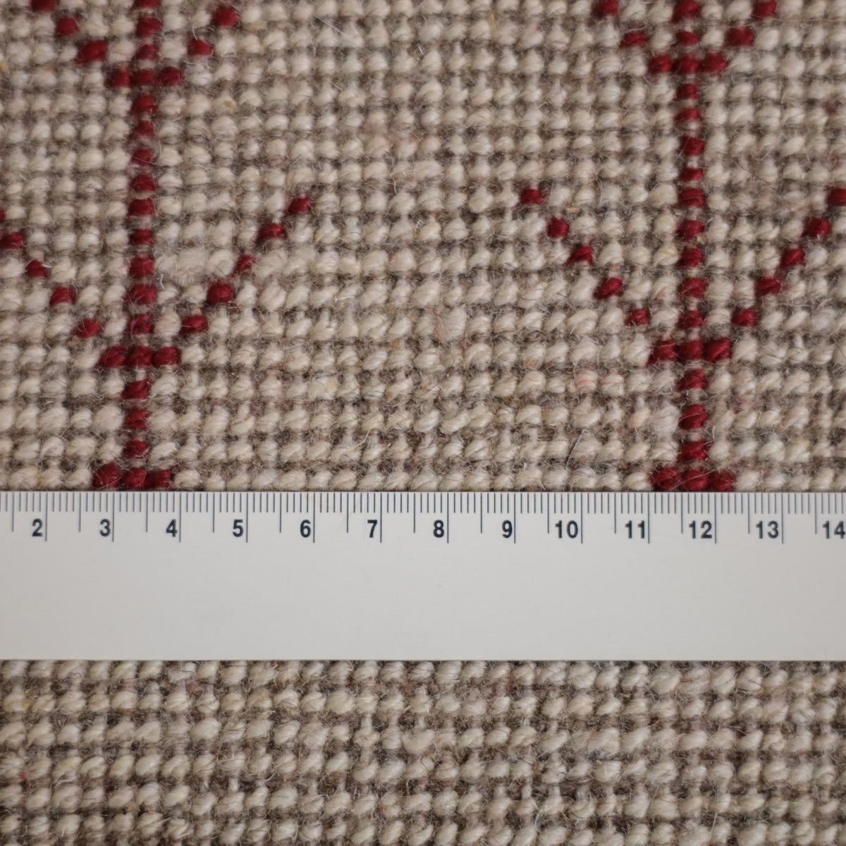 羊の毛色を生かした生成りを基調に、縁取りと中央の葉のモチーフの深い赤が美しく映えています。シンプルながらも可愛らしいデザインが、お部屋に温かみと華やかさを感じさせます。