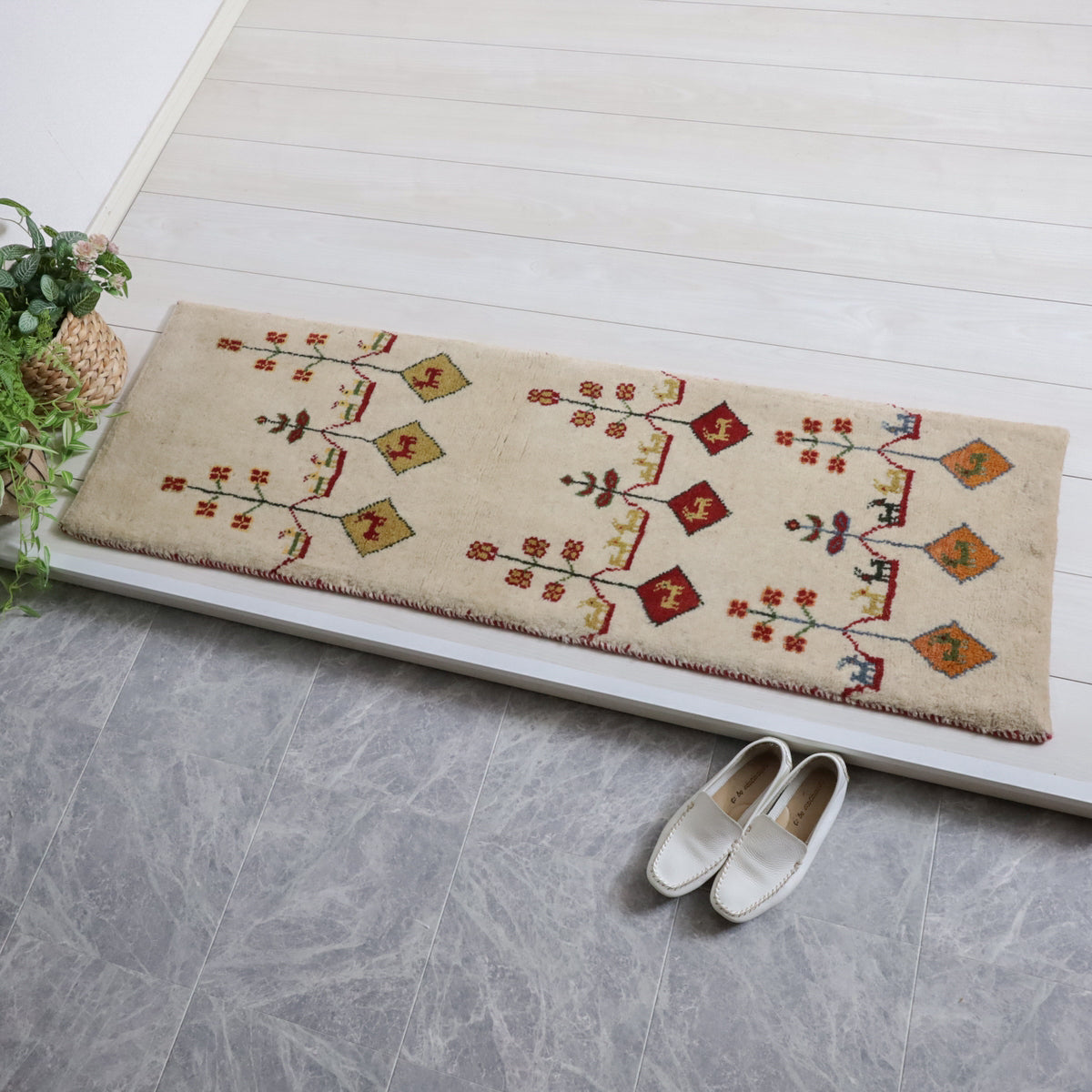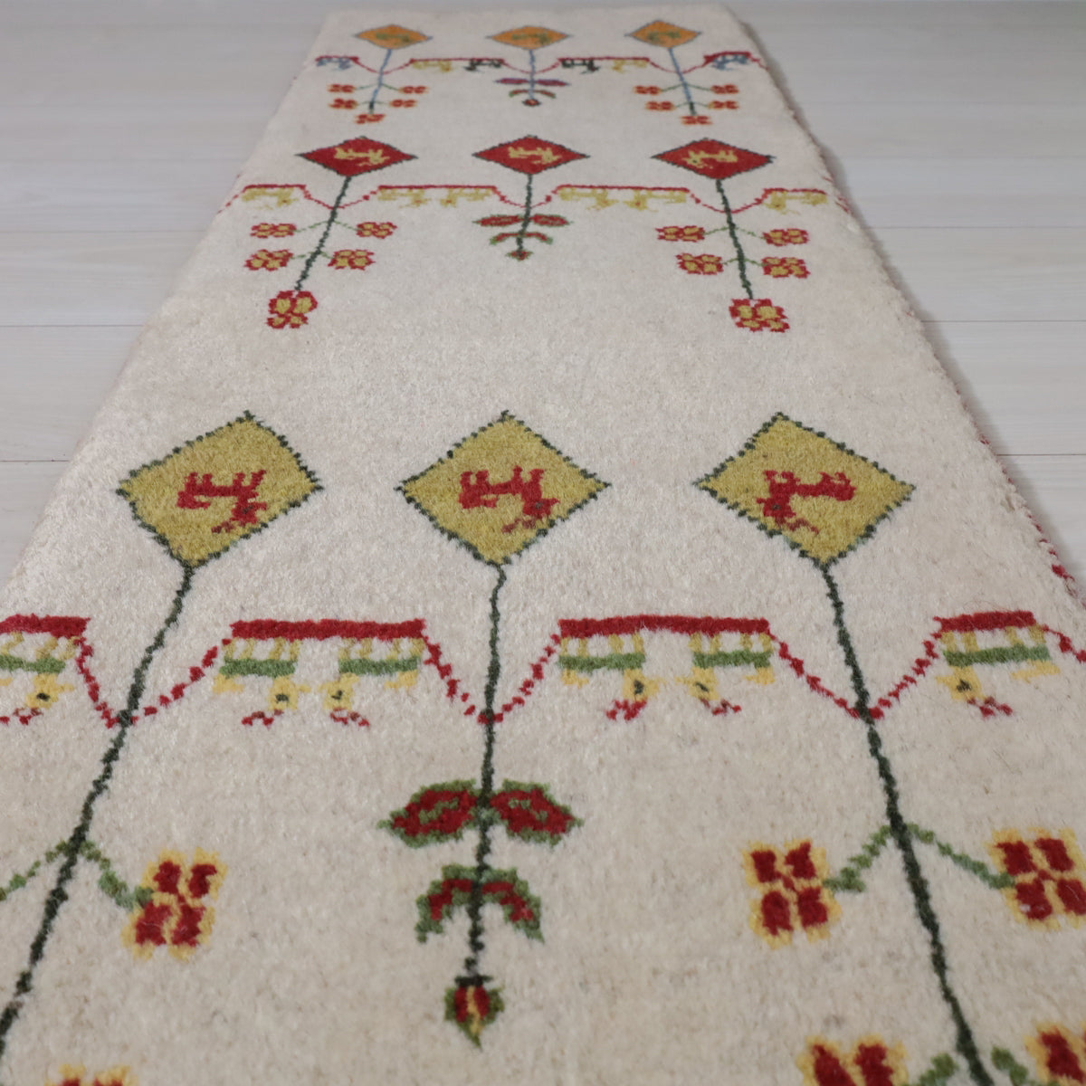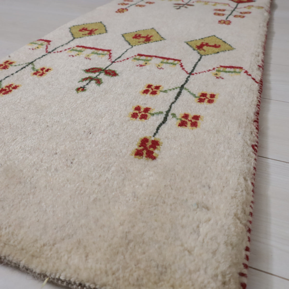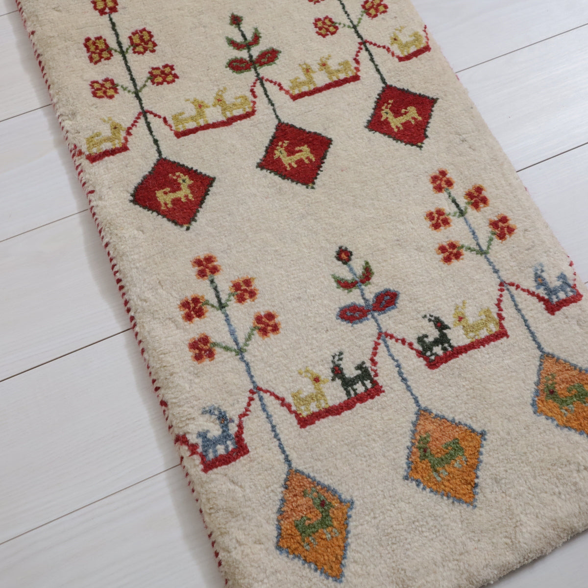 羊の毛色を生かした生成りを基調にしたギャッベです。オレンジや黄色の菱形のモチーフが並び、赤や緑の花や動物のモチーフが描かれています。カラフルな色使いが魅力的で、お部屋に明るく楽しい雰囲気を演出します。