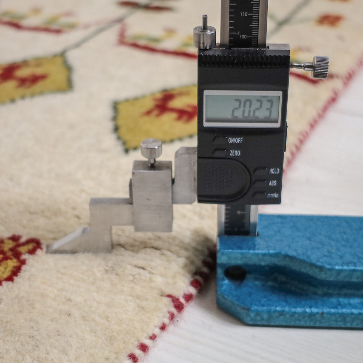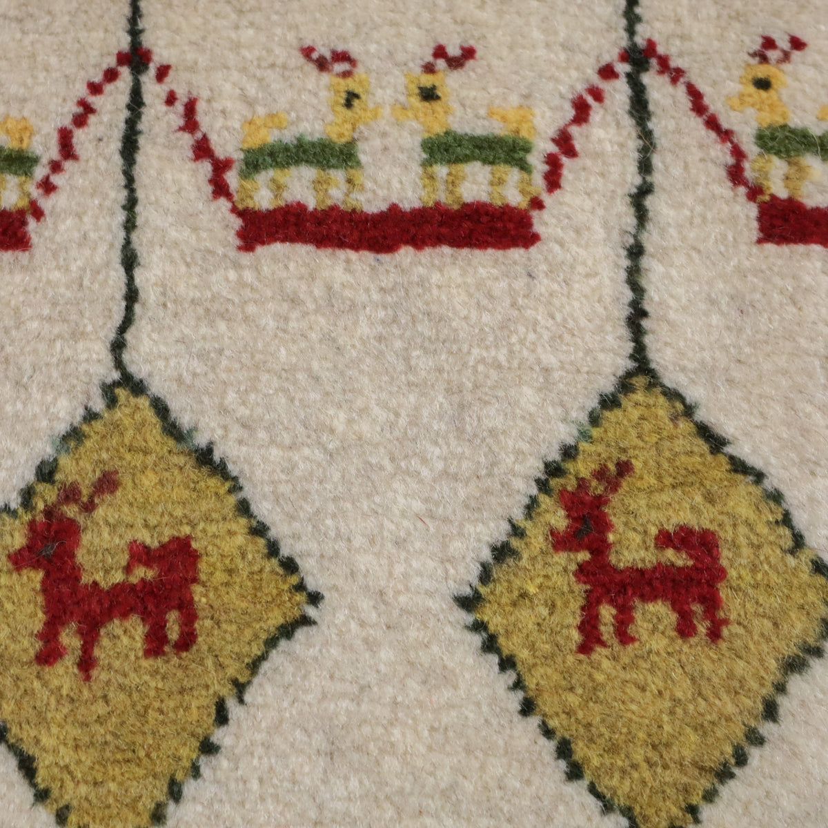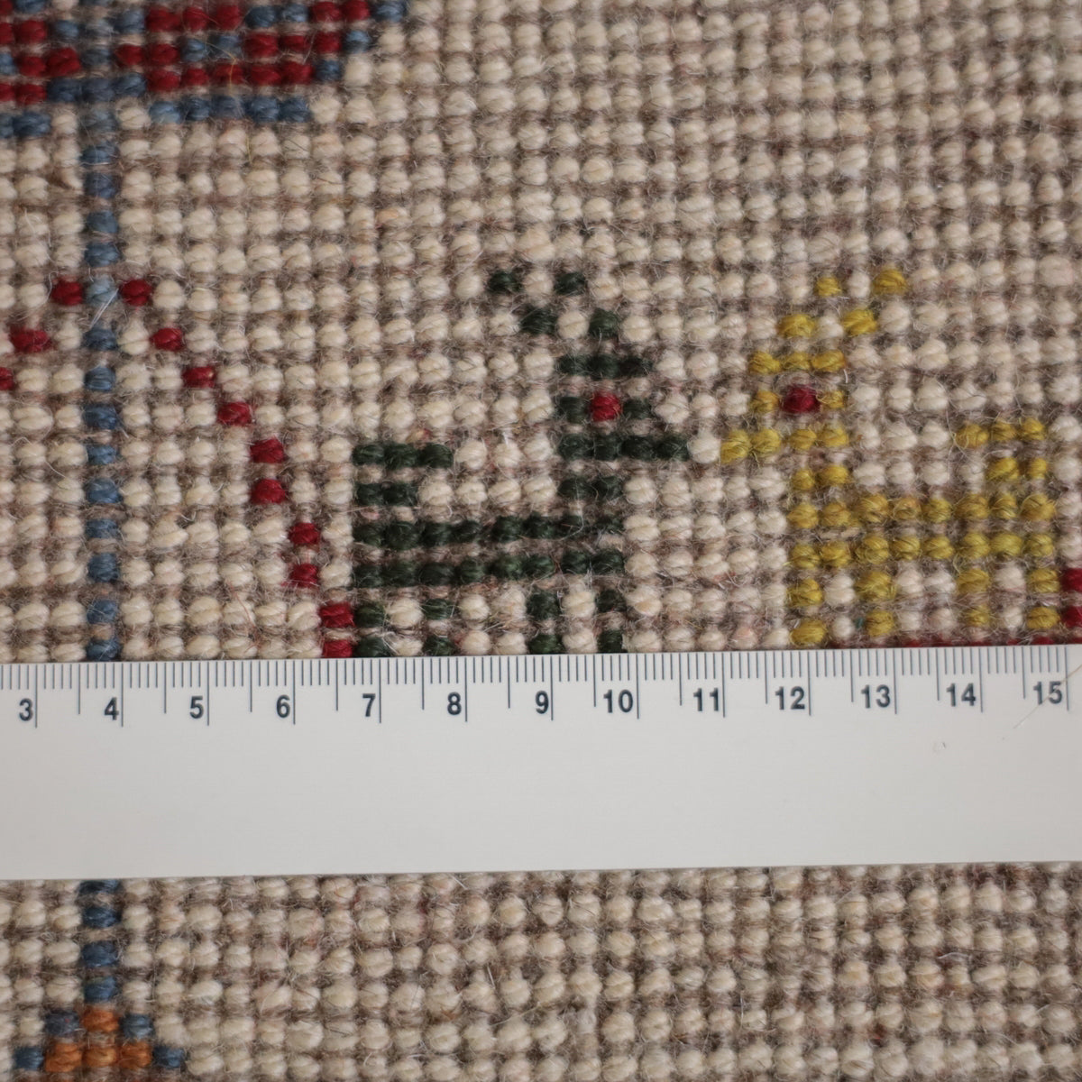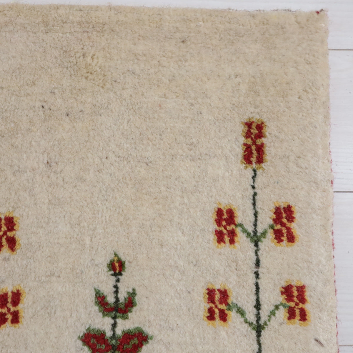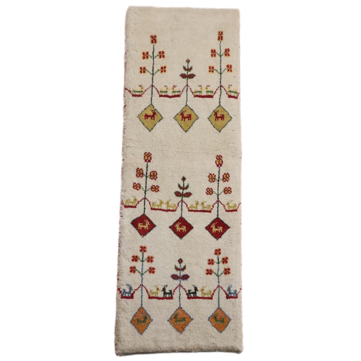 羊の毛色を生かした生成りを基調にしたギャッベです。オレンジや黄色の菱形のモチーフが並び、赤や緑の花や動物のモチーフが描かれています。カラフルな色使いが魅力的で、お部屋に明るく楽しい雰囲気を演出します。