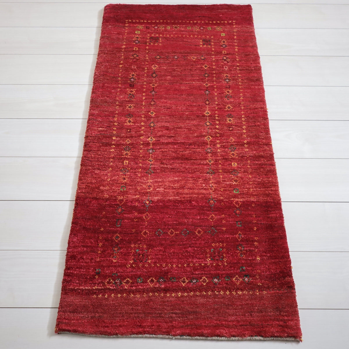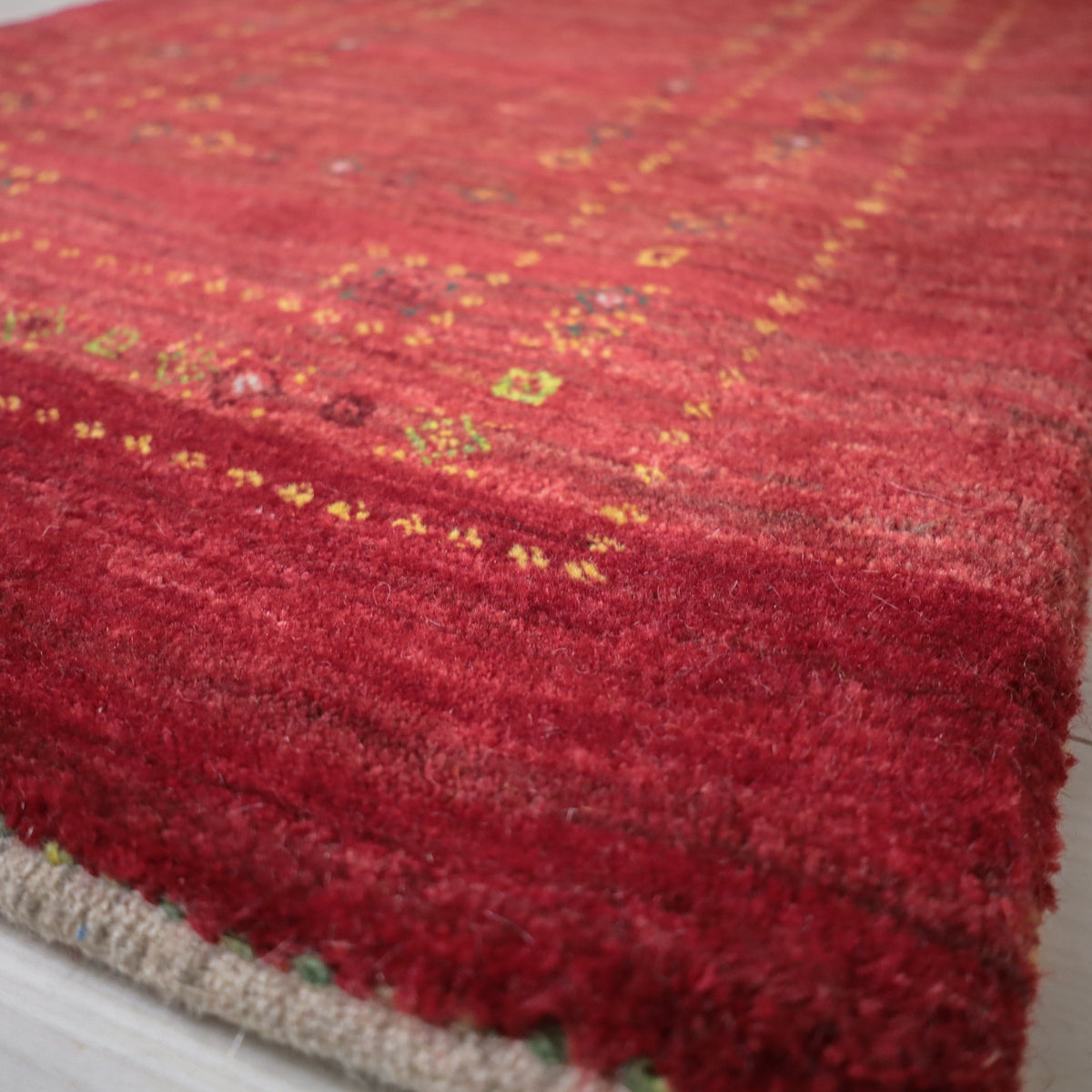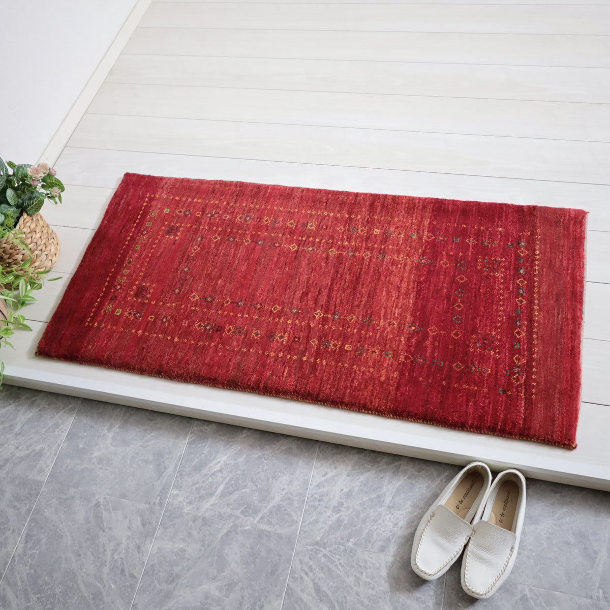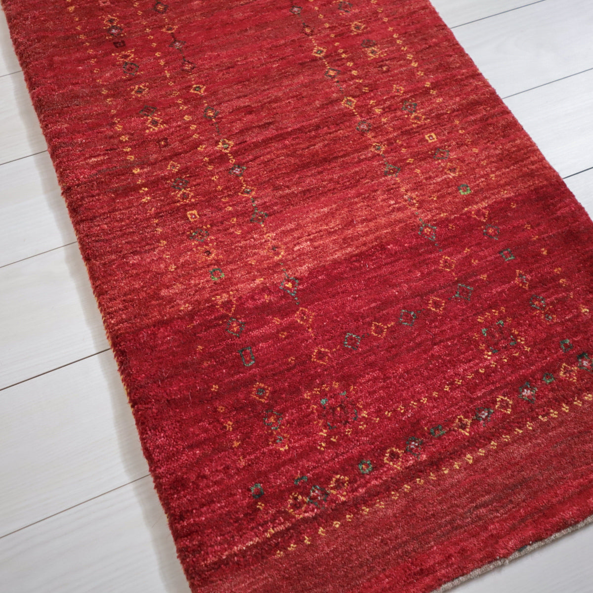 深い赤を基調に、細やかな幾何学模様が描かれたシンプルなデザインが美しいギャッベ。温かみと華やかさを感じさせてくれる一枚です。