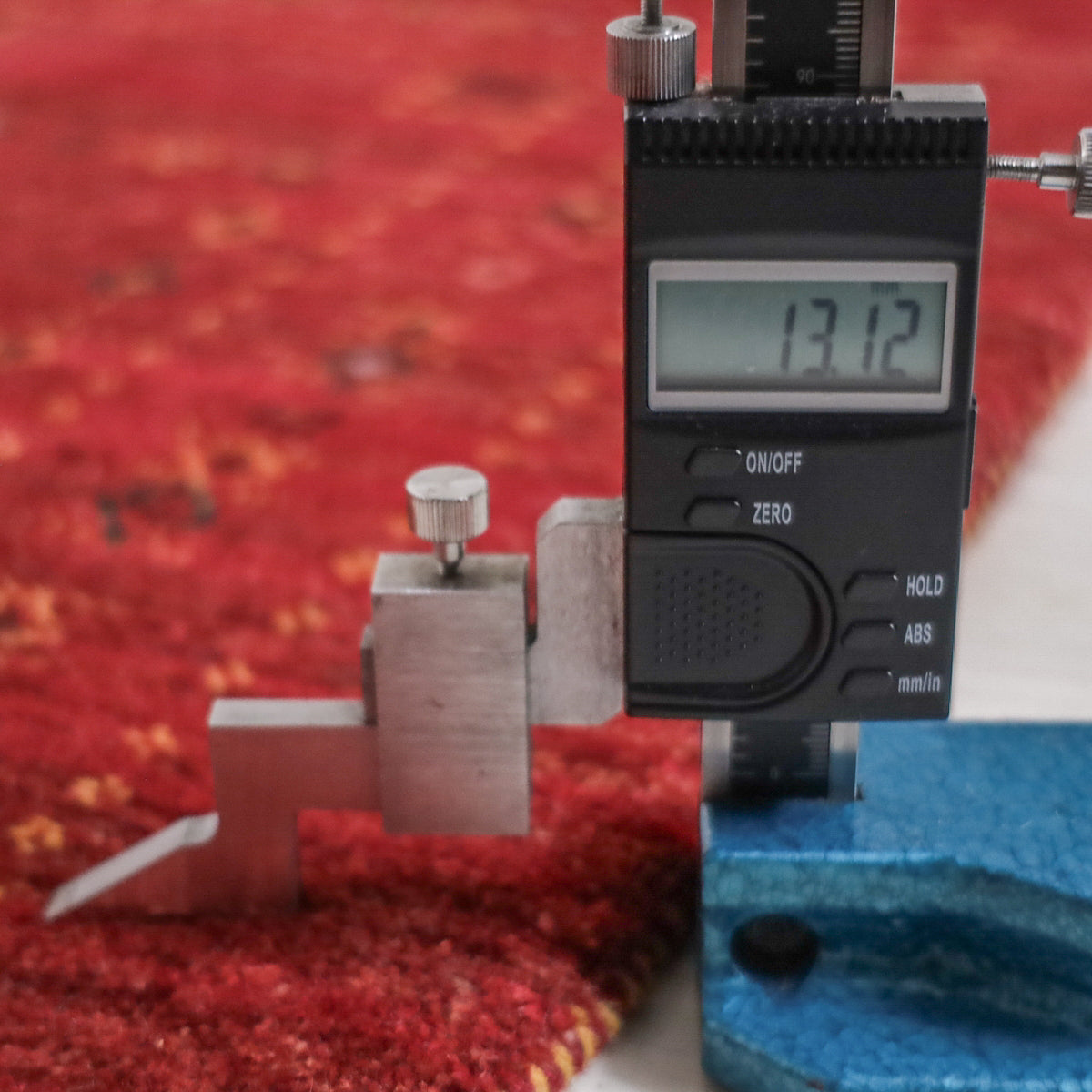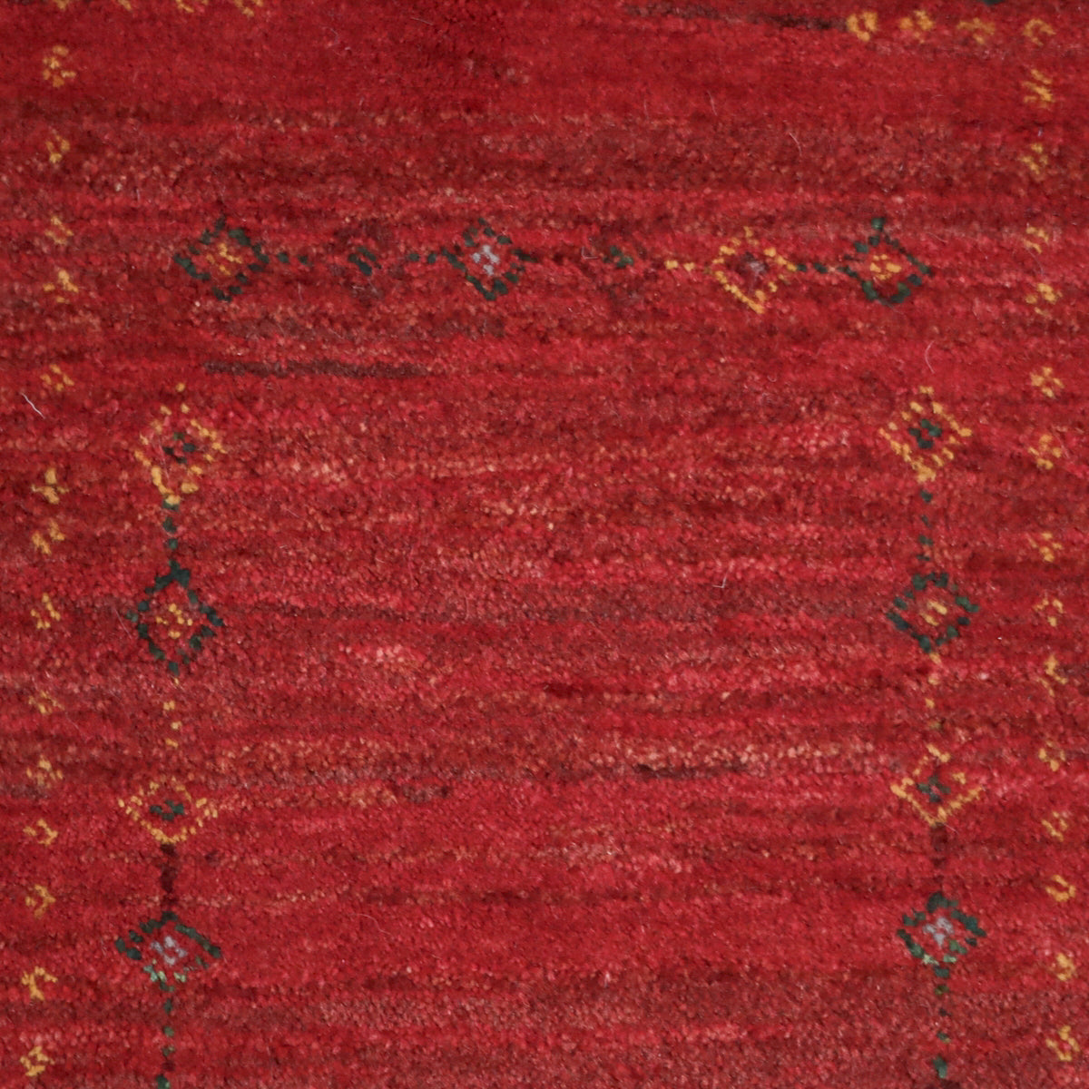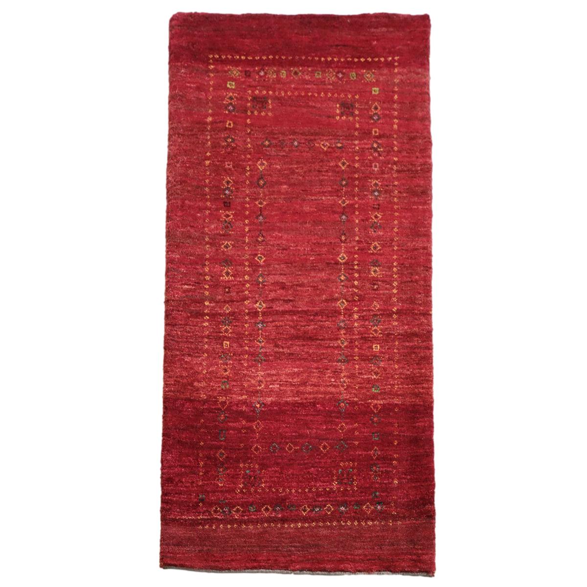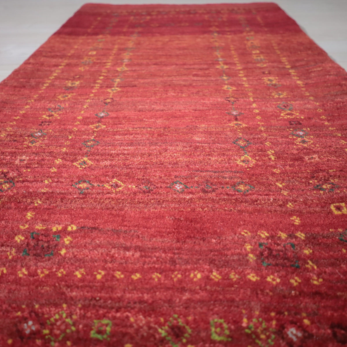 深い赤を基調に、細やかな幾何学模様が描かれたシンプルなデザインが美しいギャッベ。温かみと華やかさを感じさせてくれる一枚です。