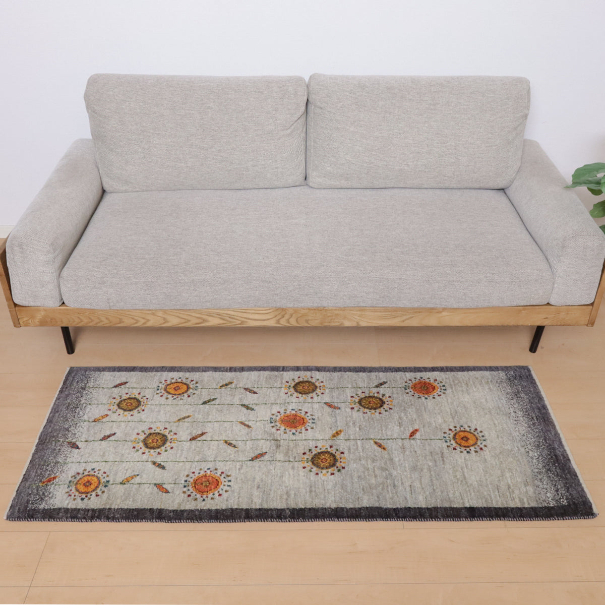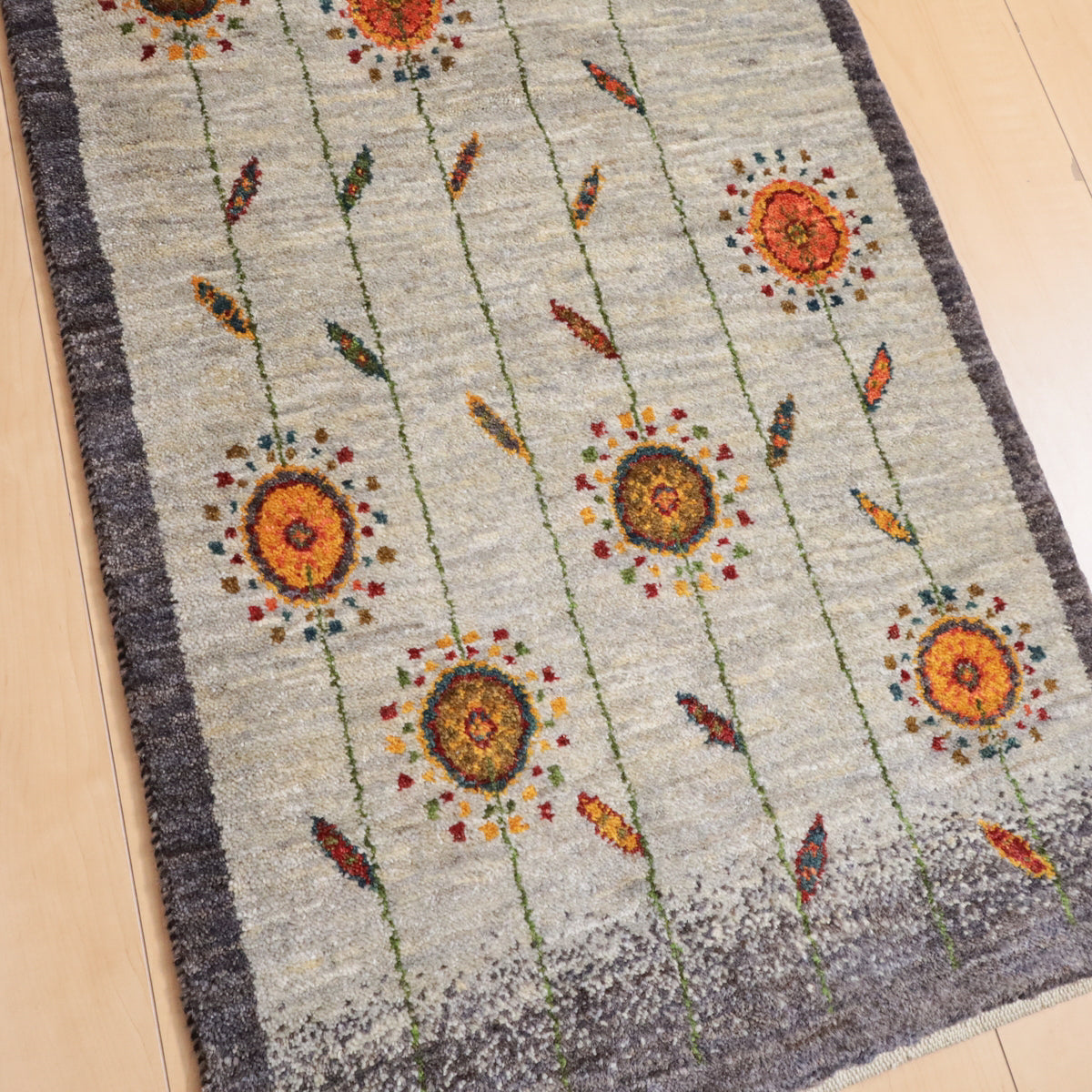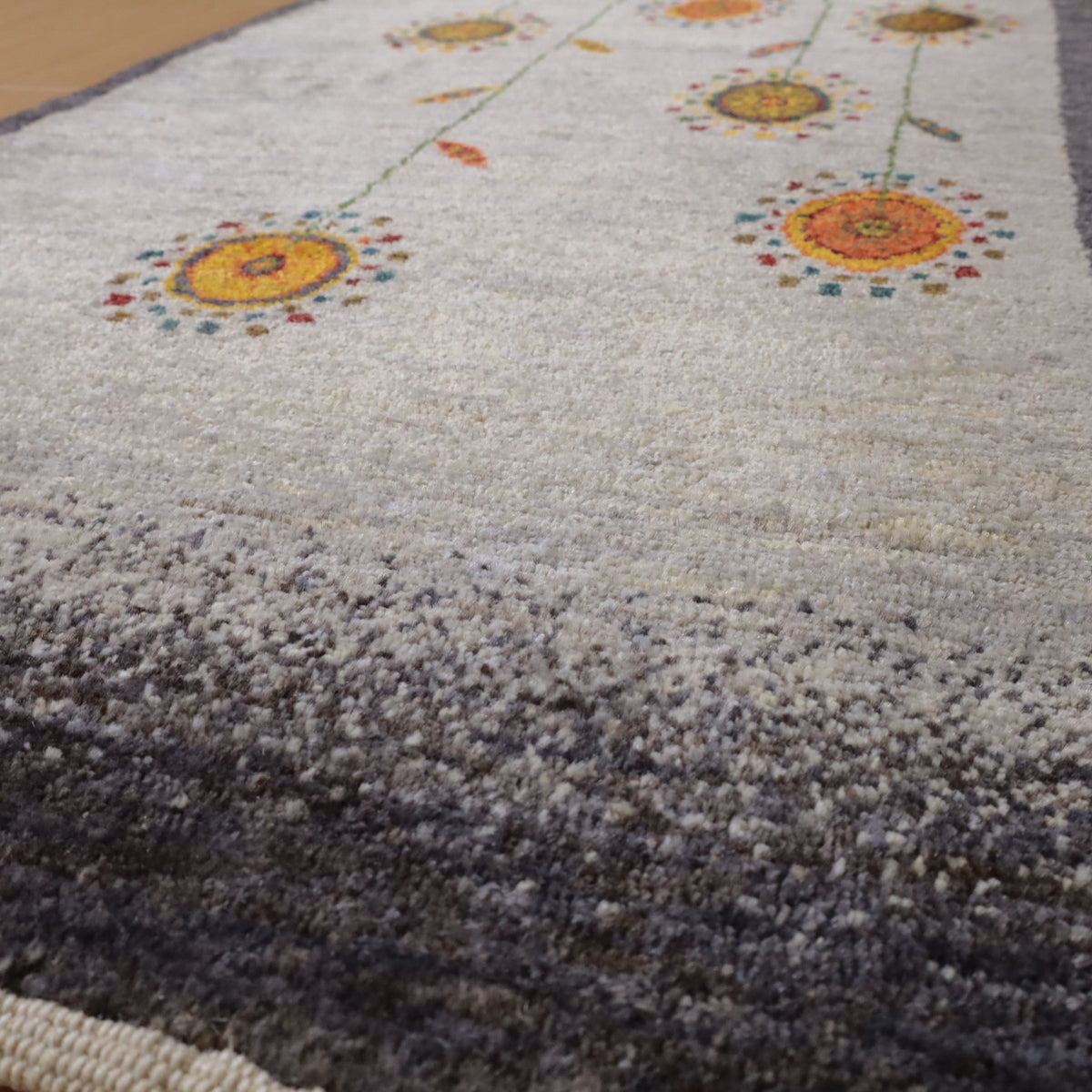灰色を基調にしたこのギャッベは、橙や黄色のカラフルな花のモチーフが印象的です。花の周りの小さな色とりどりの点が、全体に華やかさをプラスしています。落ち着いた色味でありつつも明るい空間を演出できる一枚です。