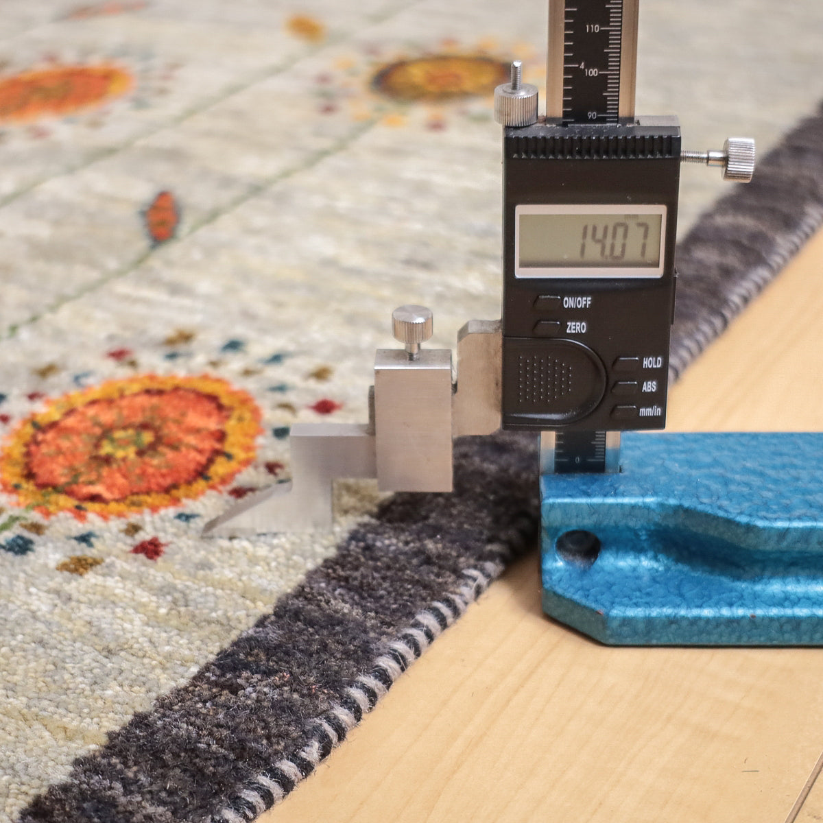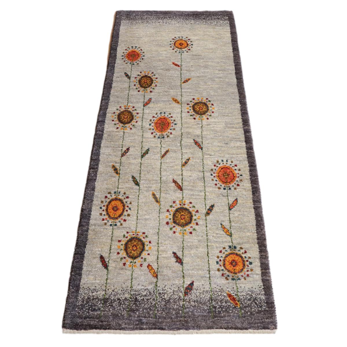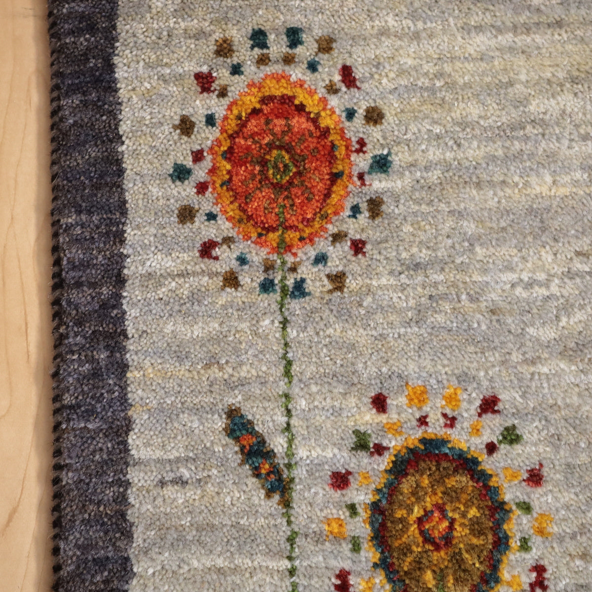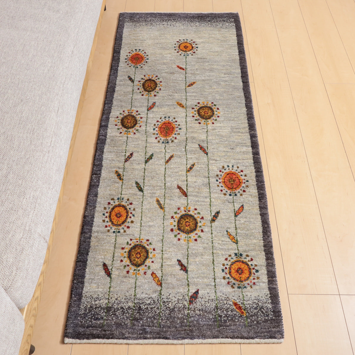 灰色を基調にしたこのギャッベは、橙や黄色のカラフルな花のモチーフが印象的です。花の周りの小さな色とりどりの点が、全体に華やかさをプラスしています。落ち着いた色味でありつつも明るい空間を演出できる一枚です。