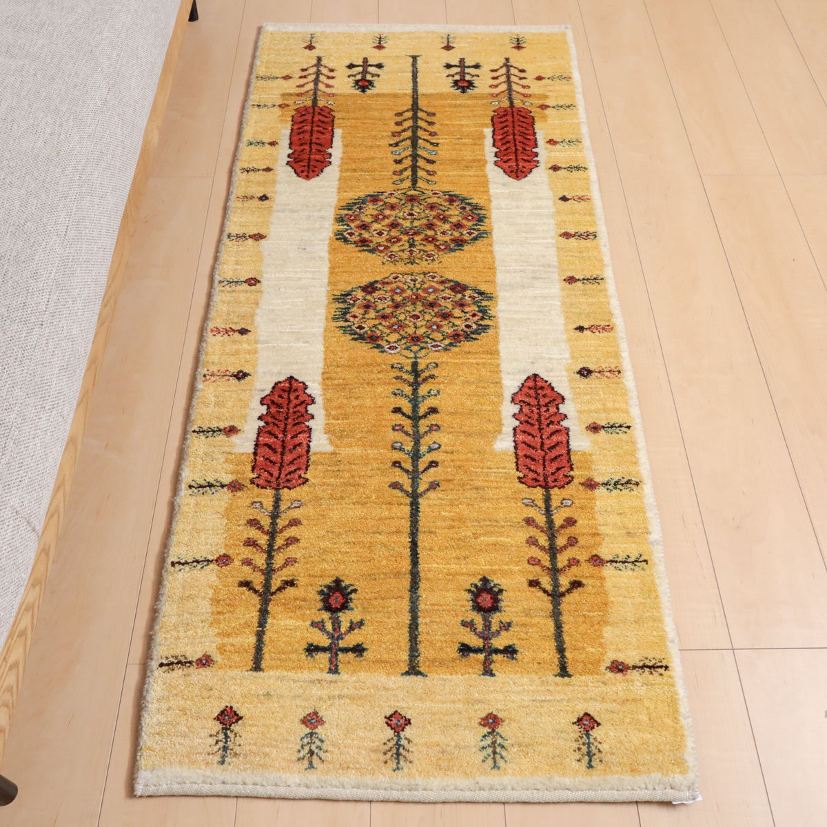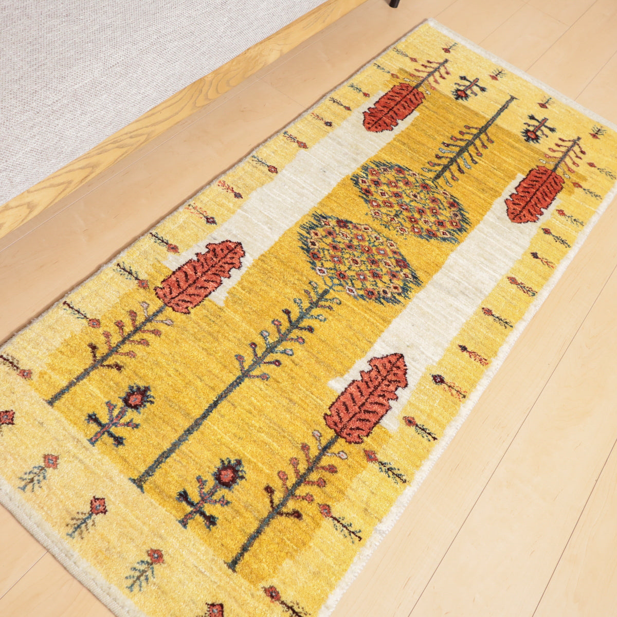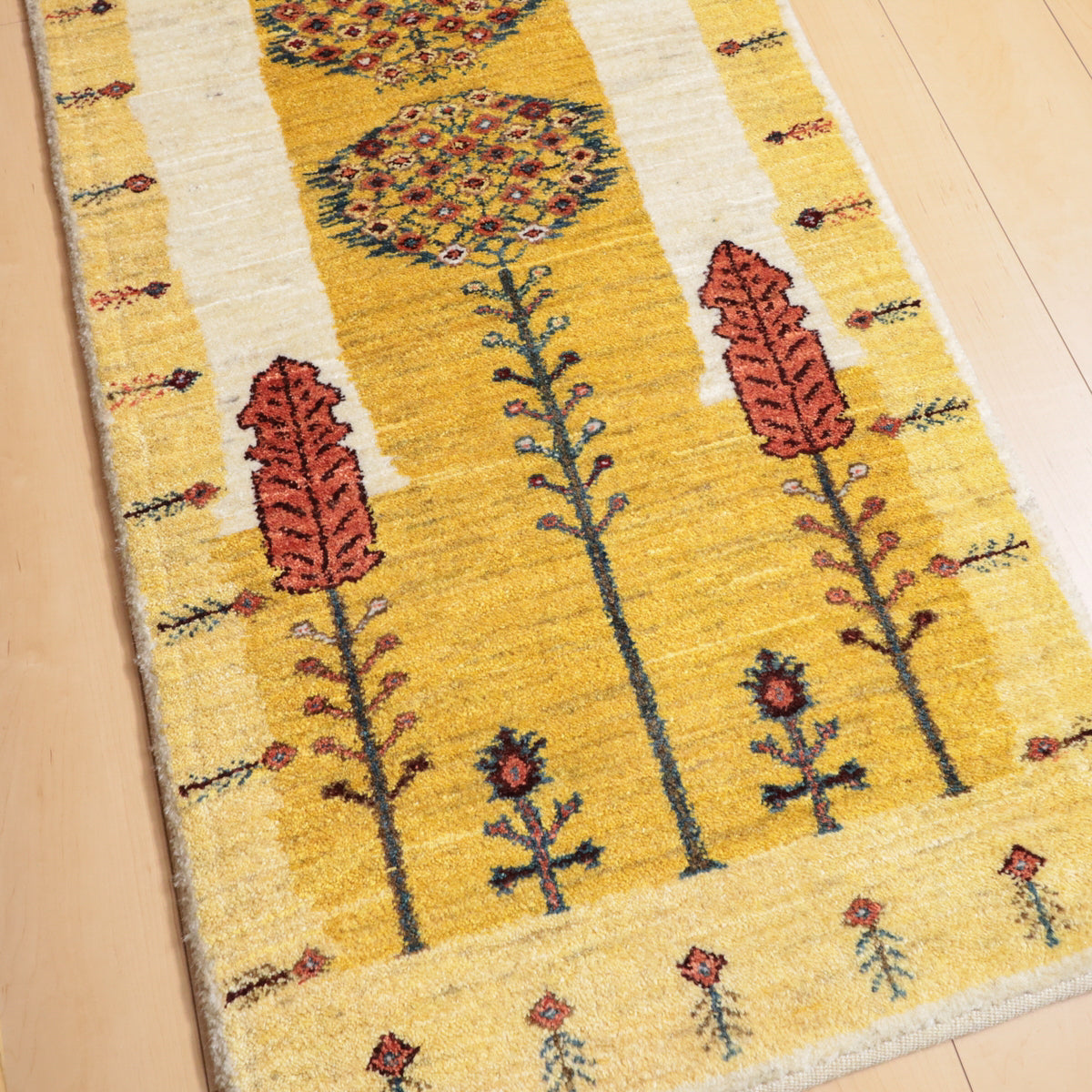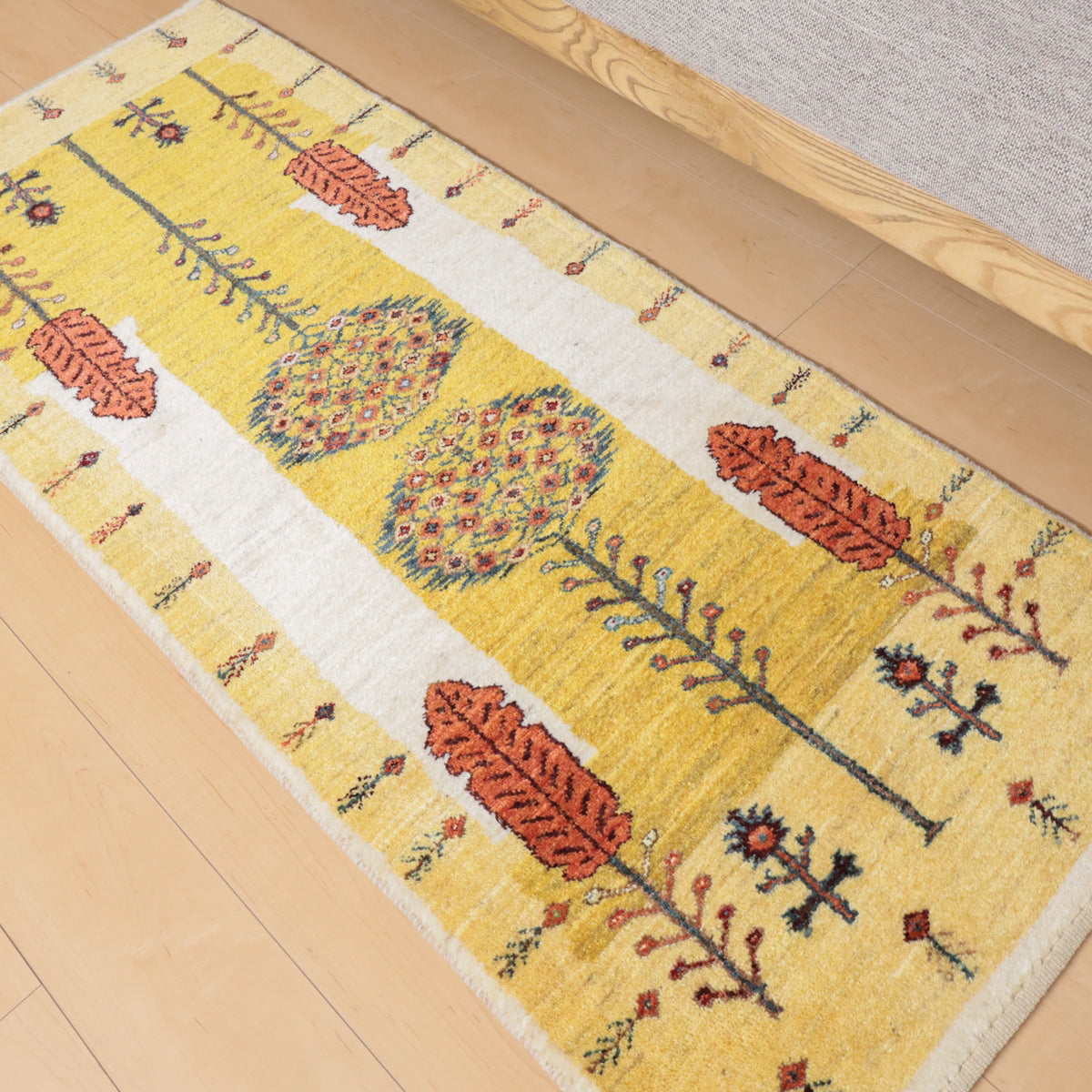 黄色を基調にしたこのギャッベは、カラフルな植物のモチーフが描かれた明るいデザインです。中央には色とりどりの花のモチーフが配置されています。お部屋に温かみと彩りを加えてくれる一枚です。