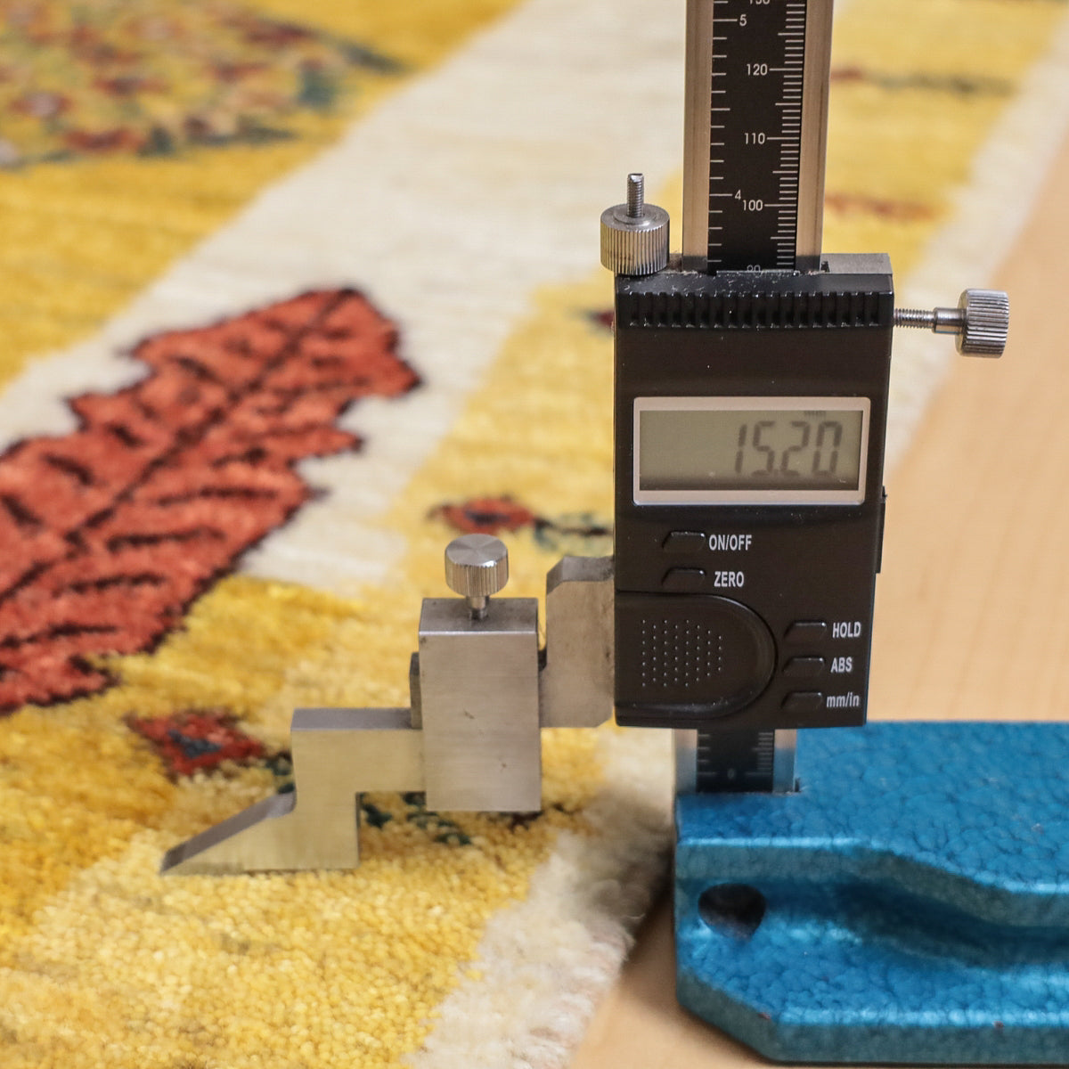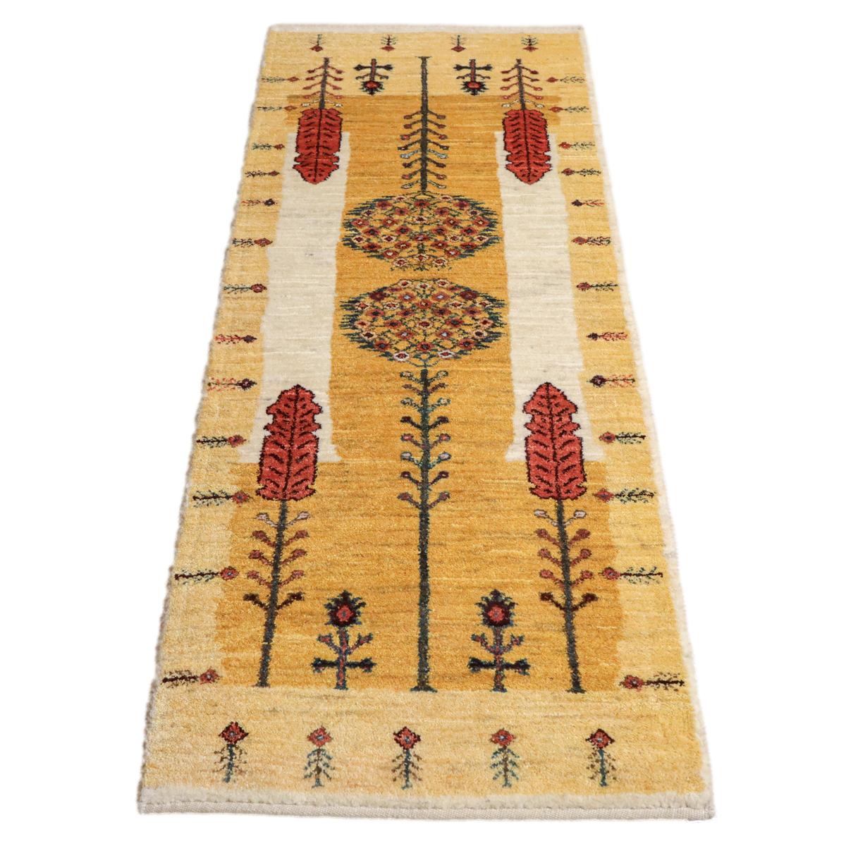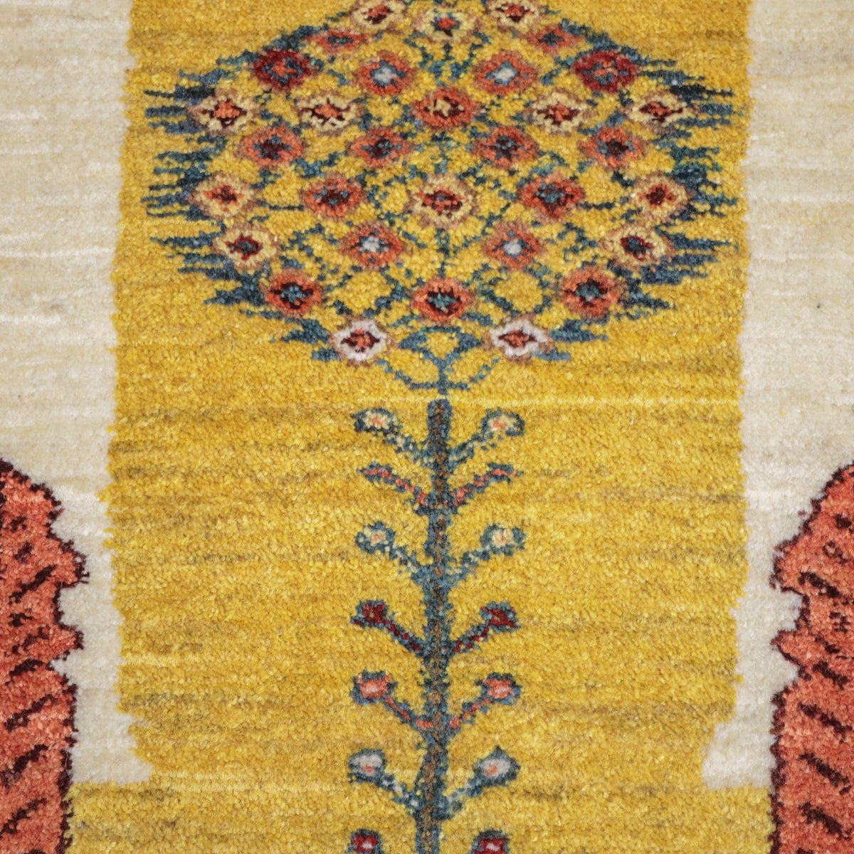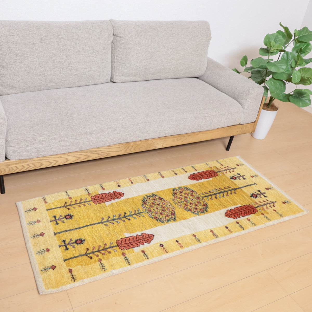 黄色を基調にしたこのギャッベは、カラフルな植物のモチーフが描かれた明るいデザインです。中央には色とりどりの花のモチーフが配置されています。お部屋に温かみと彩りを加えてくれる一枚です。