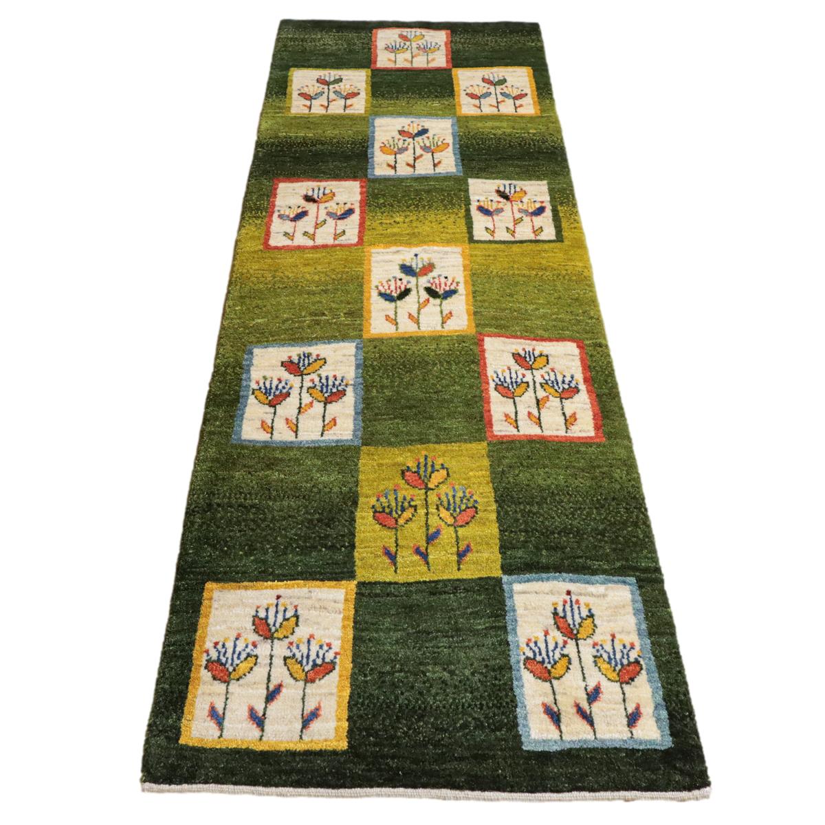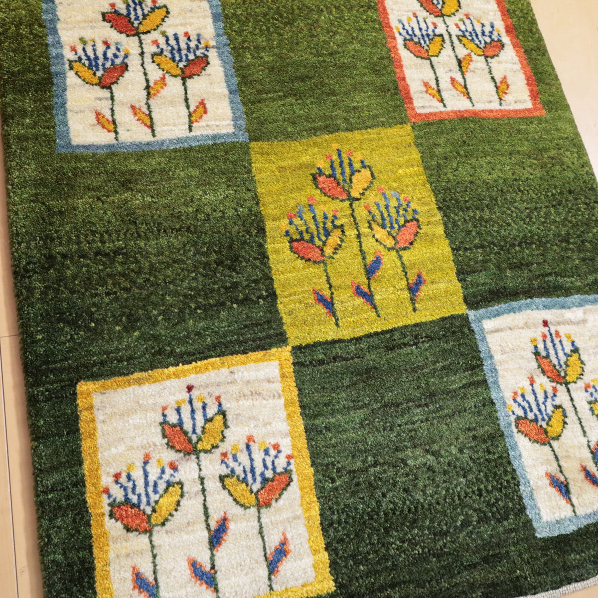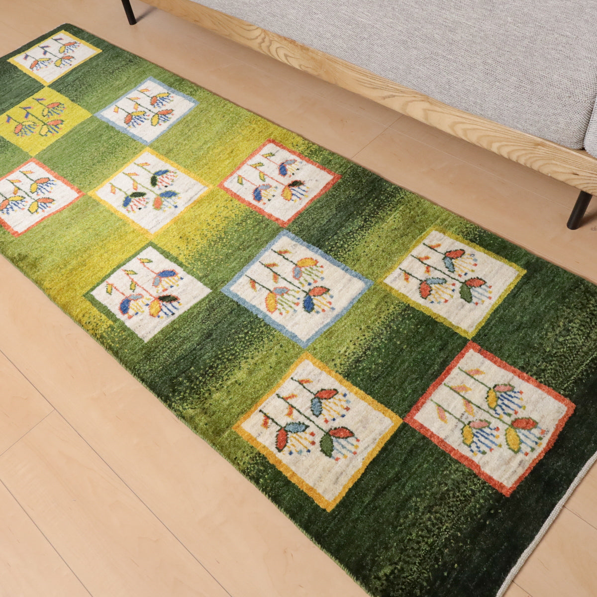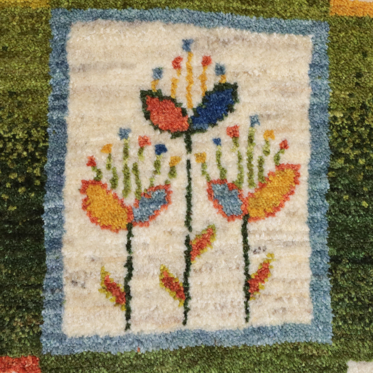 緑を基調にしたこのギャッベは、カラフルな花のモチーフが四角の模様内に描かれた印象的なデザインです。羊の毛色を生かした生成や橙、黄色の背景に咲く花々が、全体に楽しい雰囲気を醸し出しています。お部屋に華やかで温かみのある空間を演出してくれる一枚です。