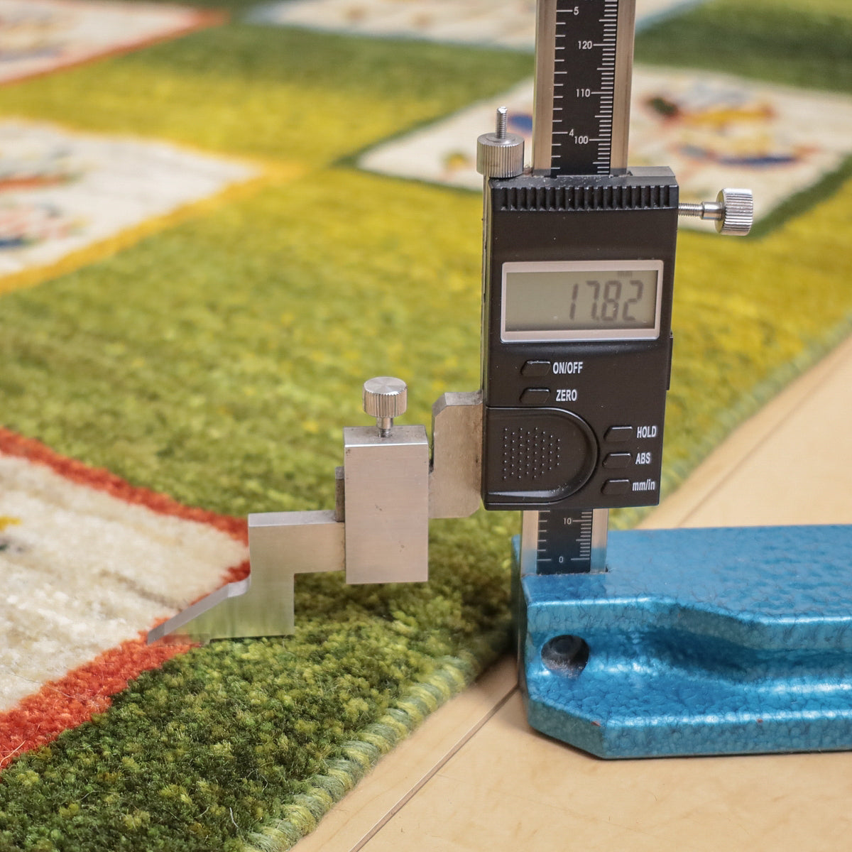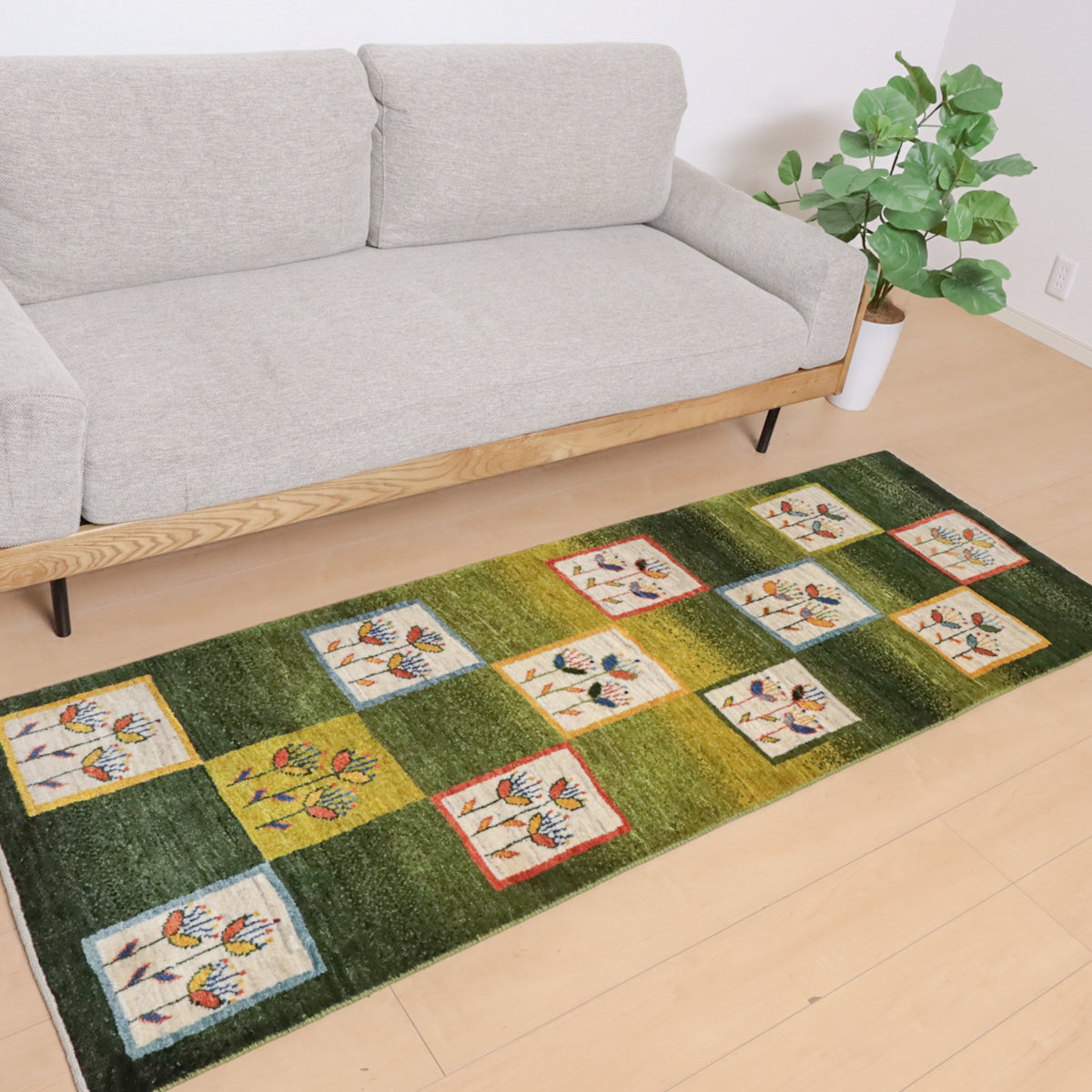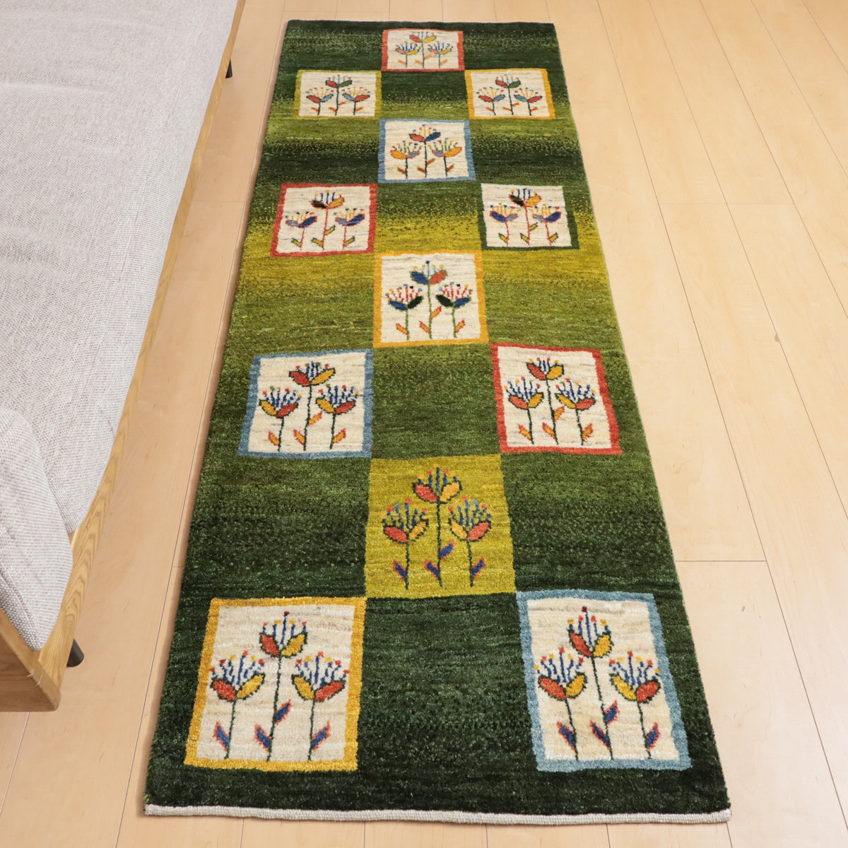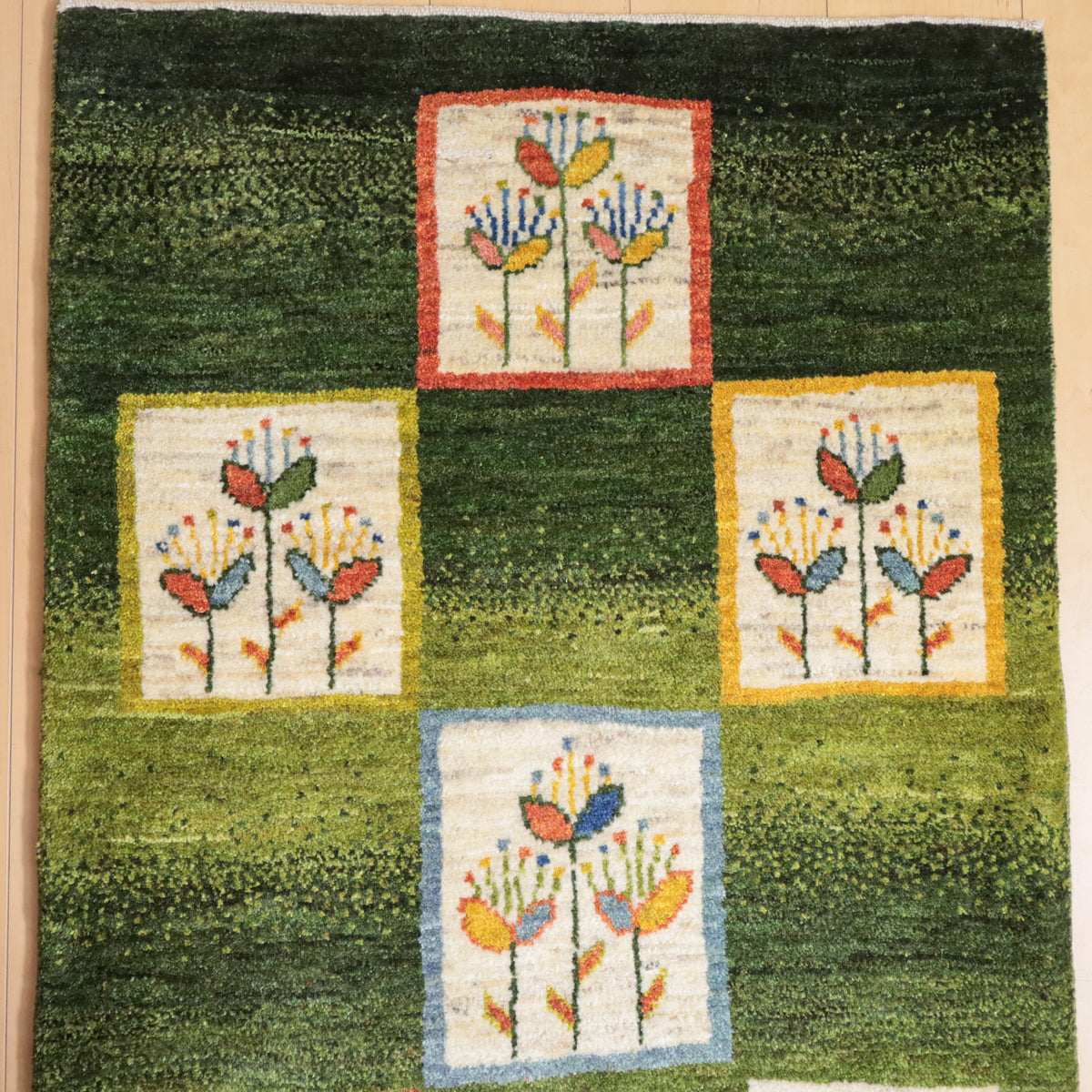 緑を基調にしたこのギャッベは、カラフルな花のモチーフが四角の模様内に描かれた印象的なデザインです。羊の毛色を生かした生成や橙、黄色の背景に咲く花々が、全体に楽しい雰囲気を醸し出しています。お部屋に華やかで温かみのある空間を演出してくれる一枚です。