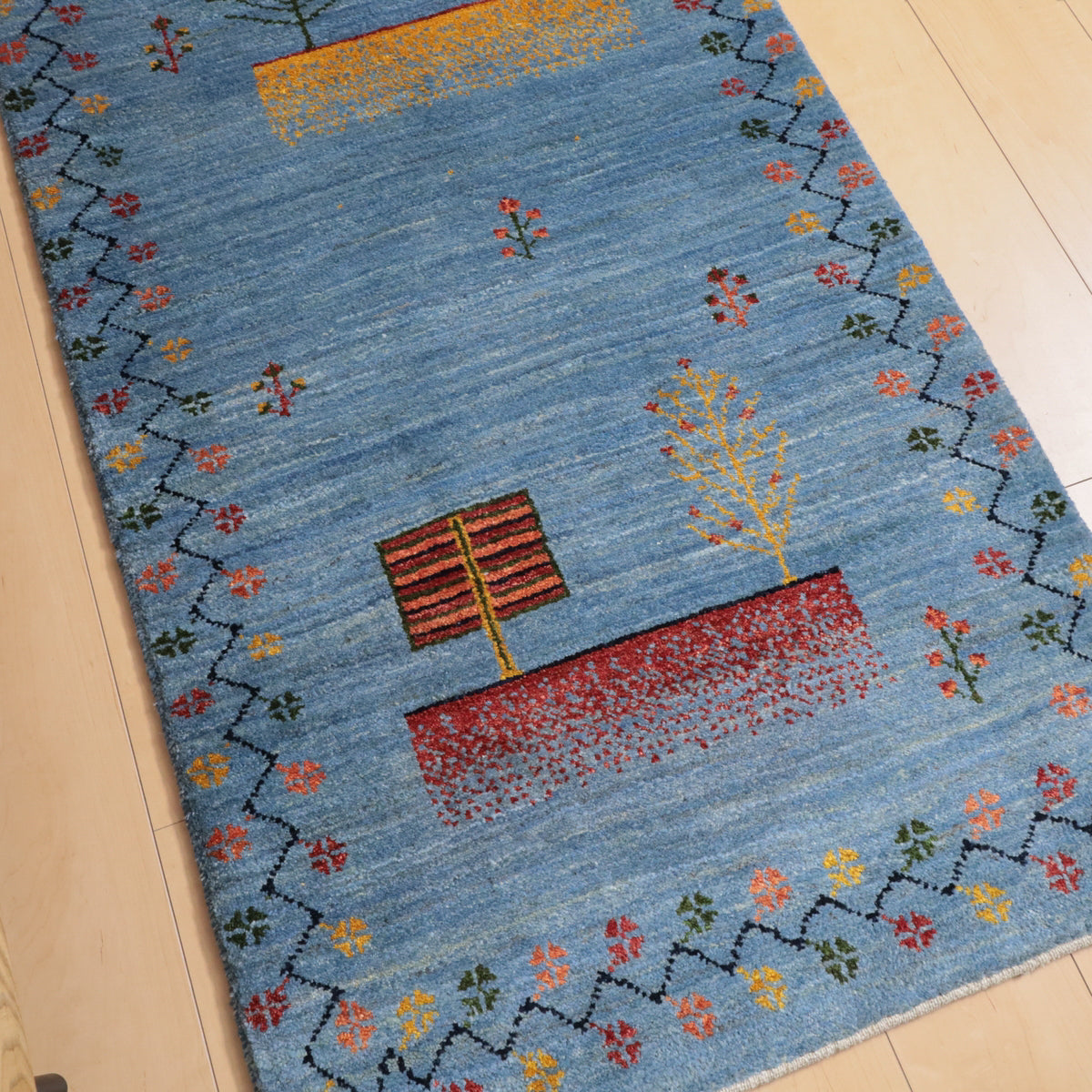 優しい青を基調にしたこのギャッベは、カラフルな木々が幾何学模様にデザイン化されてとても印象的です。周囲にはカラフルな花模様のフレームが全体を引き締めています。落ち着いた色味ながら、個性的で楽しい雰囲気を感じさせてくれる一枚です。