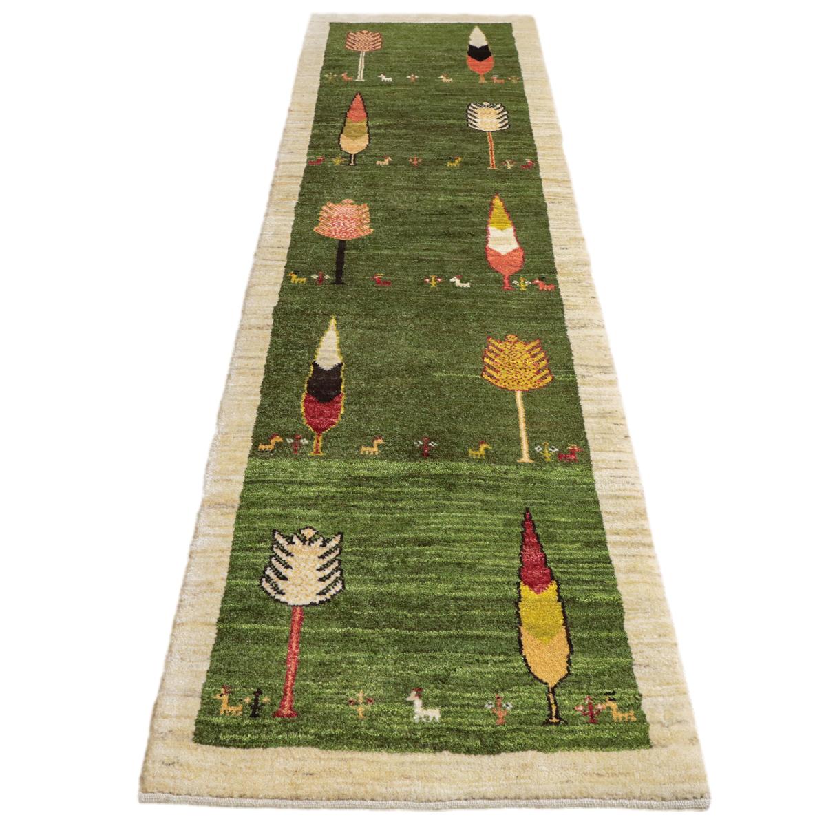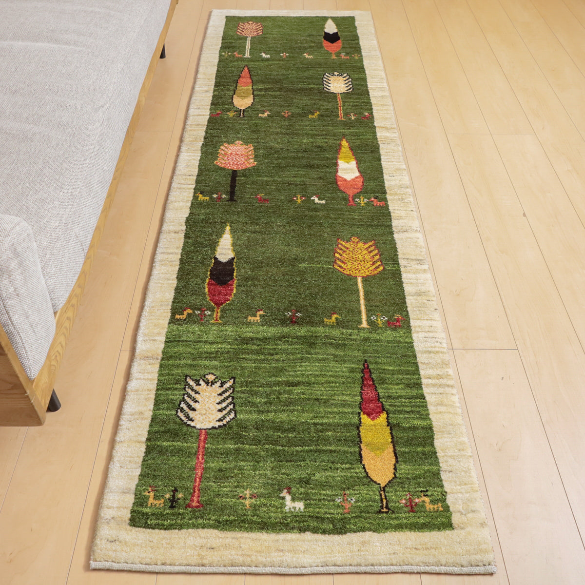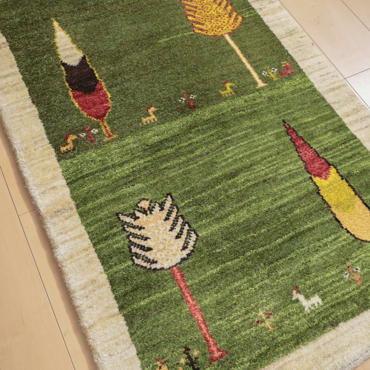 緑を基調にしたこのギャッベ。デザイン化されたカラフルな木々や小さな動物のモチーフがモダンな印象です。赤や黄色、橙の鮮やかな色彩の木々が全体に配置され、その根元には小さな動物たちが列をなしています。お部屋に明るく温かみのある空間を演出する一枚です。