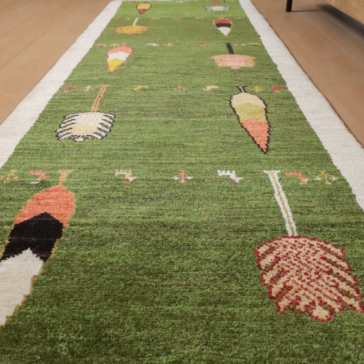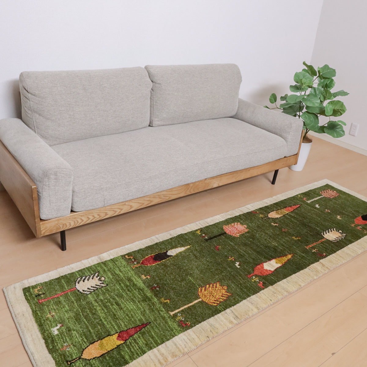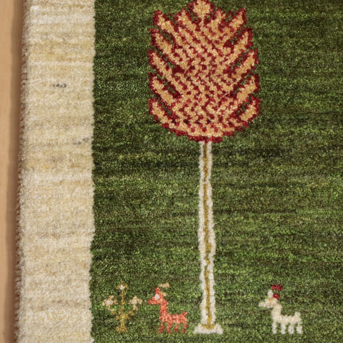 緑を基調にしたこのギャッベ。デザイン化されたカラフルな木々や小さな動物のモチーフがモダンな印象です。赤や黄色、橙の鮮やかな色彩の木々が全体に配置され、その根元には小さな動物たちが列をなしています。お部屋に明るく温かみのある空間を演出する一枚です。