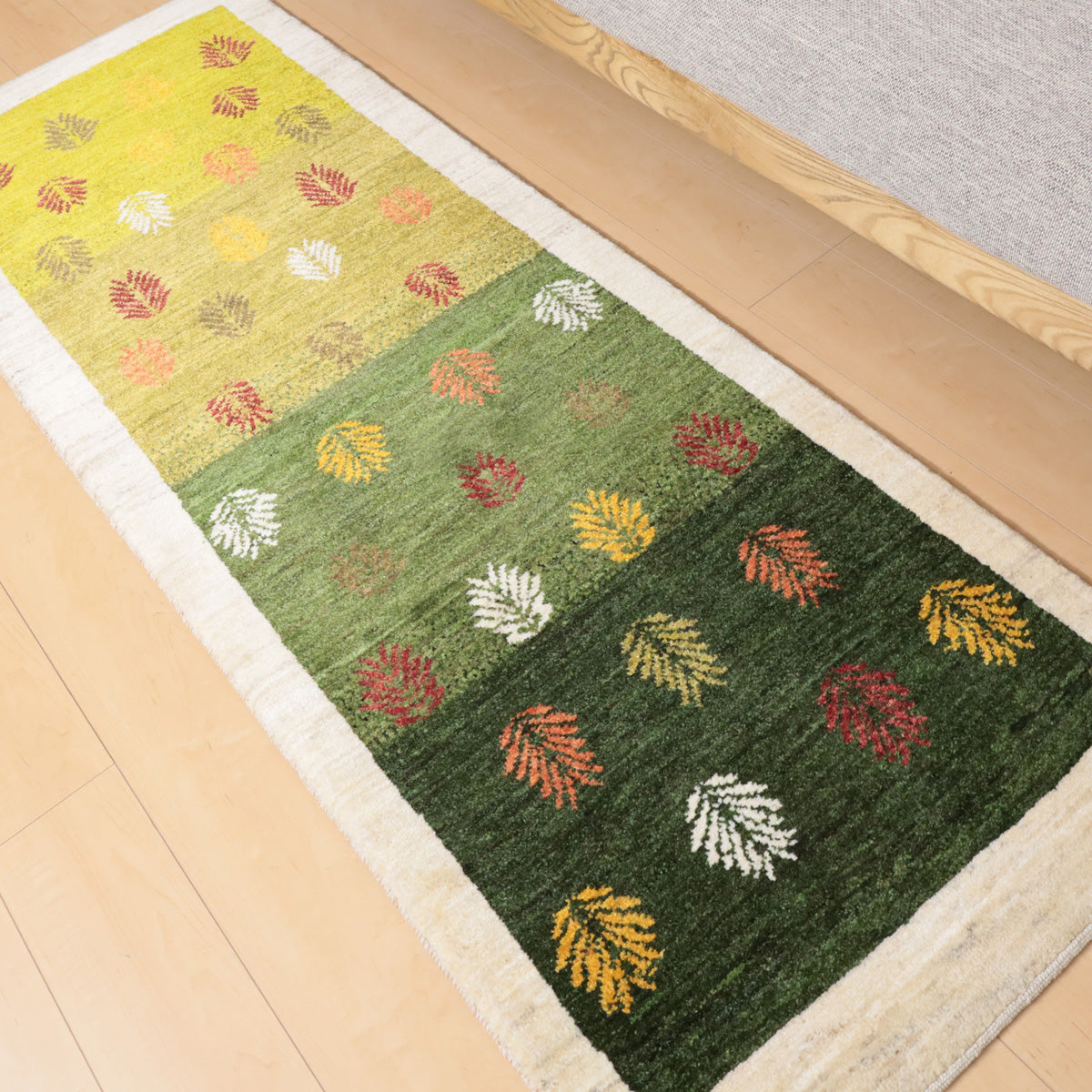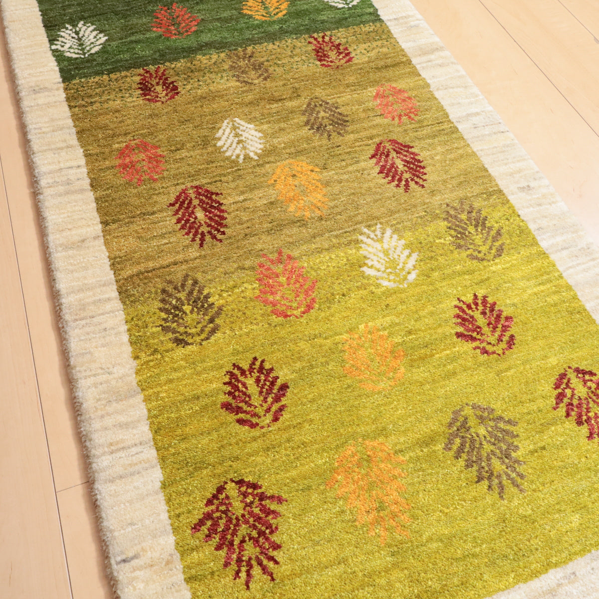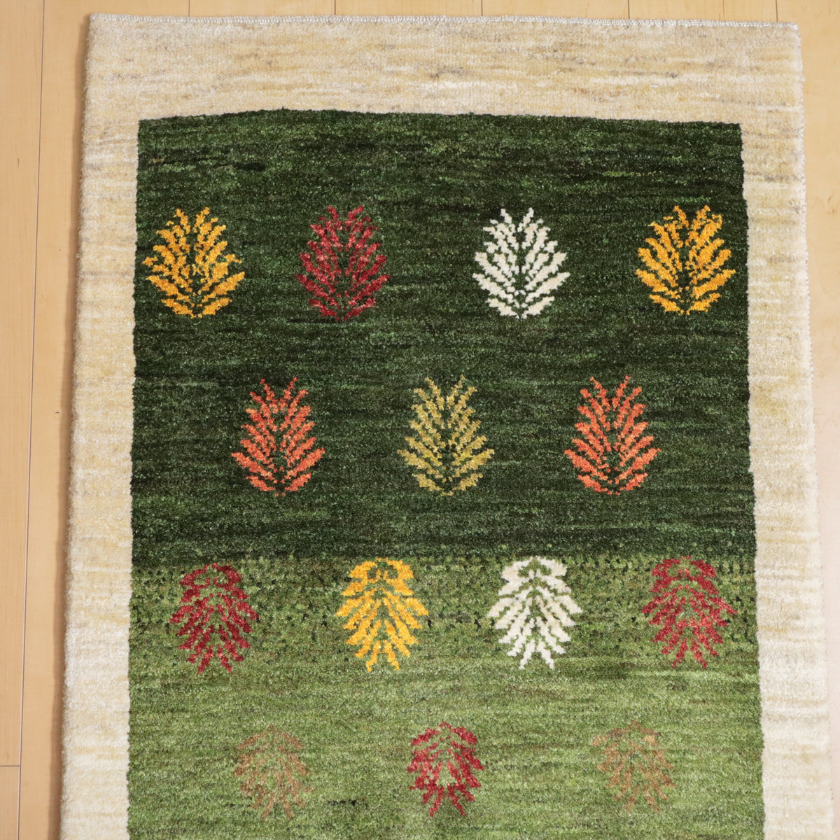 緑から黄緑へのグラデーションを基調にしたこのギャッベは、一面にカラフルな葉のモチーフが描かれた美しいデザインです。羊の毛色を生かした生成のフレームが全体を引き締め、落ち着いた雰囲気を与えています。お部屋に温かみと彩りを加え、豊かな自然を感じさせてくれる一枚です。