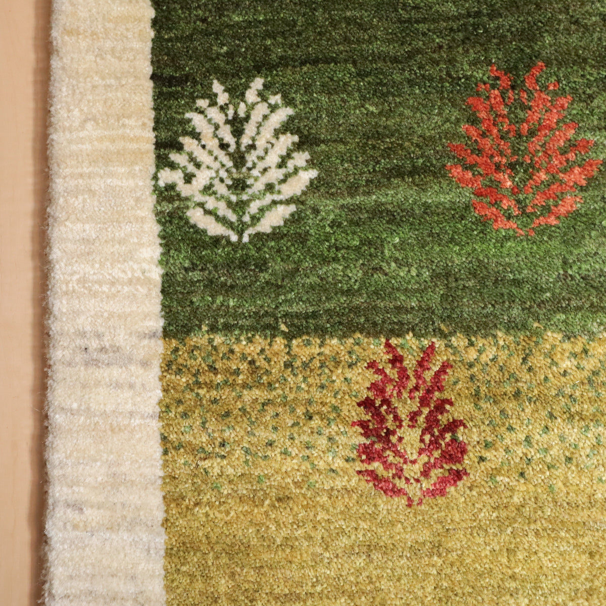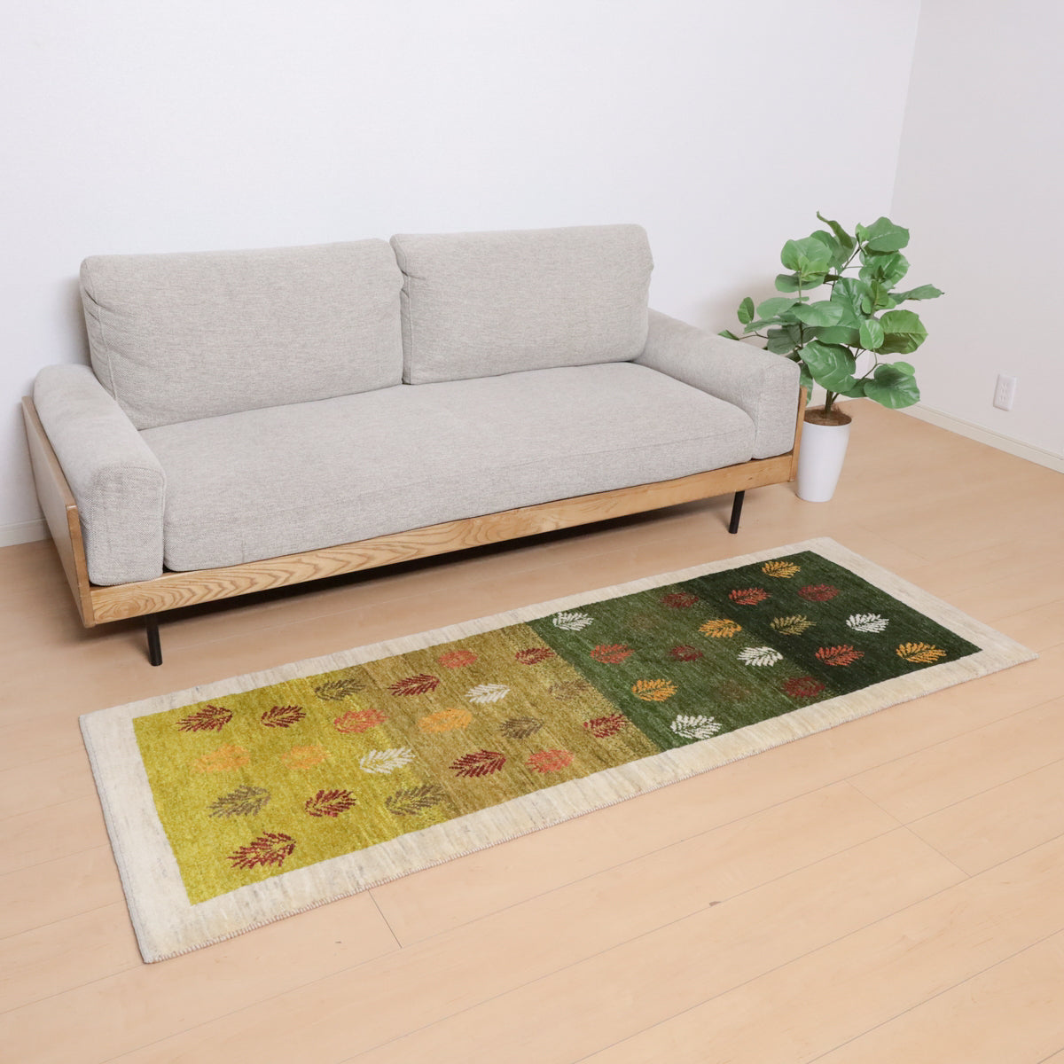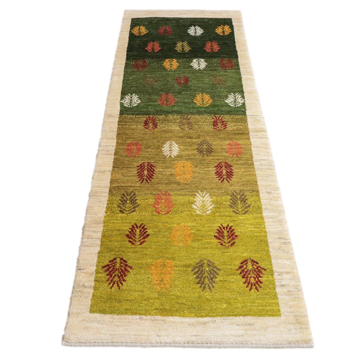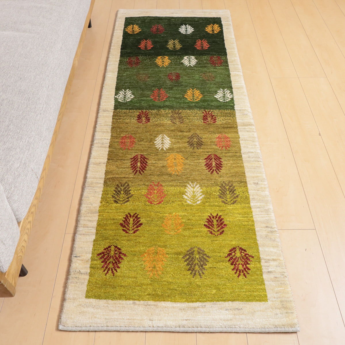 緑から黄緑へのグラデーションを基調にしたこのギャッベは、一面にカラフルな葉のモチーフが描かれた美しいデザインです。羊の毛色を生かした生成のフレームが全体を引き締め、落ち着いた雰囲気を与えています。お部屋に温かみと彩りを加え、豊かな自然を感じさせてくれる一枚です。
