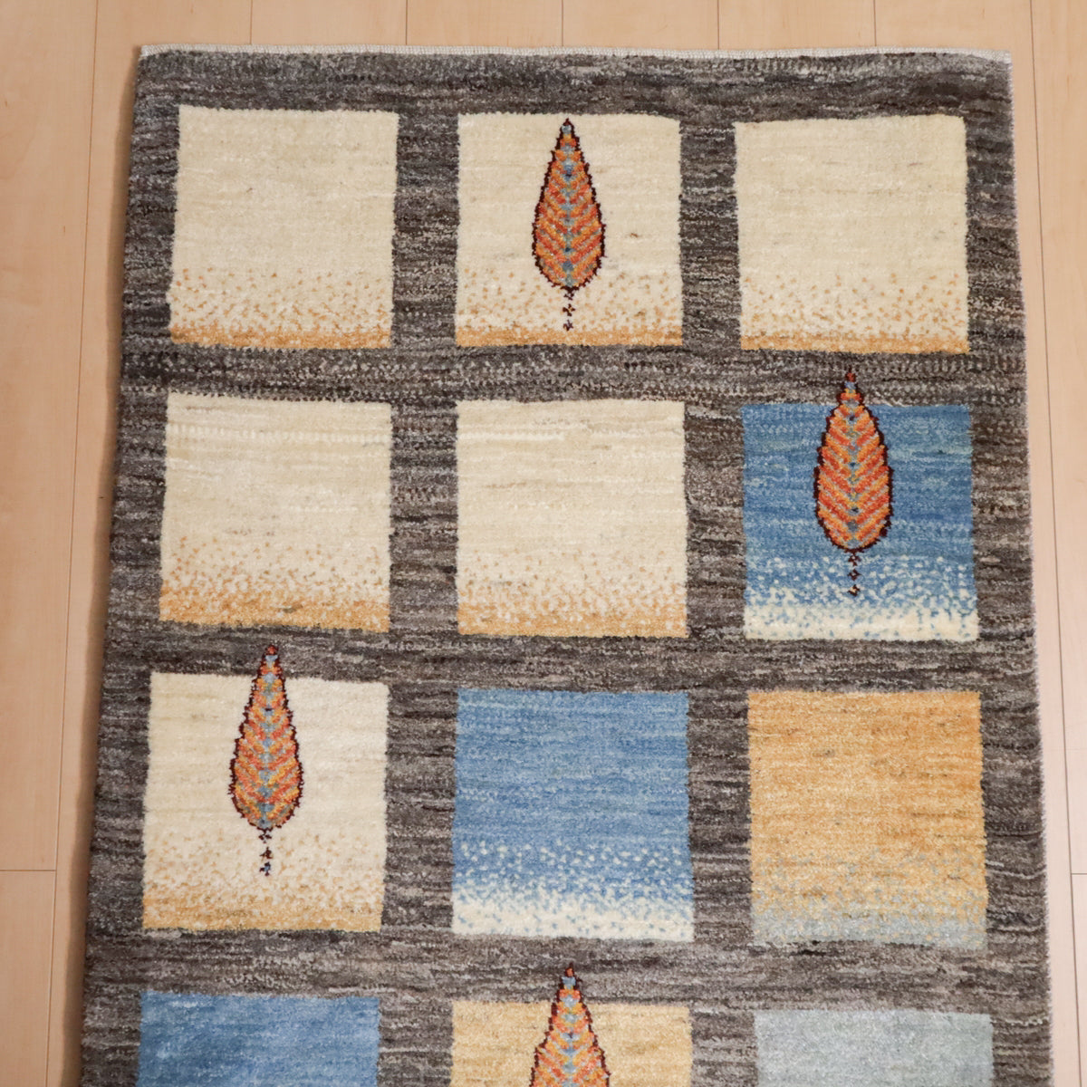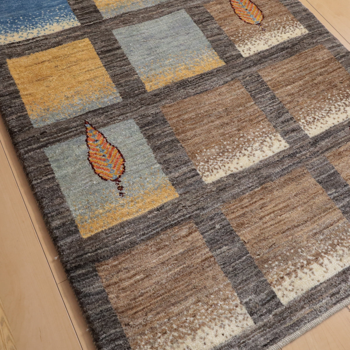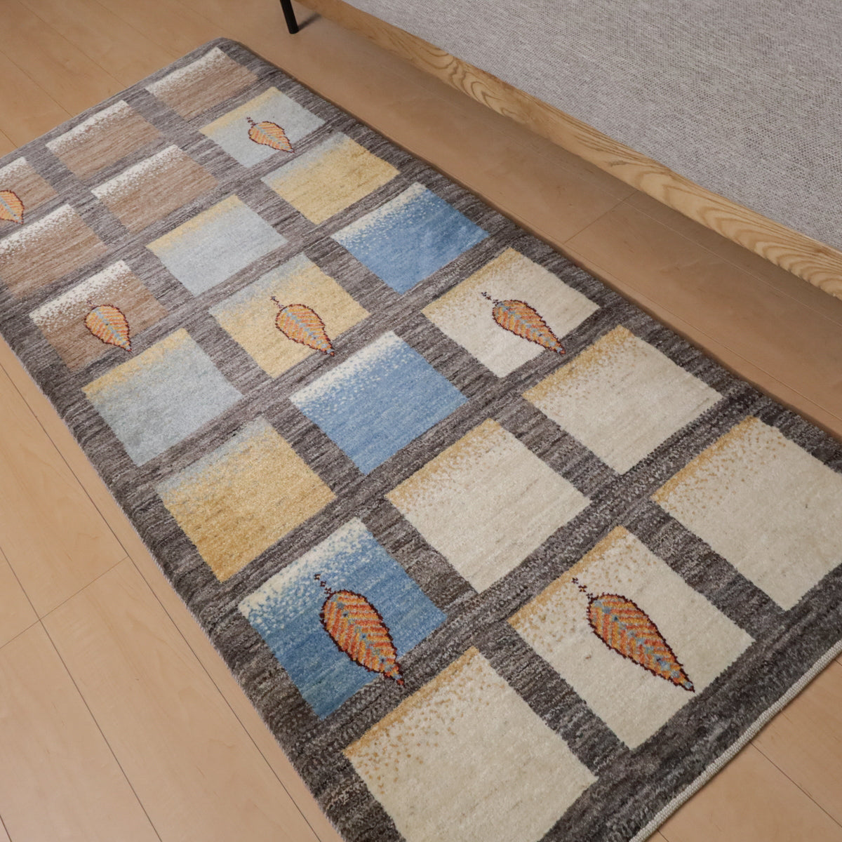 グレーの背景に茶色と生成りの四角の模様が基調となっているこのギャッベは、ところどころに配された青や黄土色のアクセントが美しい。所々ブロックに葉のモチーフが描かれており、自然の雰囲気を感じさせる和やかなデザインです。温かみのある色合いとシンプルなモチーフが、お部屋に落ち着いた印象を与えてくれる一枚です。