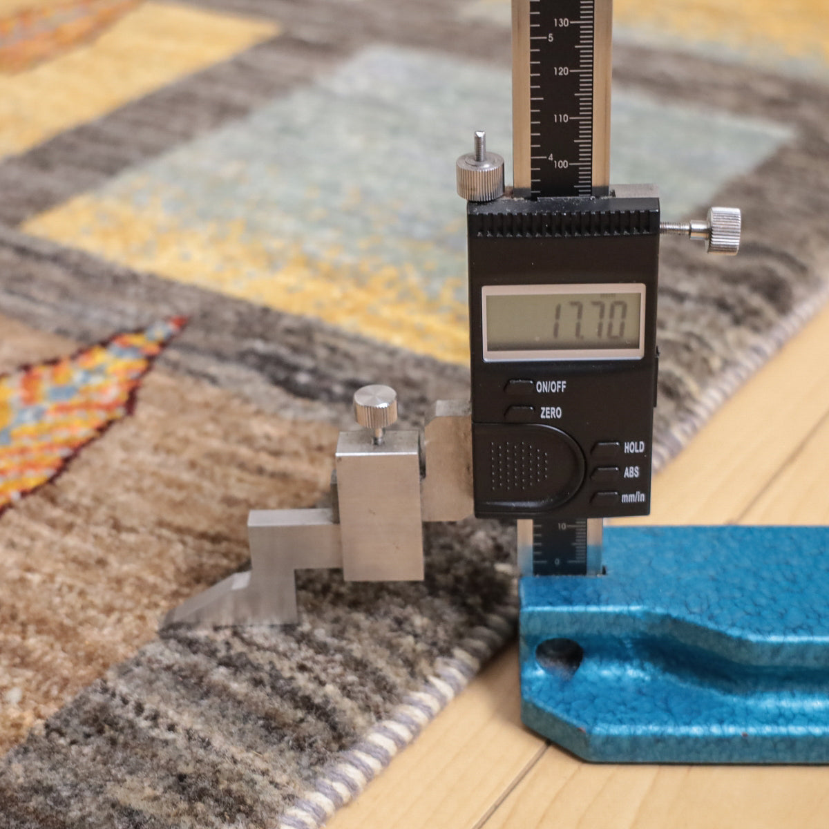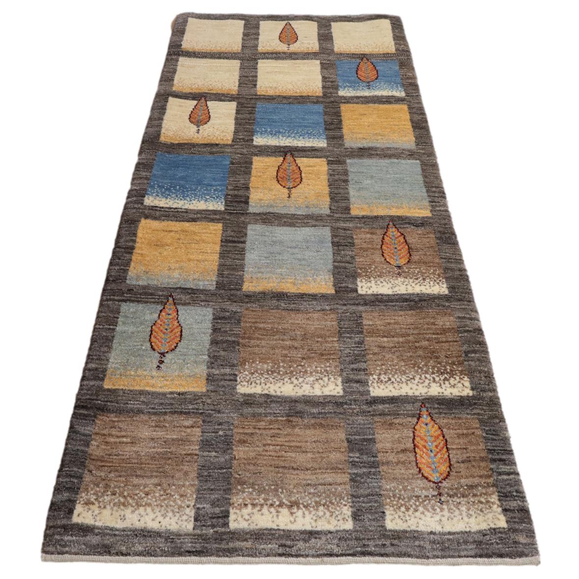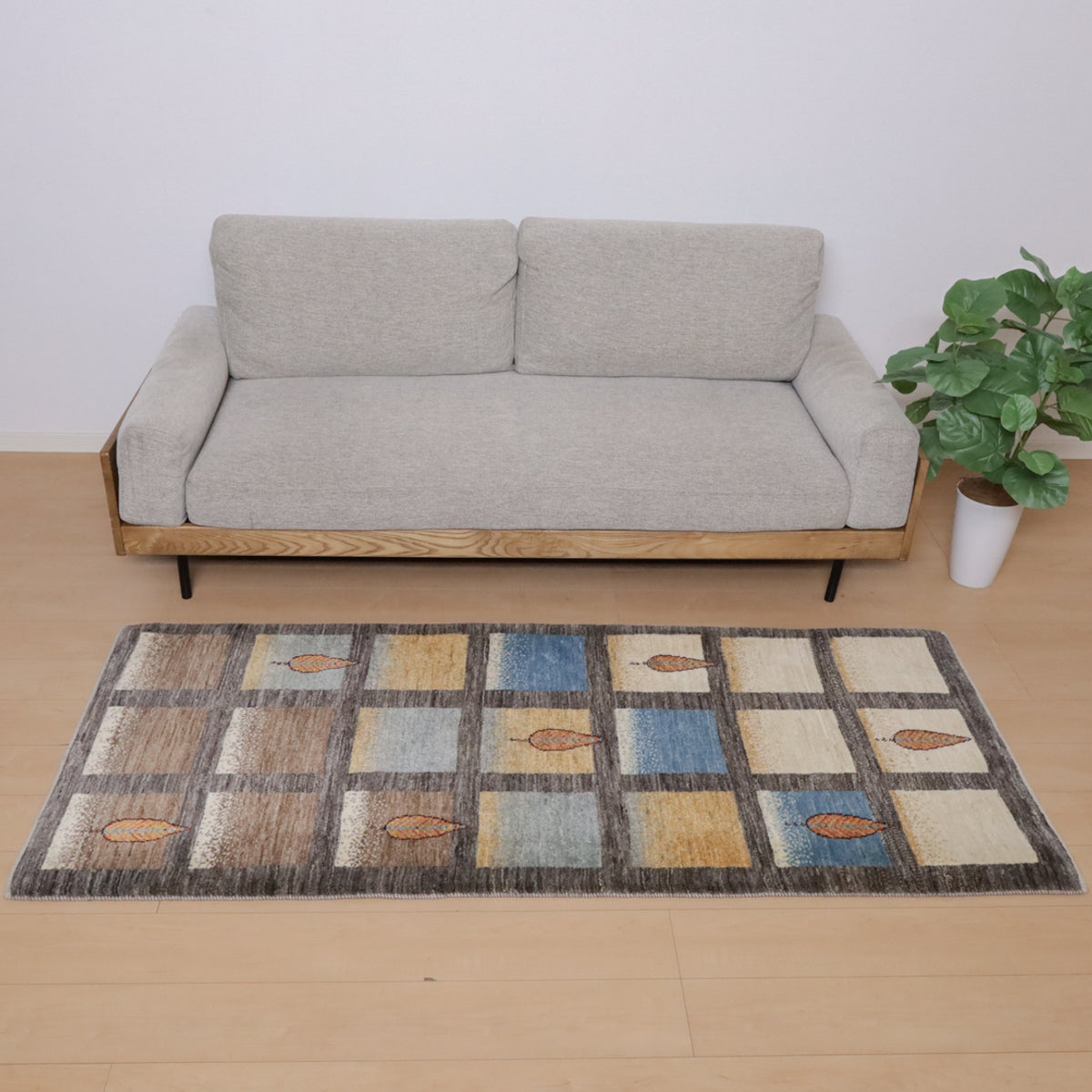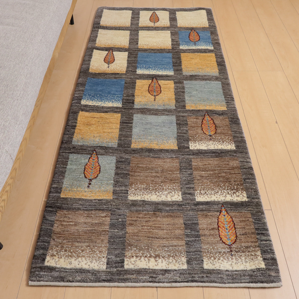 グレーの背景に茶色と生成りの四角の模様が基調となっているこのギャッベは、ところどころに配された青や黄土色のアクセントが美しい。所々ブロックに葉のモチーフが描かれており、自然の雰囲気を感じさせる和やかなデザインです。温かみのある色合いとシンプルなモチーフが、お部屋に落ち着いた印象を与えてくれる一枚です。