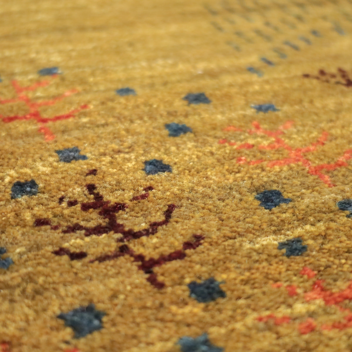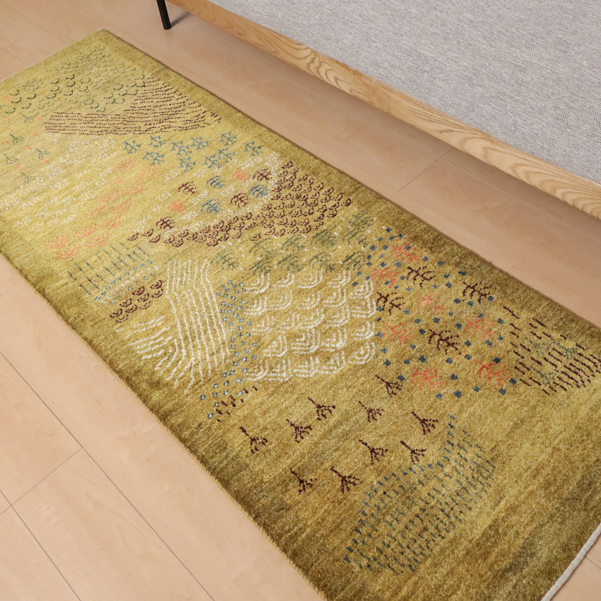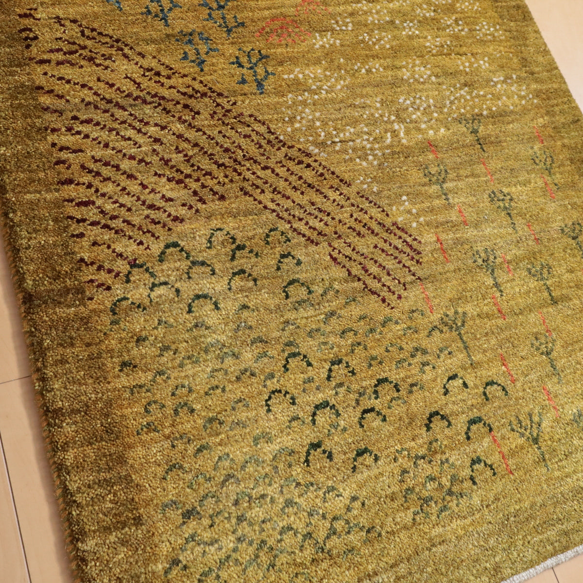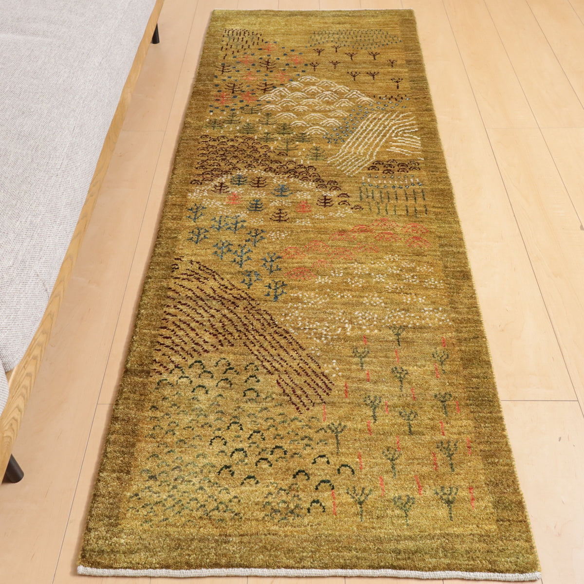 黄土色を基調にしたこのギャッベは、一面に茶色や珊瑚色のモチーフが繊細に描かれた個性的なデザイン。手織りの高い技術が感じられます。落ち着いた色味ながら華やかさがあり、自然の豊かさを感じさせてくれる一枚です。