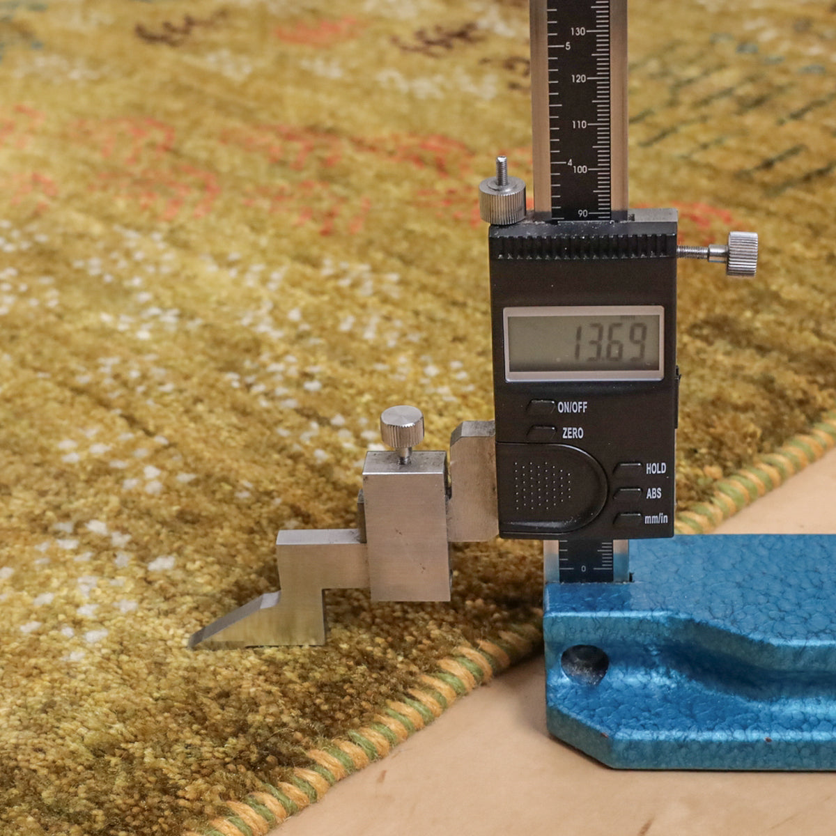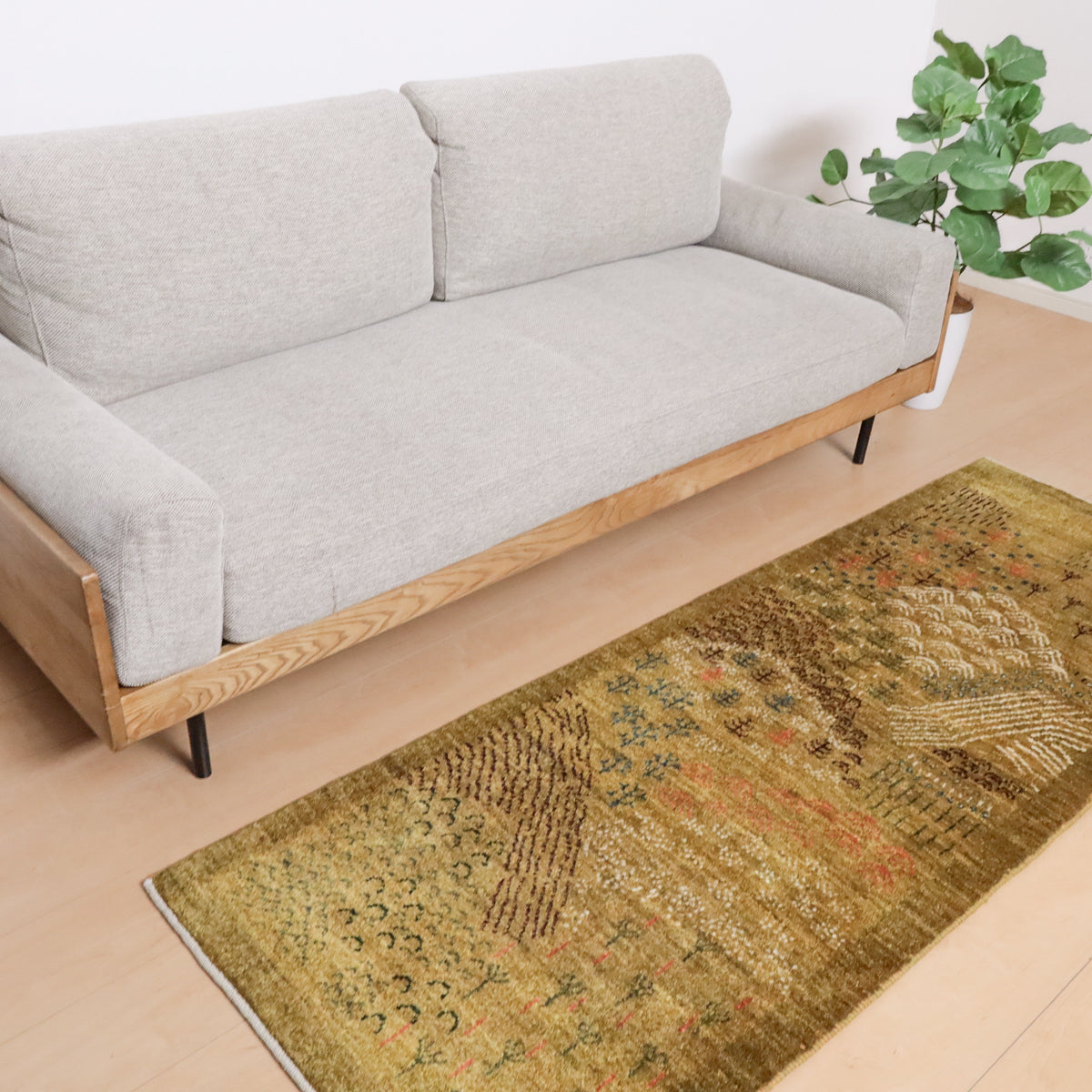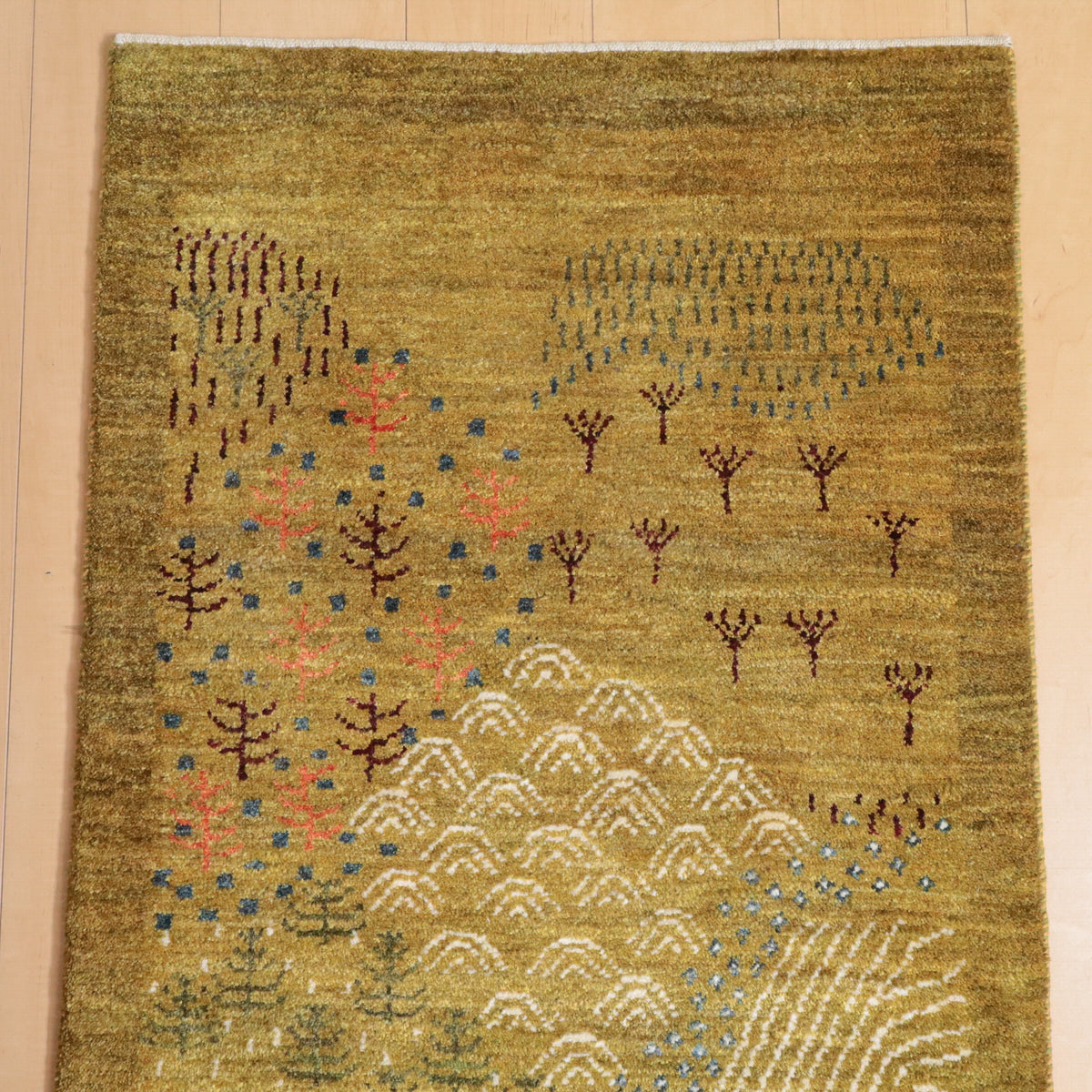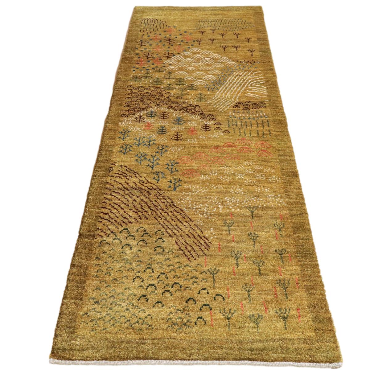 黄土色を基調にしたこのギャッベは、一面に茶色や珊瑚色のモチーフが繊細に描かれた個性的なデザイン。手織りの高い技術が感じられます。落ち着いた色味ながら華やかさがあり、自然の豊かさを感じさせてくれる一枚です。